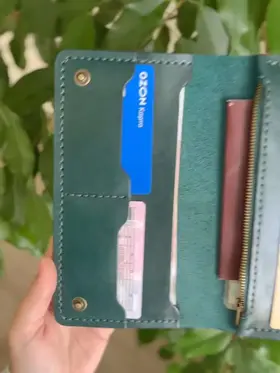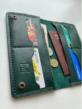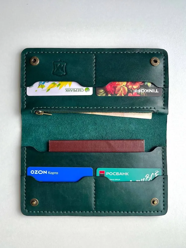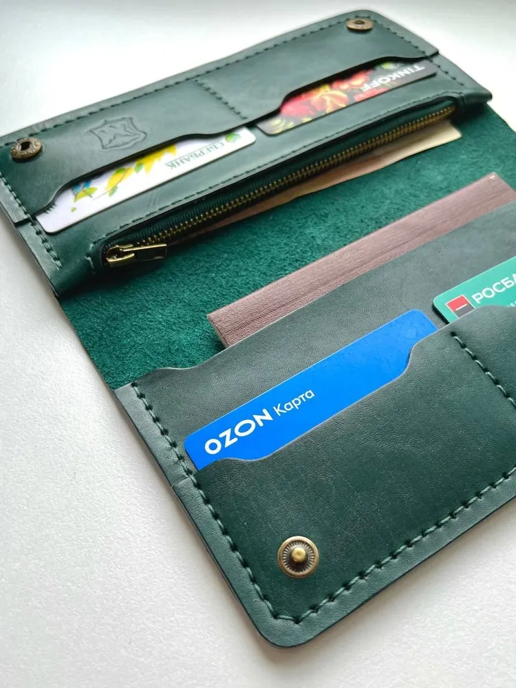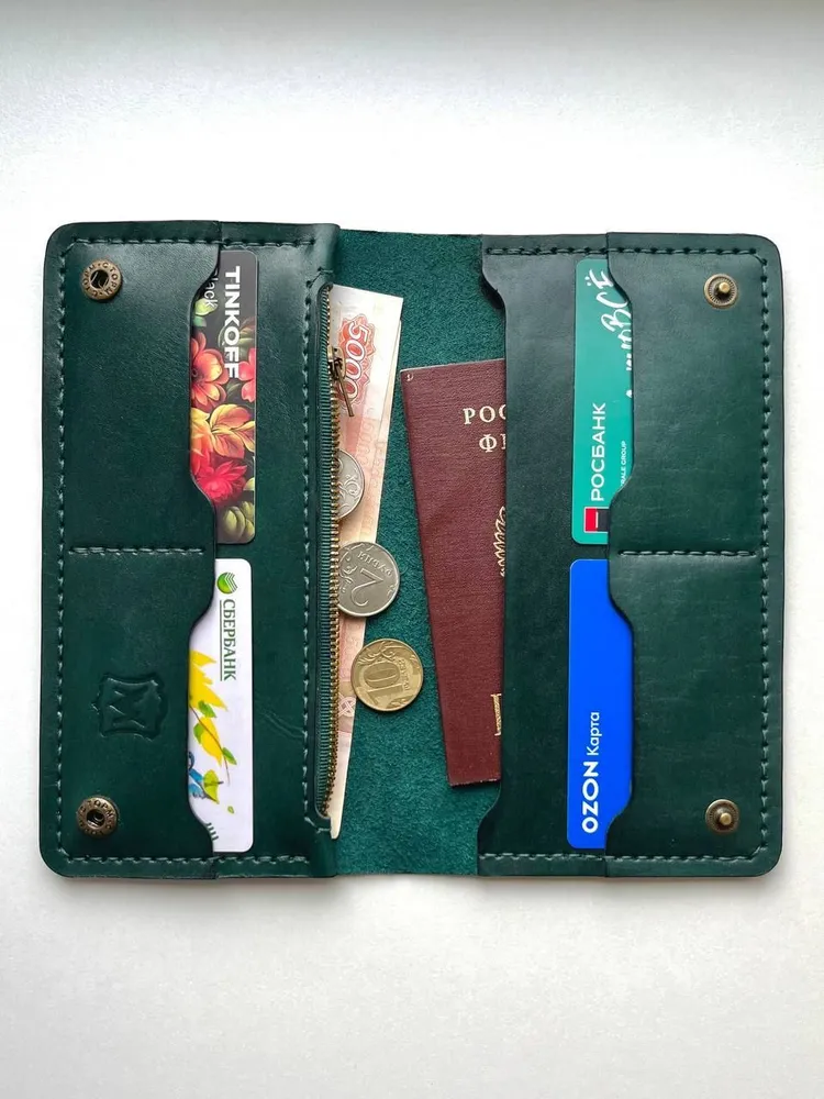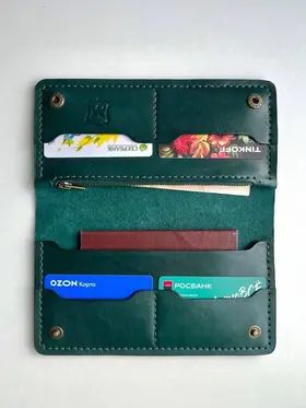 кошелёк ручной работы из натуральной кожи Российское производство 1 Позволяет разместить все необходимые документы, такие как: паспорт, стс и др. 2 Отдел для купюр в развернутом виде 3 Отдел для мелочи с молнией 4 Отделения для карточек, позволяющие разместить до 3 шт. в каждом 1 Выполнен из натуральной кожи 2 Прошит ручным швом вощеной нитью высокой прочности 3 Обработан высококачественной химией итальянского производства. Снаружи покрыт воском. 4. Установлена качественная фурнитура Отличный стильный аксессуар
