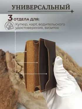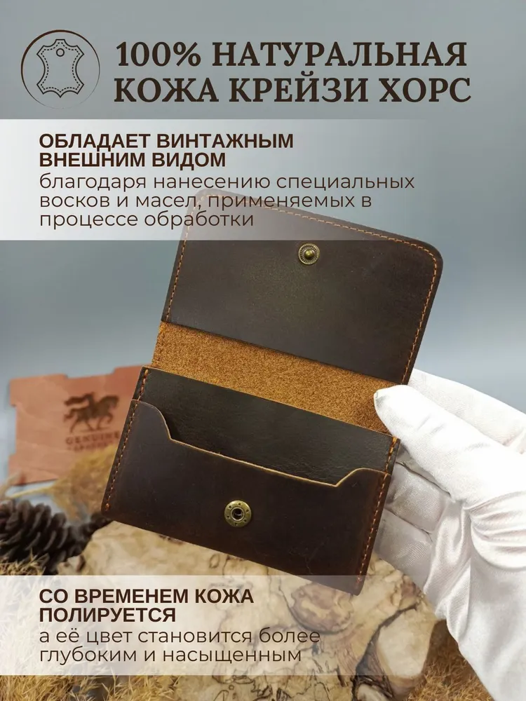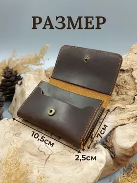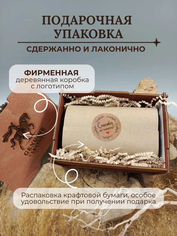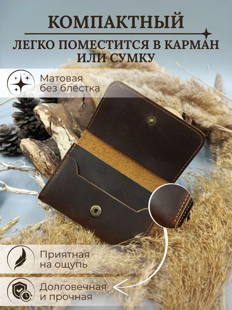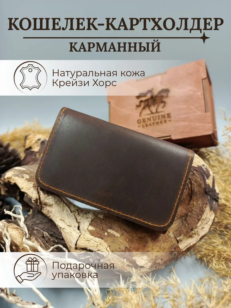 Кошелек, который подойдет каждому Кошелек унисекс из 100% натуральной кожи Crazy Horse подходит как для мужчин, так и для женщин. Он компактный, удобно помещается в карманах и сумках, а жёсткие стенки защищают от сминания. Укреплённая фурнитура гарантирует долговечность аксессуара. Ваш идеальный спутник Наше портмоне идеально хранит наличные, карты и визитки, не занимает много места и всегда под рукой — отличный выбор для ценителей стиля и функциональности Визитница и кошелек в одном Картхолдер сочетает функции визитницы и бумажника, идеальное решение для современного человека. Выполнен из качественных материалов, что делает его не только полезным, но и долговечным решением для хранения кредитных карт и визиток. Идеальный подарок Каждый кошелек упакован в красивую деревянную коробку с крафтовой бумагой и защитой из воздушно-пупырчатой пленки. Это отличный подарок на день рождения или юбилей. Не упустите шанс порадовать себя или близких стильным аксессуаром! Выбирайте наш кожаный кошелек унисекс из натуральной кожи Crazy Horse и наслаждайтесь качеством!