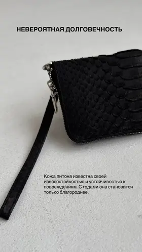 Прекрасный подарок для Вас и Ваших близких! -100% натуральная кожа питона -4 отдела для купюр/документов -16 отделений для карт -1 отдел для мелочи -размер 20/10 -сьемный ремешок в комплекте -фурнитура серебро (качественная, корейская) Кожа питона считается одной из самых долговечных(уступает лишь коже крокодила), поэтому ваш кошелек прослужит вам долгие годы и будет радовать каждый день.
