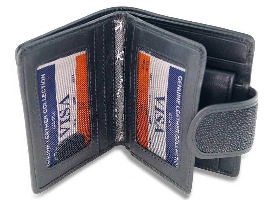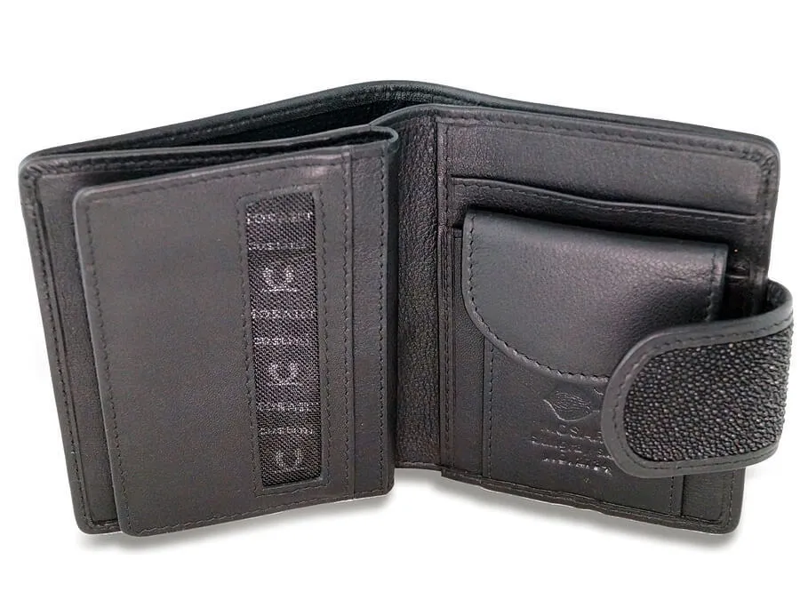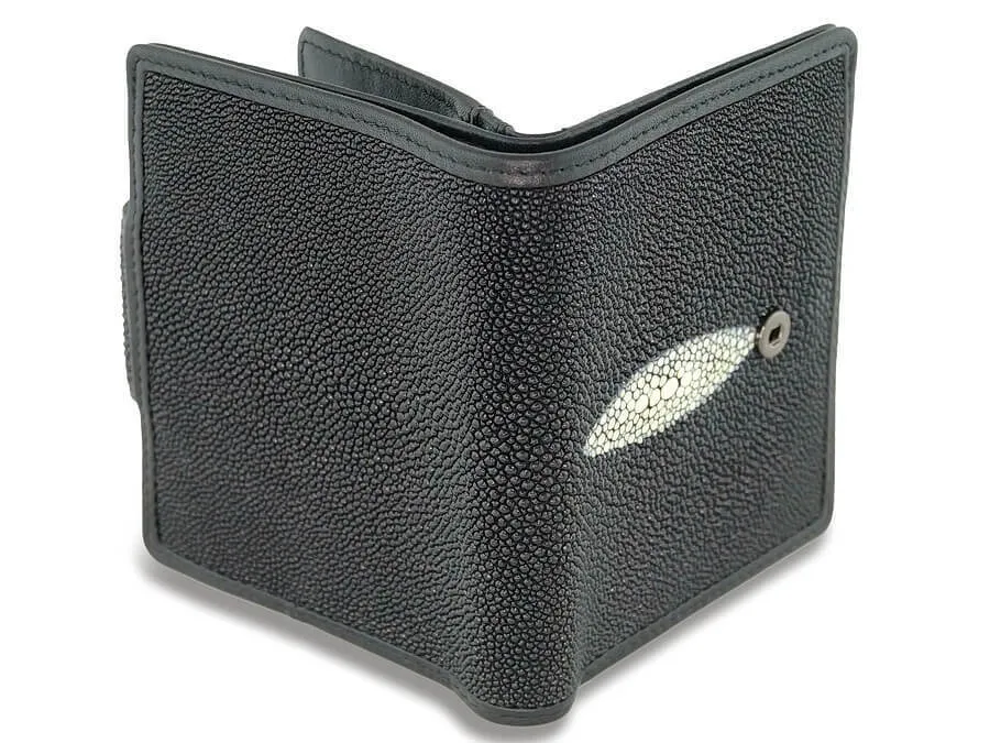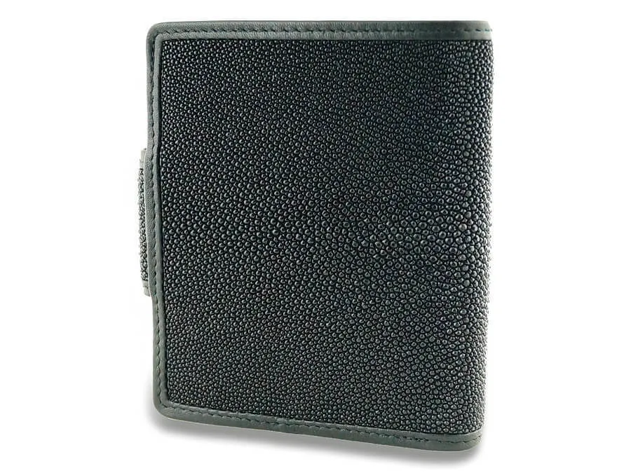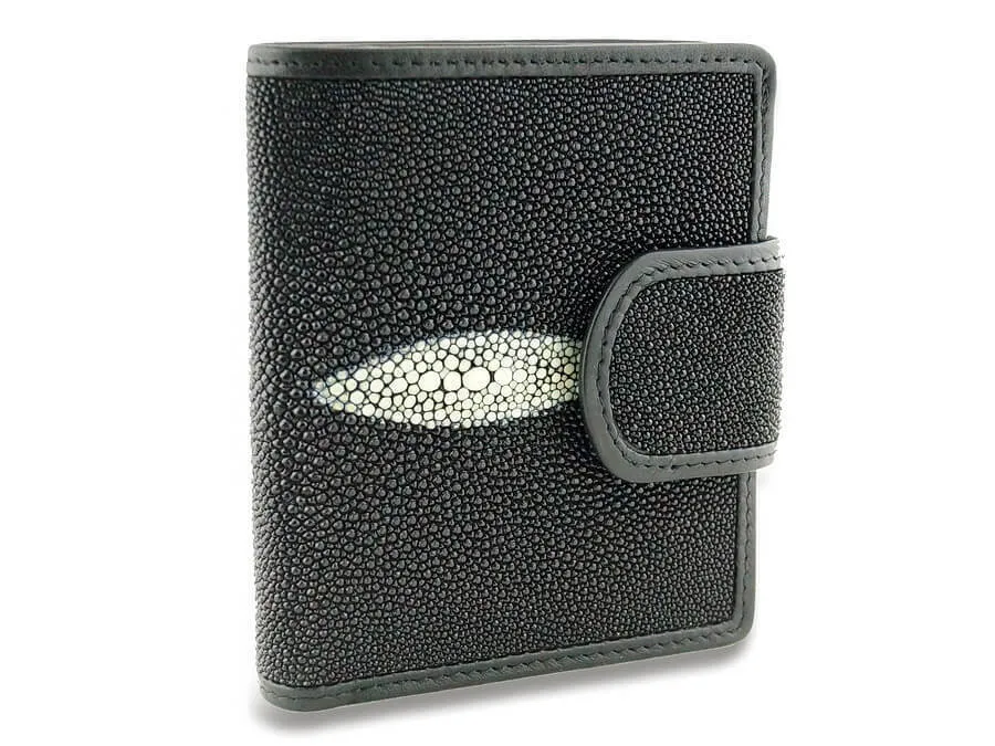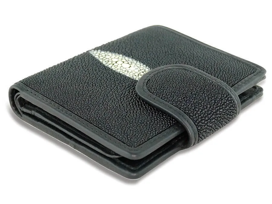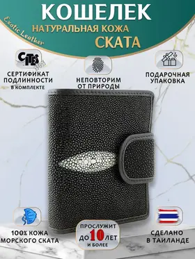 Необычный кошелек из натуральной кожи ската с внутренней монетницей и на хлястике выполнен с безупречным качеством из кожи высочайшего сорта как снаружи, так и внутри. Кожа морского ската позволит кошельку прослужить своим хозяину или хозяйке до 10 лет и более. Изнутри используется нежная телячья кожа. - 2 отделения для купюр - 5 карманов для пластиковых карт - 4 скрытых кармана - 2 кармашка с прозрачным окошком - монетница на кнопке Страна производства: Таиланд