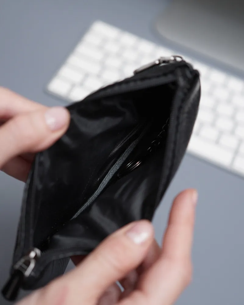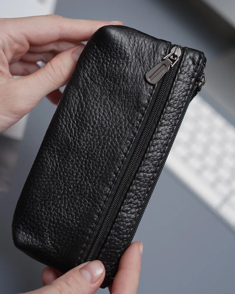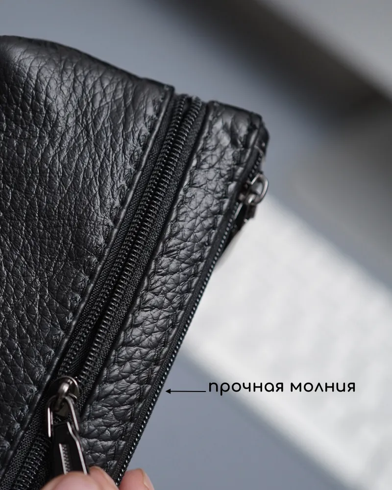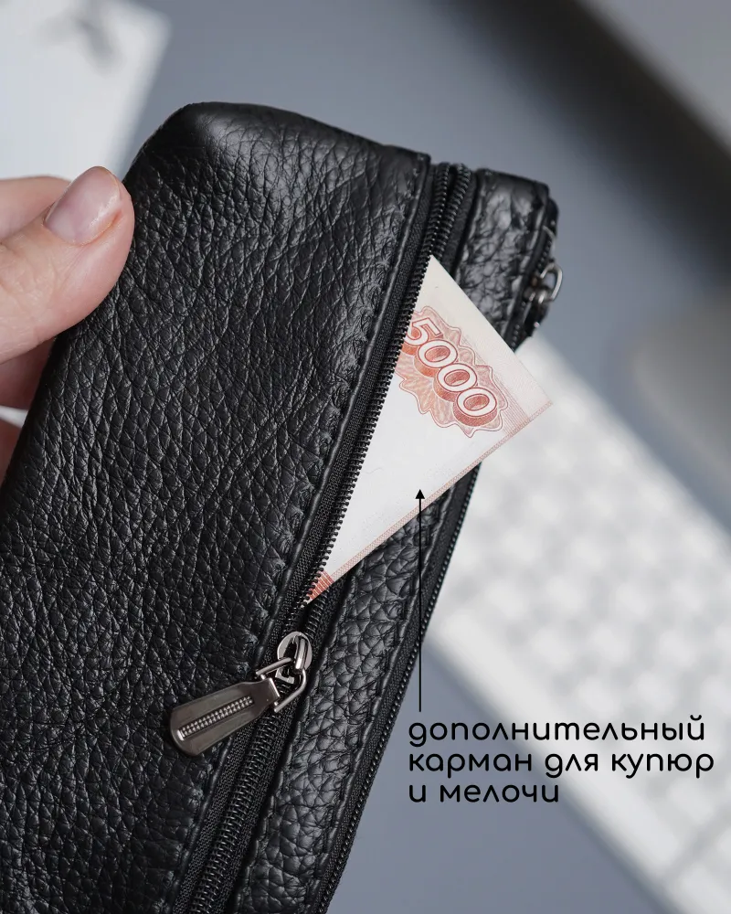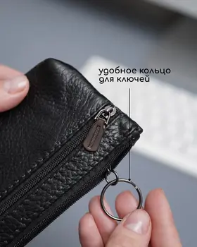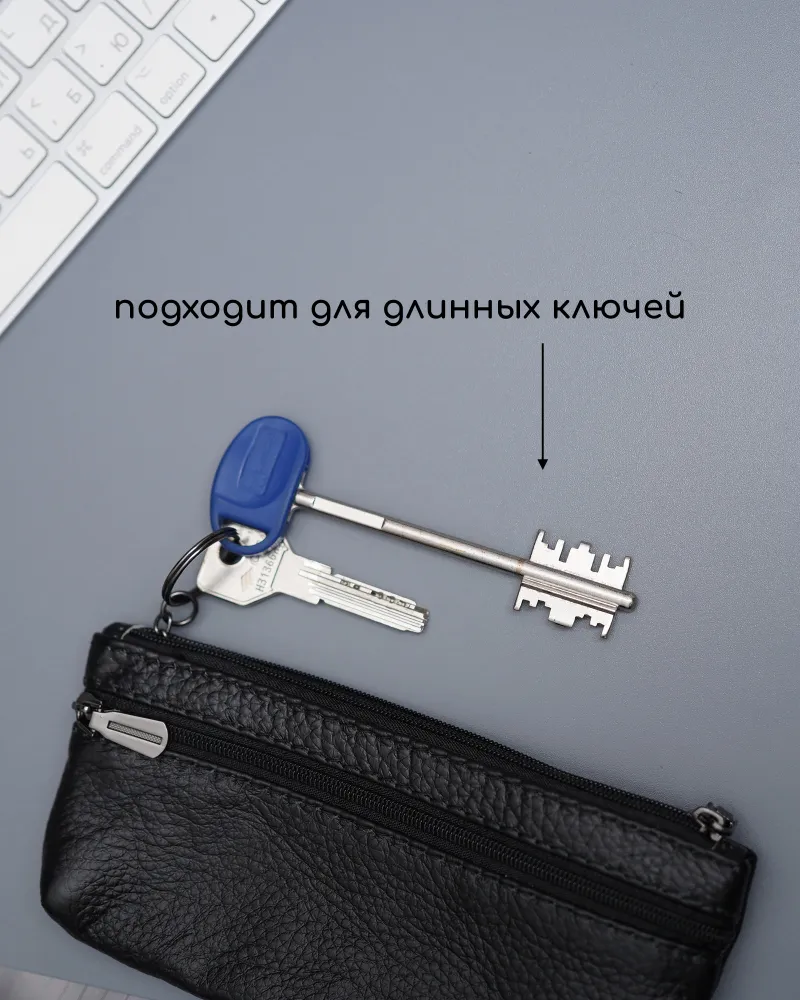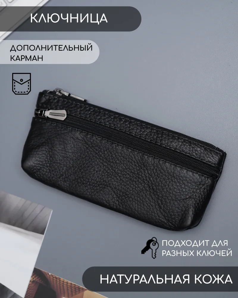 Кошелек ключница Кошелек ключница карманная из натуральной кожи черная — ключница-кошелек с двумя молниями для длинных ключей Кошелек ключница — универсальный аксессуар, который сочетает функции хранения ключей, карт и наличных. Практичная ключница кошелек выполнена из натуральной кожи, которая отличается прочностью, износостойкостью и сохраняет аккуратный внешний вид при ежедневном использовании. Классический черный цвет делает модель универсальной. кошелек-ключница Функциональный кошелек-ключница оснащен двумя молниями, что позволяет удобно организовать пространство. Внутри можно разместить ключи, банковские карты и наличные. Такой формат делает аксессуар удобным как кошелек с ключницей и компактный органайзер. Модель рассчитана как ключница для длинных ключей — вмещает ключи длиной до 16 см. Размер 17×8,1×1 см обеспечивает оптимальное сочетание вместительности и компактности. Ключница карманная кожаная Ключница карманная кожаная оснащена кольцом для крепления ключей, что позволяет надежно фиксировать их внутри. Это делает аксессуар удобным в использовании и предотвращает потерю ключей. Универсальная ключница карманная мужская и ключница карманная женская подходит для повседневного использования. Отличный вариант как ключница кожаная мужская или как ключница кожаная женская, благодаря лаконичному дизайну. Компактный формат позволяет носить аксессуар в кармане, сумке или рюкзаке. Такой кошелёк ключница заменяет сразу несколько аксессуаров и помогает держать все необходимое в одном месте. ПРЕИМУЩЕСТВА: • кошелек ключница — 2 в 1: хранение ключей и денег • ключница карманная кожаная — прочность и долговечность • 2 отделения на молнии — удобная организация • подходит как ключница для длинных ключей до 16 см • кольцо для крепления ключей — надежная фиксация • ключница карманная мужская и женская — универсальность • натуральная кожа — премиальный внешний вид • черный цвет — классический и практичный Ключница-кошелек — это удобное решение для хранения ключей, карт и наличных в одном компактном аксессуаре каждый день.