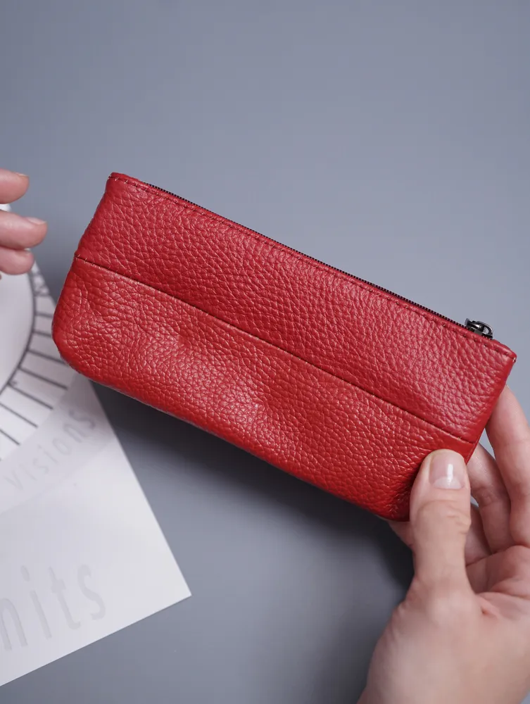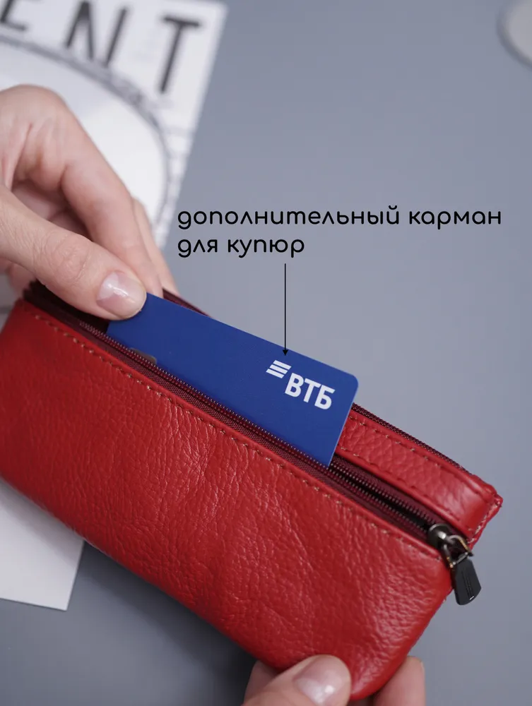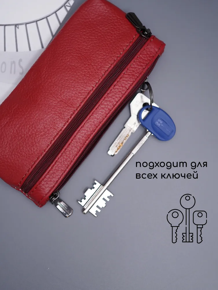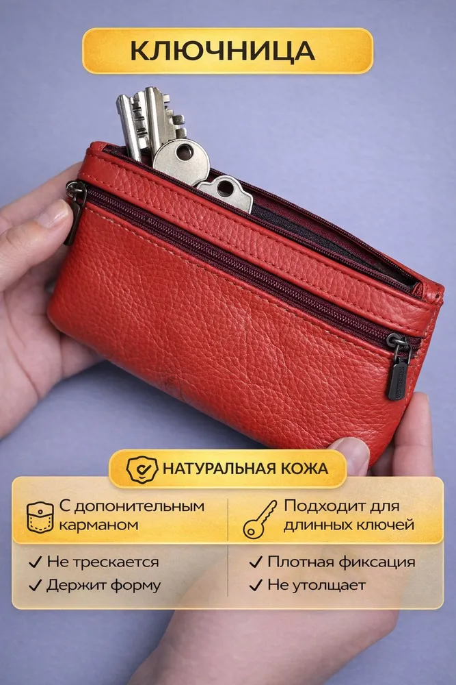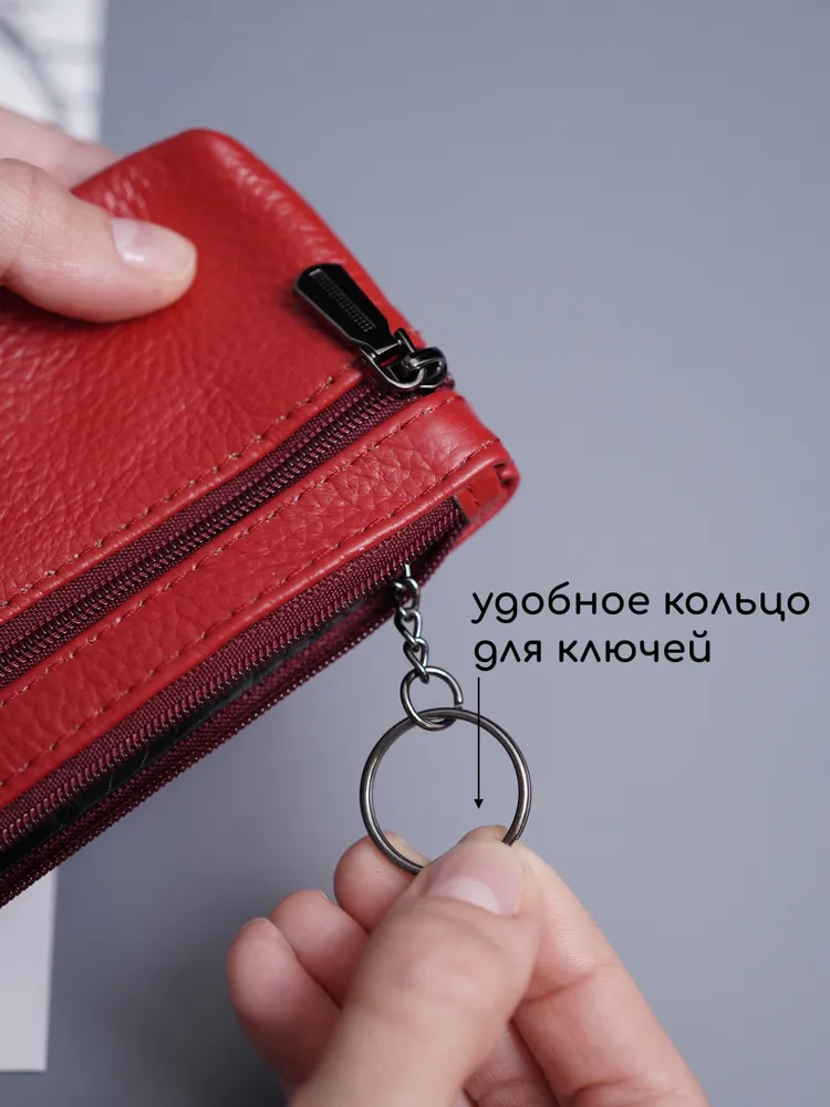 Кошелек ключница карманная Кошелек ключница карманная из натуральной кожи красная — ключница-кошелек с двумя молниями для длинных ключей Кошелек ключница — удобный и функциональный аксессуар 2 в 1 для хранения ключей, карт и наличных. Практичная ключница кошелек выполнена из натуральной кожи, которая отличается прочностью, мягкостью и устойчивостью к износу. Красный цвет — яркий и выразительный акцент, который подчеркивает индивидуальность и делает аксессуар заметным. Ключница карманная кожаная Функциональный кошелек-ключница оснащен двумя молниями, что позволяет удобно распределить содержимое. В одном отделении можно хранить ключи, во втором — карты, деньги и мелкие предметы. Такой формат делает модель удобной как кошелек с ключницей и компактный органайзер. Модель подходит как ключница для длинных ключей — вмещает ключи длиной до 16 см. Размер 17×8,1×1 см обеспечивает баланс между вместительностью и компактностью. Ключница карманная кожаная оснащена кольцом для крепления ключей, что позволяет надежно фиксировать их внутри и быстро находить. Такой кошелёк ключница защищает содержимое и упрощает использование в повседневной жизни. Универсальная ключница карманная мужская и ключница карманная женская подойдет для любого пользователя. Можно использовать как ключница кожаная мужская или как ключница кожаная женская благодаря лаконичному дизайну. Ключница карманная Компактный формат позволяет носить аксессуар в кармане, сумке или рюкзаке. Такая ключница-кошелек заменяет несколько аксессуаров и помогает держать все необходимое в одном месте. ПРЕИМУЩЕСТВА: • кошелек ключница — формат 2 в 1 • ключница карманная кожаная — прочность и долговечность • 2 отделения на молнии — удобная организация • подходит как ключница для длинных ключей до 16 см • кольцо для крепления ключей — надежная фиксация • ключница карманная мужская и женская — универсальность • натуральная кожа — премиальный материал • красный цвет — яркий и стильный акцент Кошелек-ключница — это удобное и стильное решение для хранения ключей, карт и наличных в одном компактном аксессуаре каждый день.