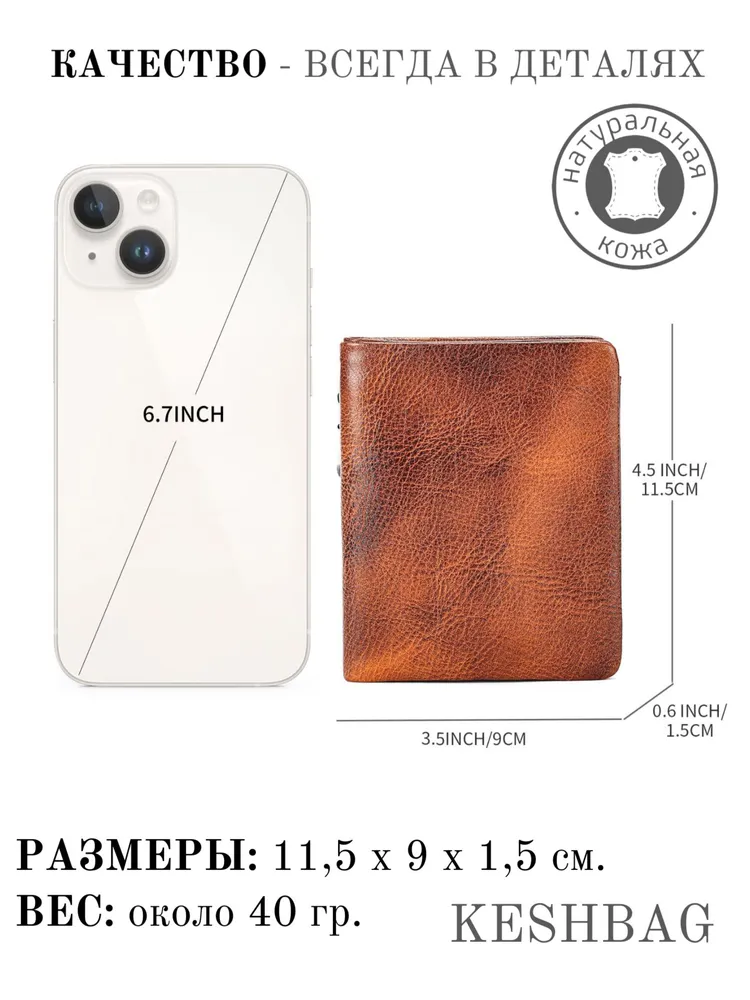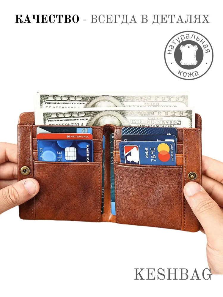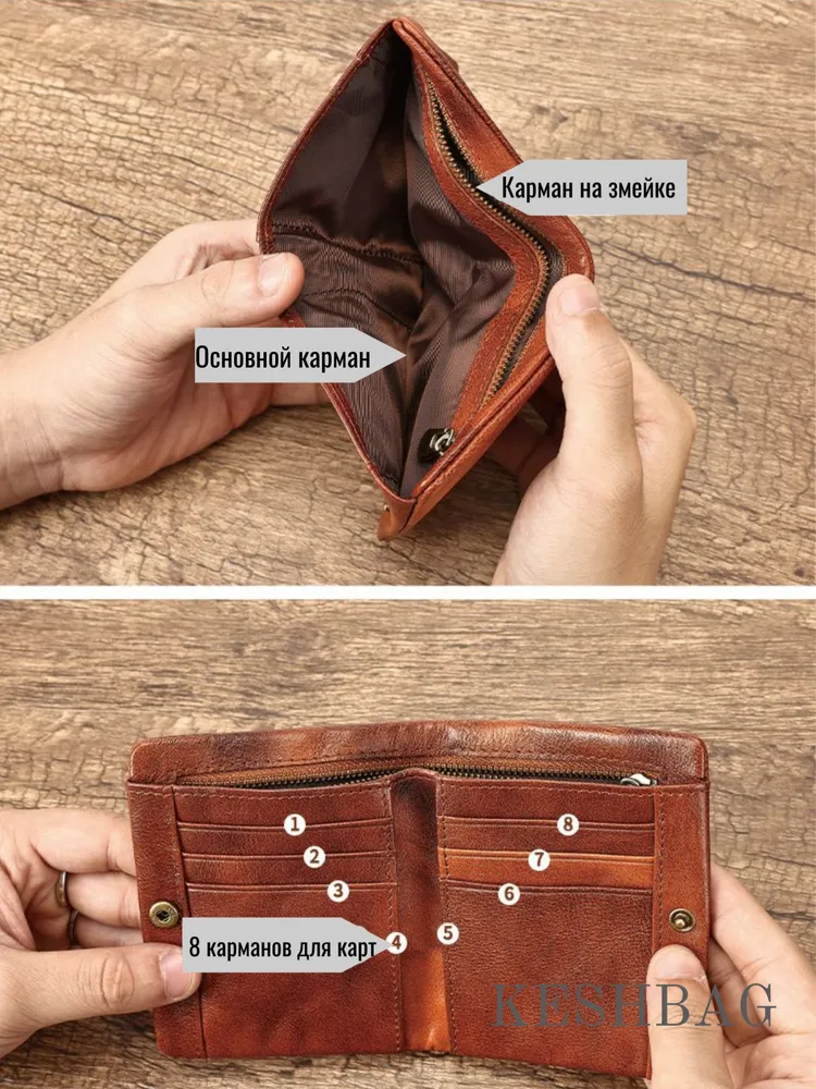 Почувствуйте наследие классики и безупречное качество в каждой детали! Наше портмоне — это больше, чем аксессуар. Это надежный спутник на каждый день, воплощение стиля и практичности, изготовленный из исключительной воловьей кожи премиум-класса. Его благородный рыже-коричневый оттенок и ретро-дизайн говорят о вашем безупречном вкусе. Почему этот кошелек станет вашим любимым аксессуаром? Наследие качества: Изготовлен из прочной воловьей кожи. С годами она становится только лучше, приобретая уникальный шарм и индивидуальность, гарантируя долгие годы службы. Идеальная организация: Вмещает всё необходимое без лишнего объема. Два защищенных молниями отделения для монет и купюр, а также продуманные слоты для банковских карт, водительского удостоверения, визиток и документов. Универсальная компактность: Идеальные размеры и легкий вес делают его невероятно удобным для ношения в кармане брюк, барсетке, сумке-слинг или любой другой сумке. Он всегда под рукой и не обременяет. Уникальная комбинированная застежка: Обеспечивает надежную защиту содержимого и максимальное удобство в использовании одним движением. Роскошный подарок: Кошелек поставляется в стильной крафтовой коробке, готовый стать идеальным презентом на день рождения, 23 февраля, Новый год или просто без повода для близкого человека. Детали: Материал: Натуральная воловья кожа премиум-качества Цвет: Рыже-коричневый (ретро) Размеры: 11,5 х 9 х 1,5 см Вес: ~80 г Комплектация: Кошелек, подарочная крафтовая коробка Выбирайте аксессуар, который подчеркнет ваш статус и позаботится о порядке ваших вещей. Это не просто покупка — это инвестиция в качество и стиль.