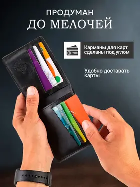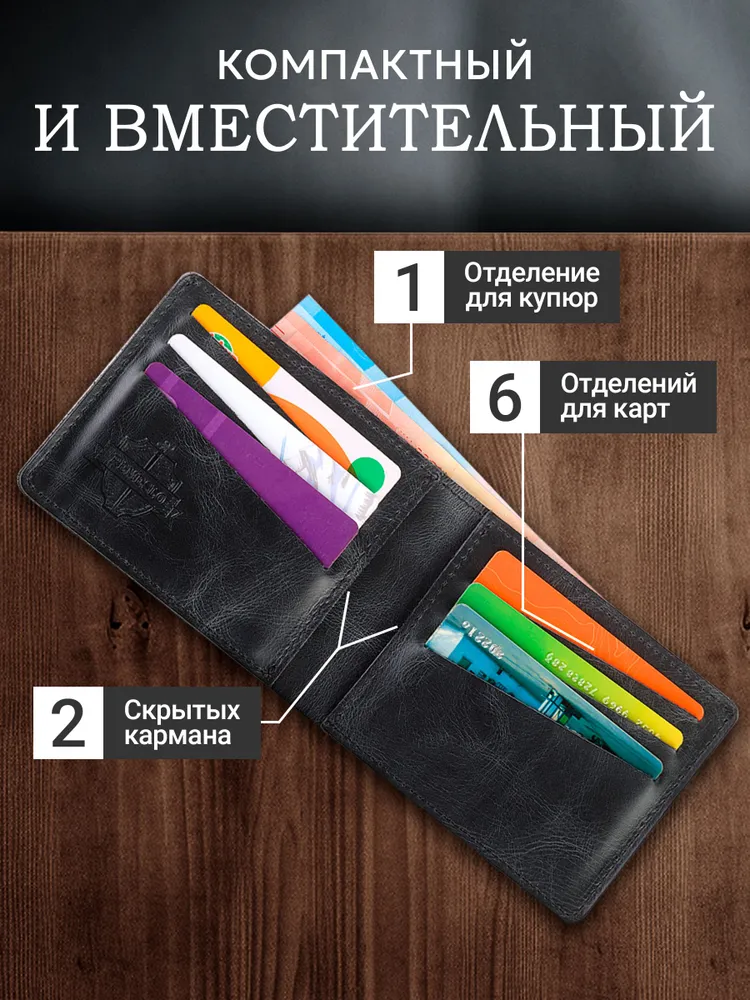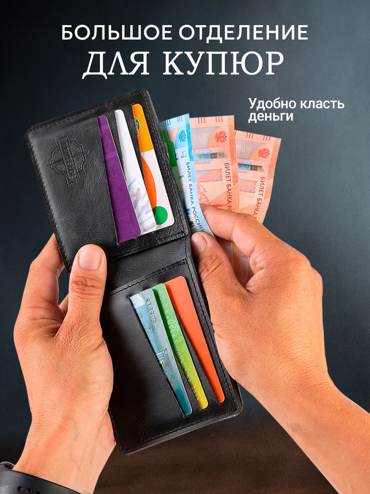Стильный мужской кожаный кошелек из качественных материалов – идеальный выбор для современного мужчины, ценящего организованность и удобство в повседневной жизни. Этот практичный аксессуар обеспечивает надежное хранение денег и банковских карт, гарантируя их сохранность и долговечность. Бумажник мужской кожаный станет отличным презентом для парня, мужа, папы, коллеги, друга или любимого человека. Мужской бифолд из натуральной кожи предлагает продуманную организацию пространства: удобное отделение для банкнот, 6 слотов для банковских карт и скрытые карманы для денег или карт. Компактные размеры кошелька позволяют легко разместить его в кармане куртки или брюк, что делает портмоне идеальным спутником для активного образа жизни. Классический дизайн этого мужского кошелька из кожи универсально сочетается с различными стилями одежды – от строгого делового костюма до повседневных образов.