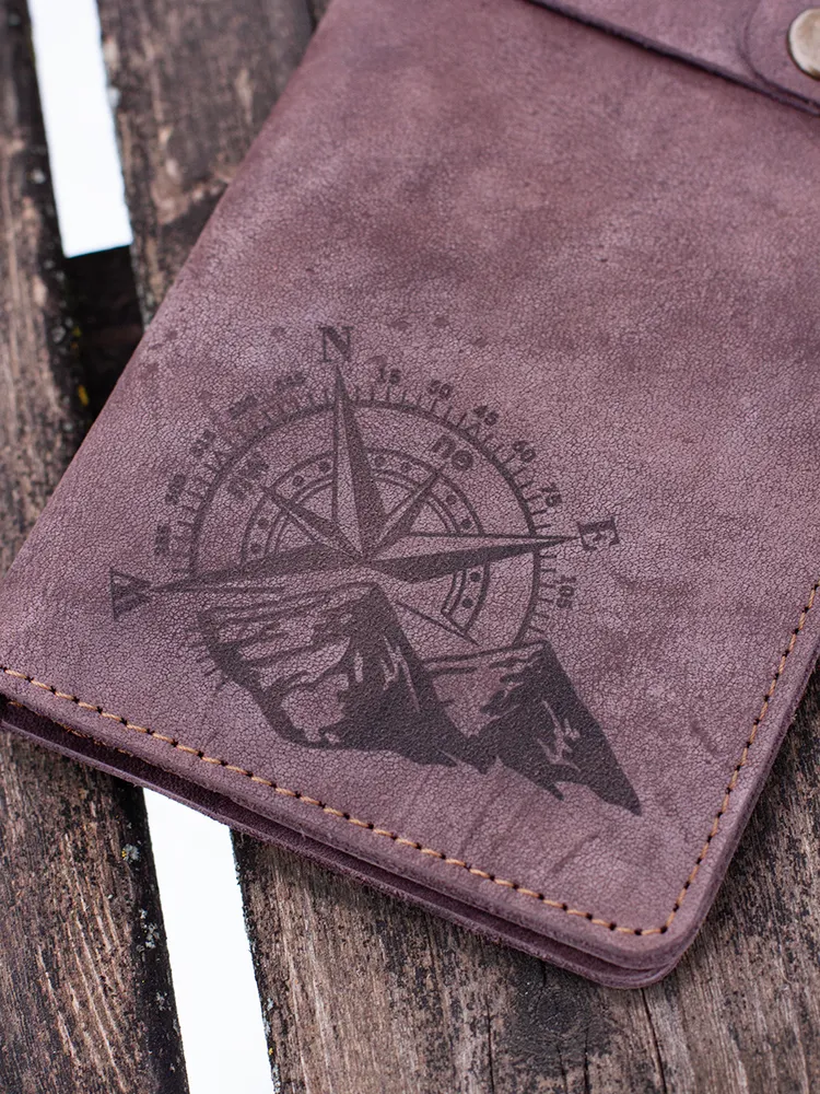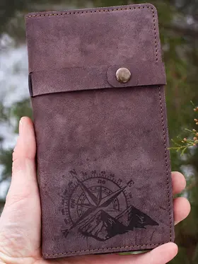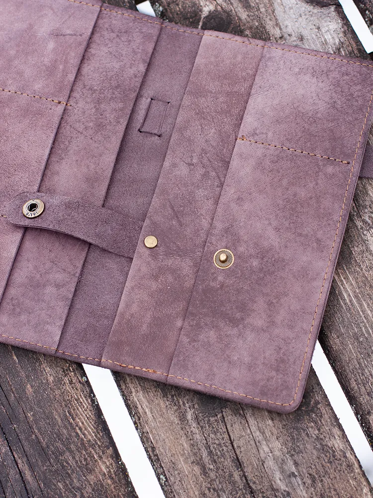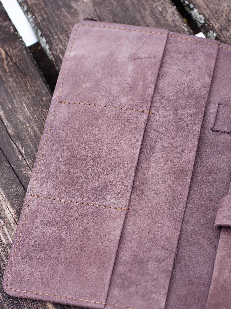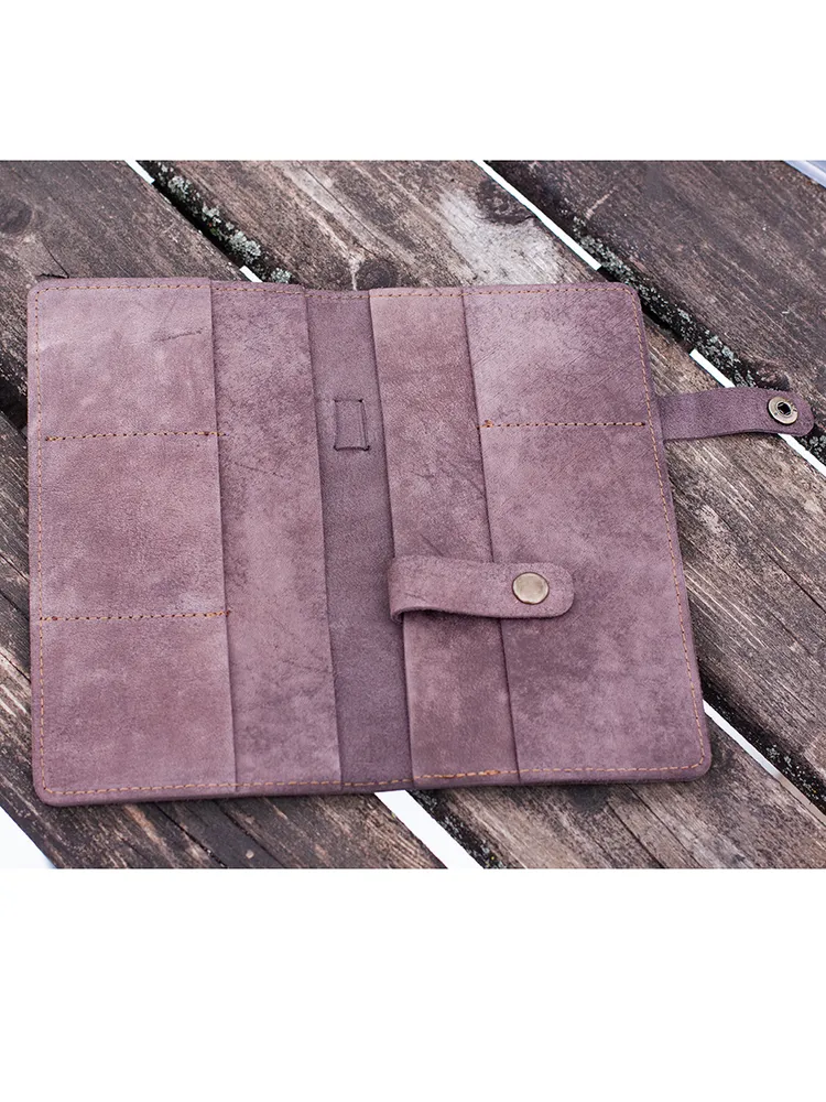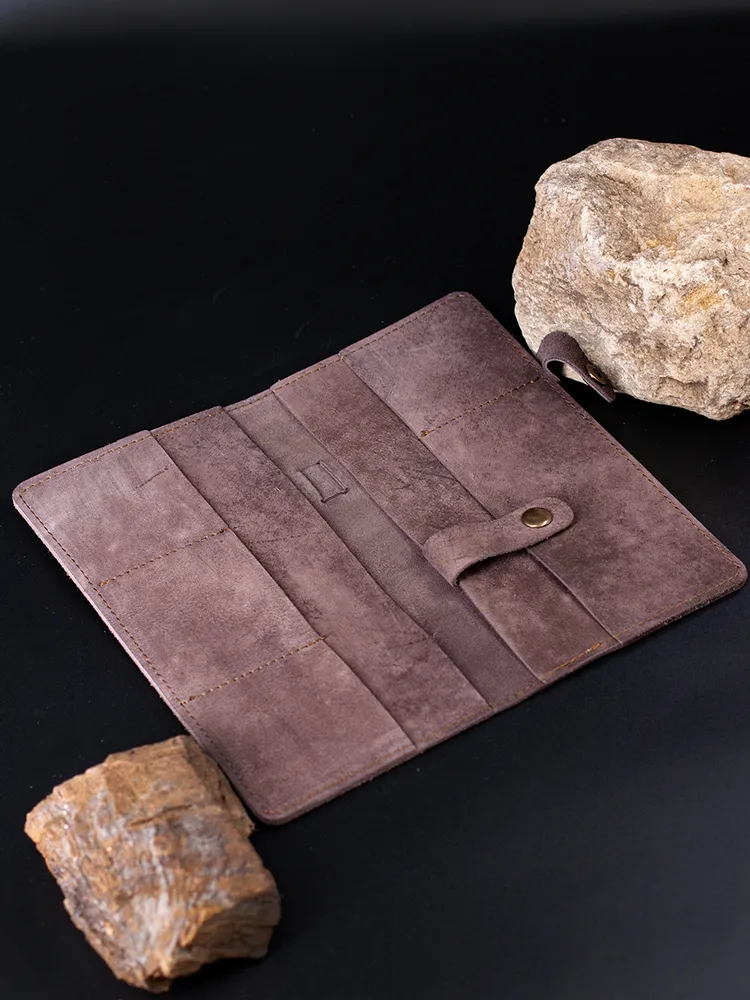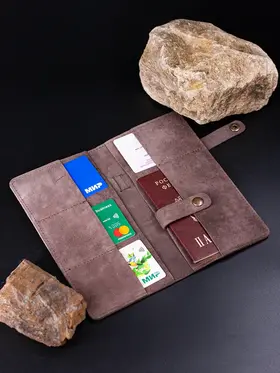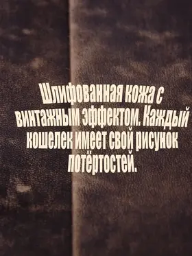 Кошелек из натуральной кожи в стиле винтаж без кнопок. Вмещает в себя два отделения под купюры, отделение под мелочь, три больших отделения под карты. Так же, есть возможность носить в кошельке паспорт и автодокументы.