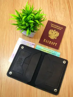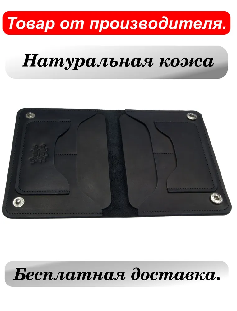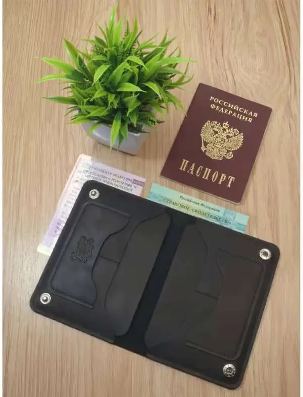 Кошелек / Портмоне мужской & женский кожаный Элегантный кошелек-портмоне выполнен из прочной натуральной кожи, которая обеспечивает долговечность и приятную текстуру. Глубокий черный оттенок идеально сочетается с любым стилем одежды, подчеркивая сдержанность и стиль. Компактные размеры позволяют удобно хранить документы, карты и наличные без лишнего объема. Застежка на металлические кнопки гарантирует надежное закрывание и защиту содержимого от выпадения. Внутреннее пространство организовано для комфортного размещения паспорта, шестнадцати банковских карт. Конструкция позволяет использовать изделие как полноценную обложку для важных документов. Ручная авторская работа делает каждую единицу уникальной, сохраняя внимание к деталям и высокое качество исполнения. Лаконичный дизайн подойдет как мужчинам, так и женщинам, добавляя образу законченность и элегантность.