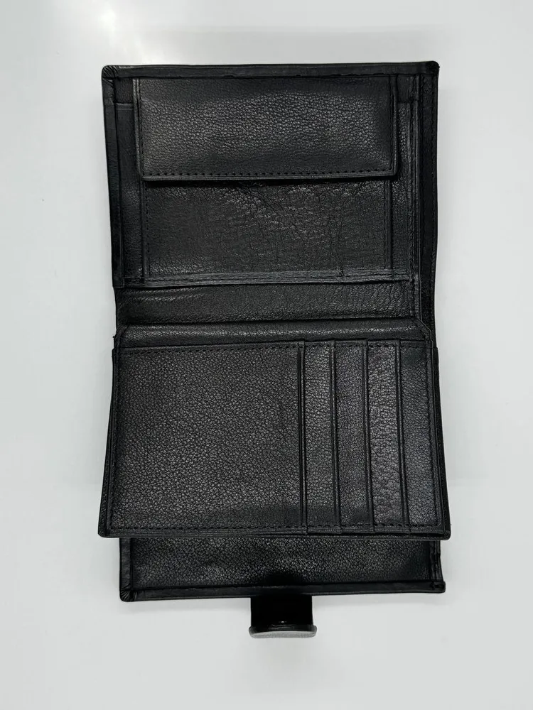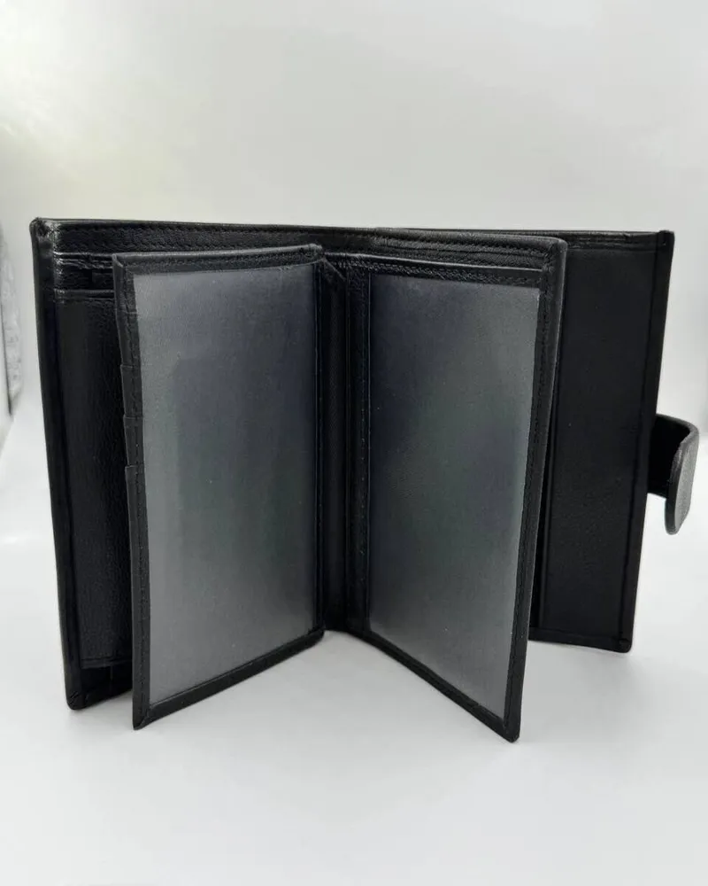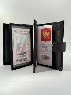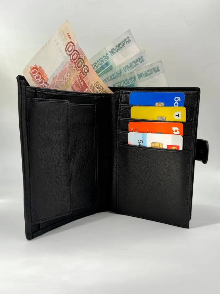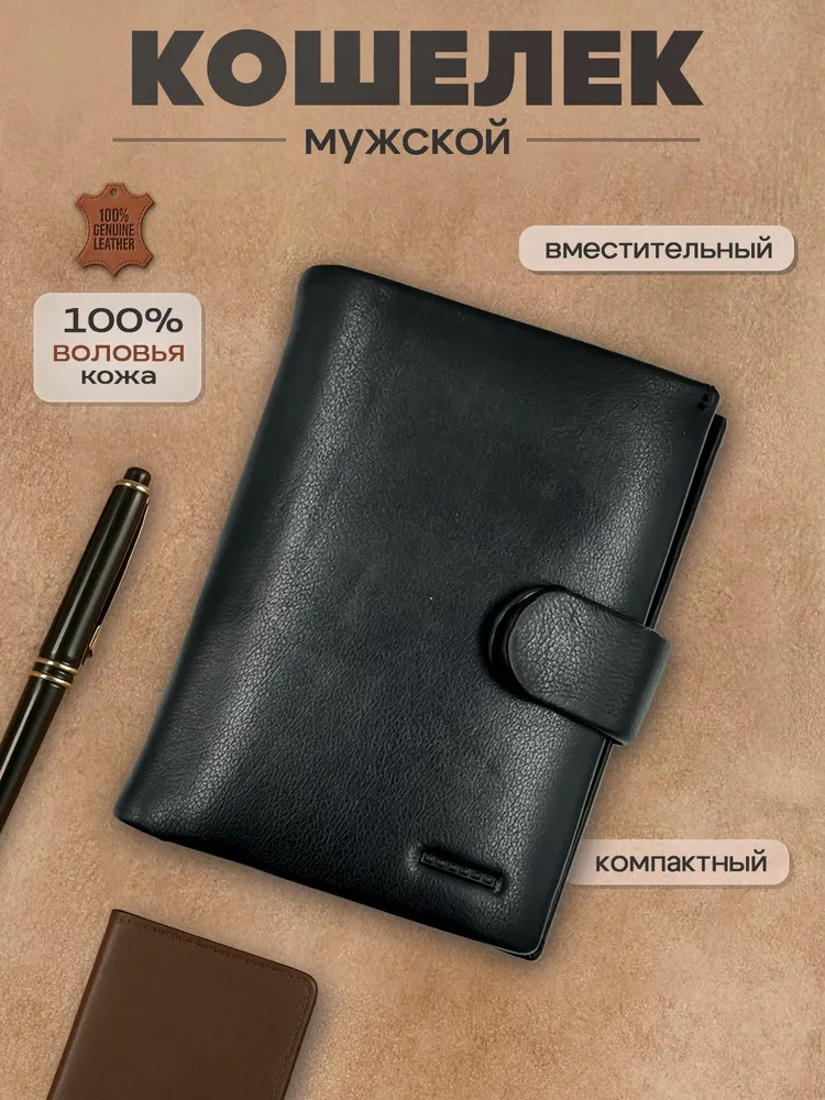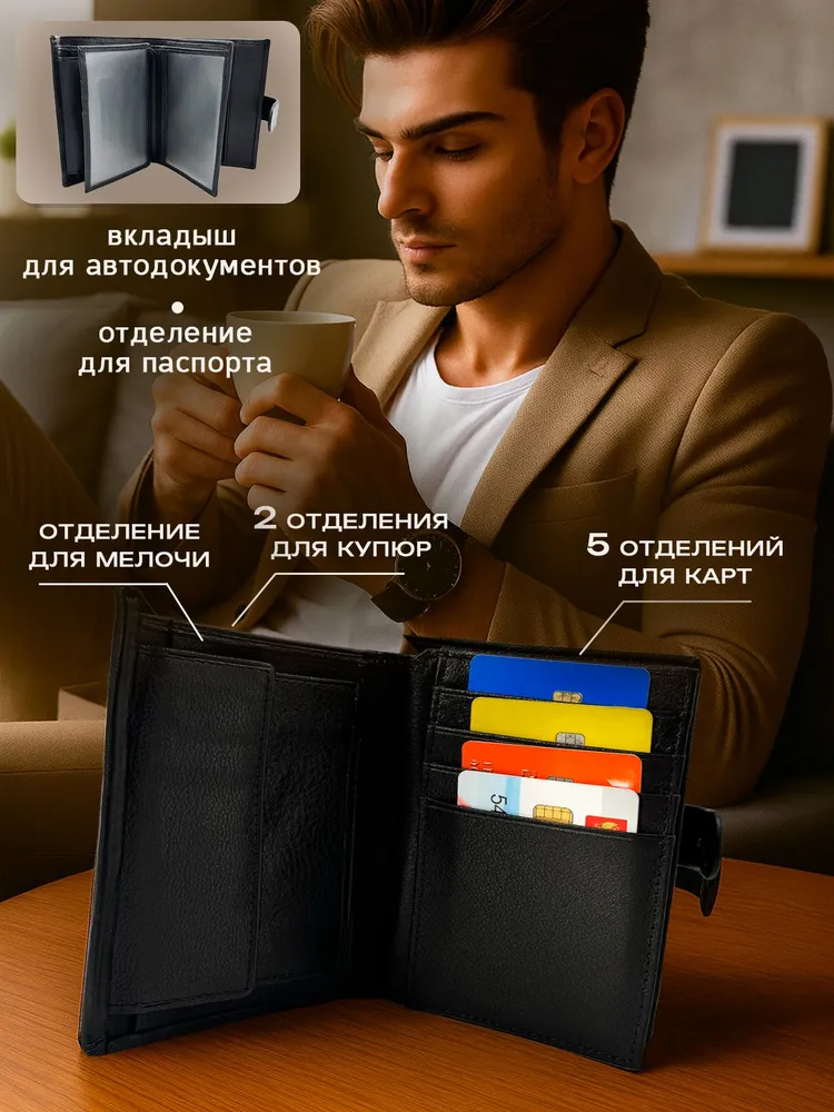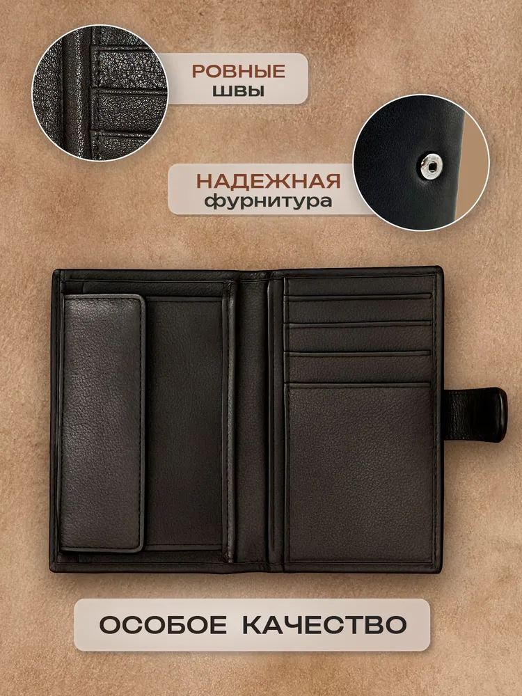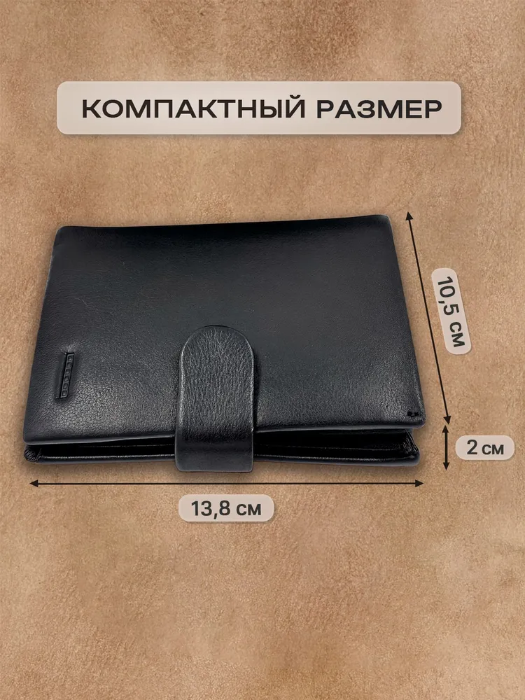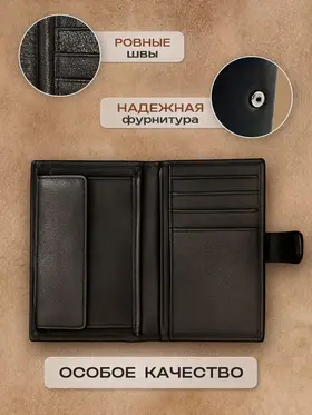 Кошелек портмоне из натуральной кожи Представляем элегантный мужской кошелек из 100% натуральной кожи — идеальный аксессуар для современного мужчины! Этот стильный портмоне сочетает в себе функциональность и изысканный дизайн. основные характеристики Изготовлен из высококачественной натуральной воловьей кожи, с естественной фактурой, что придает изделию уникальный вид и долговечность. Внимание к деталям Аккуратные швы и обработанные края обеспечивают надежную фиксацию деталей, а надежная застежка гарантирует сохранность содержимого. Внутренняя организация Портмоне включает 5 отделений для карт, отделение для паспорта, специальное отделение для автодокументов, отделение для мелочи и 2 отделения для купюр (одно на молнии, второе открытое). Пластиковый вкладыш для документов обеспечивает дополнительную защиту. Насыщенный благородный цвет Элегантный черный оттенок подходит к любому стилю одежды, подчеркивая ваш индивидуальный вкус. Элегантность на каждый день Кошелек мужской станет незаменимым помощником в повседневной жизни, гармонично сочетая удобство и стиль.