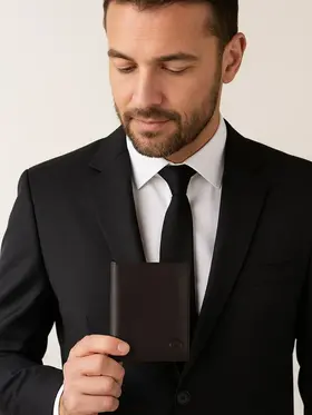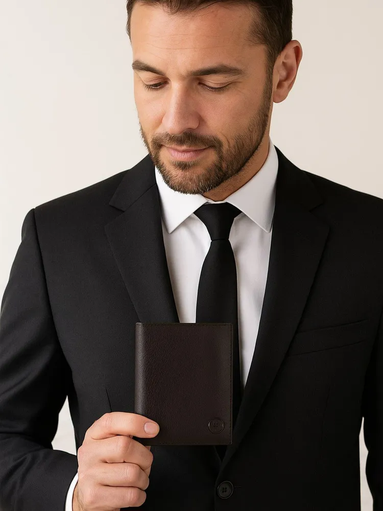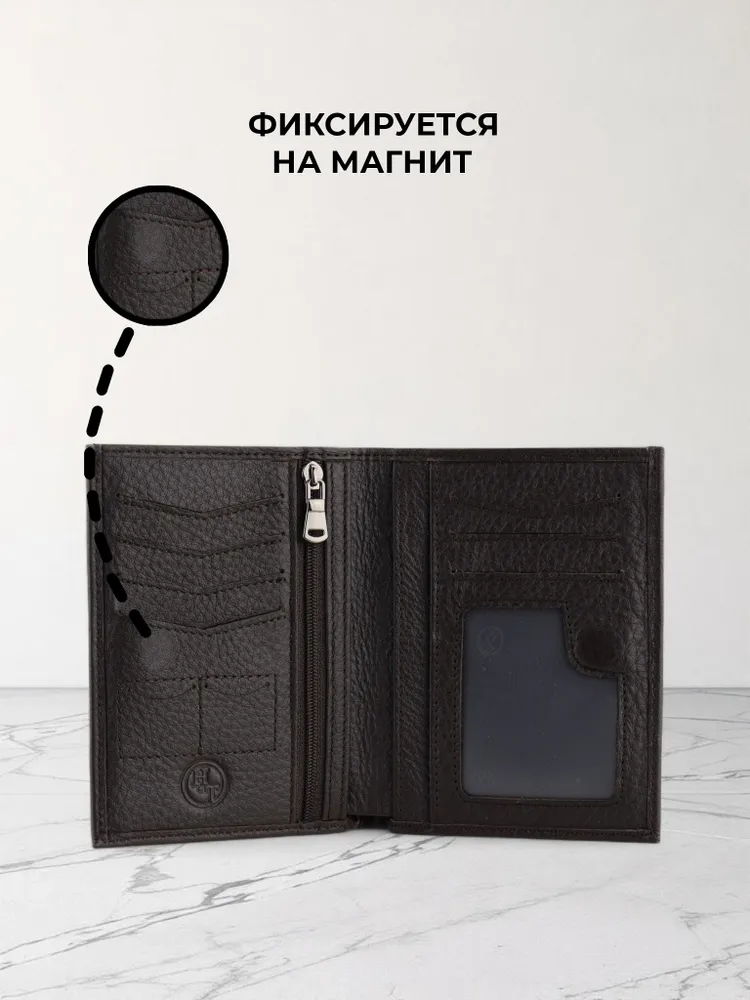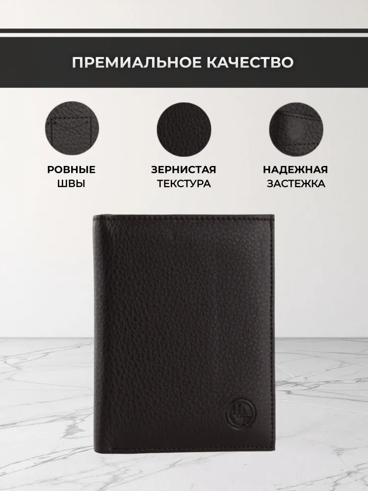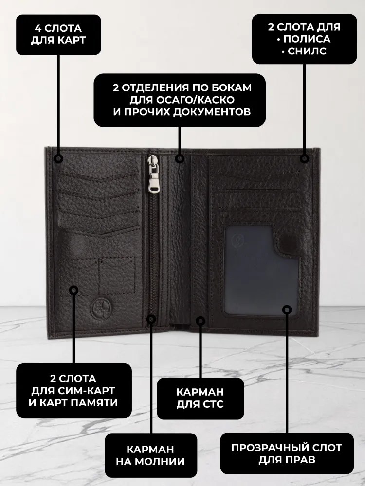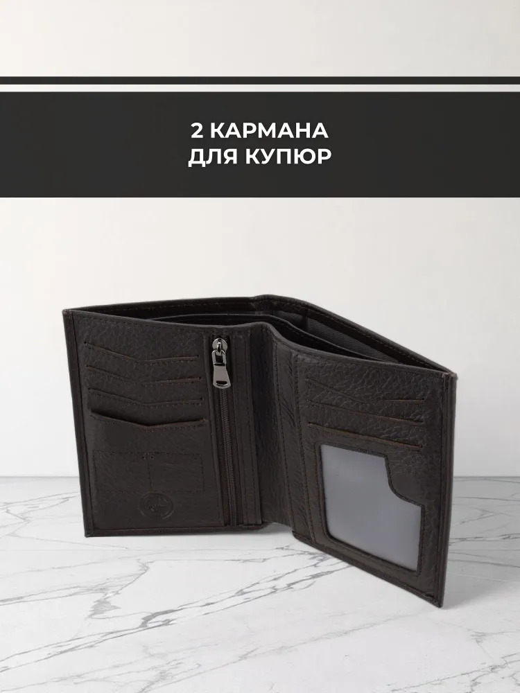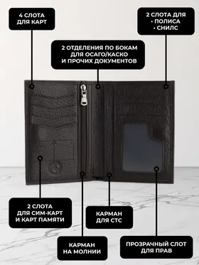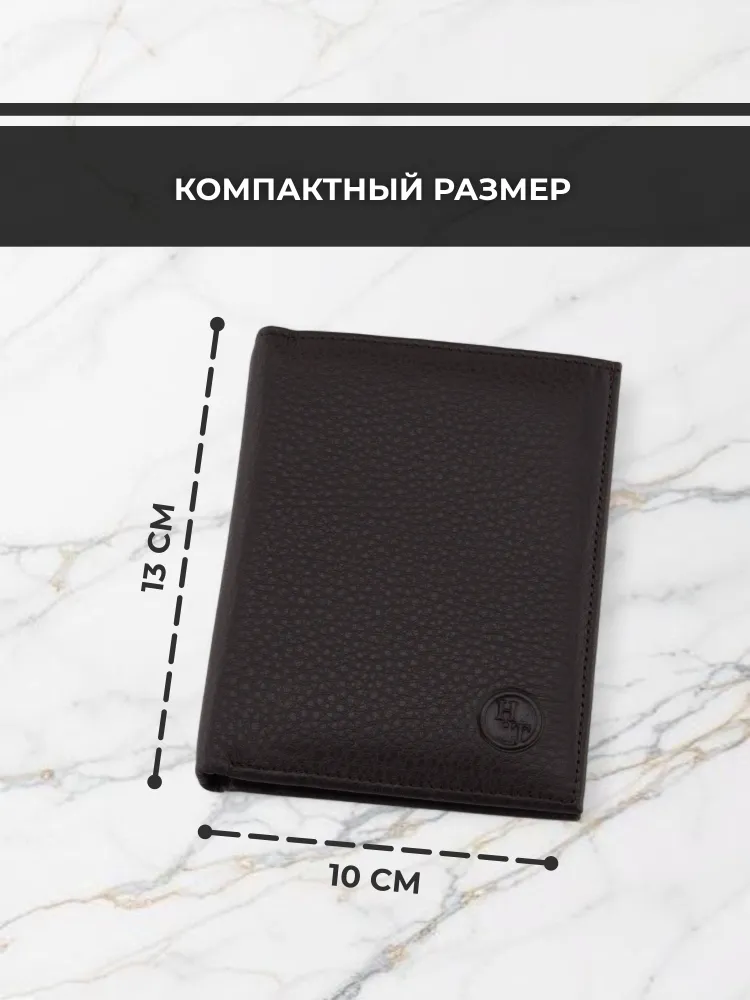 Мужской кошелек из натуральной кожи - это стильный и практичный аксессуар, который поможет организовать хранение ваших карточек, денег и документов. Этот маленький кожаный кошелек идеально подходит для тех, кто предпочитает компактные аксессуары. Он легко помещается в сумку и даже в карман. Внутри вы найдете отделения для карт и документов, карман для мелочи, а также отдельное место для хранения наличных. Мини портмоне из натуральной кожи также может использоваться как портмоне для автодокументов и бумажник для купюр. Портмоне мужское из натуральной кожи - это элегантный и удобный аксессуар, который станет незаменимым спутником в повседневной жизни. Премиальное качество всего изделия. Нейлоновая внутренняя отделка, надежная застежка и качественная прострочка. Поставляется в подарочной коробке. Отделения: 1 карман на молнии 1 отделение для водительских прав 1 отделение для СНИЛС 1 отделение для полиса 1 отделение для СТС 2 отделения для купюр 4 слота для карт 2 слота для сим-карт 2 скрытых кармана по бокам Размер изделия: Высота 13 см Ширина 10 см
