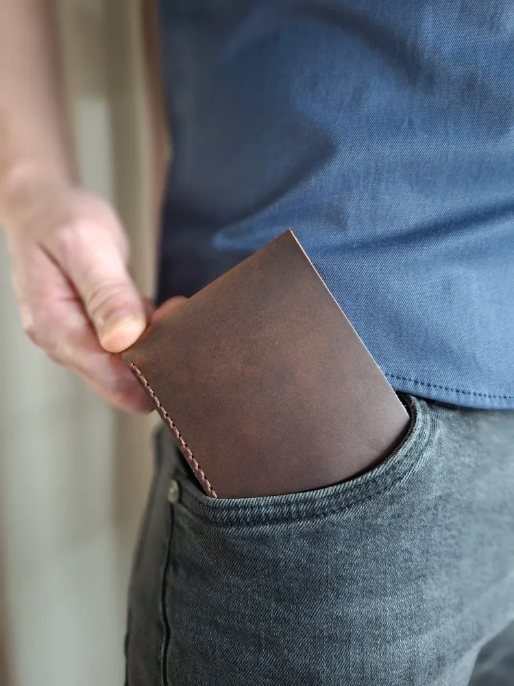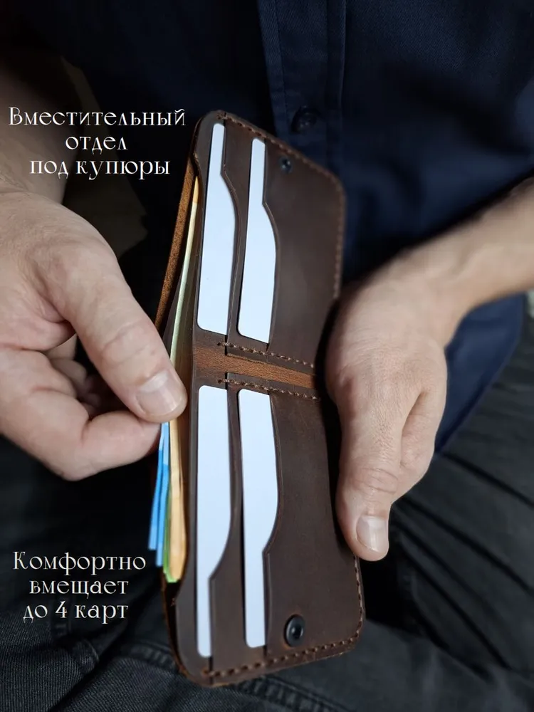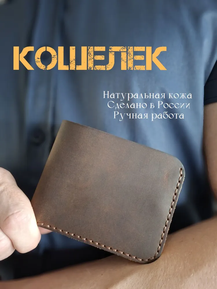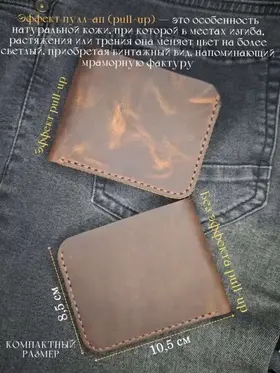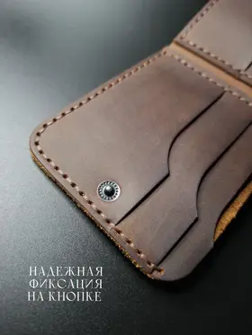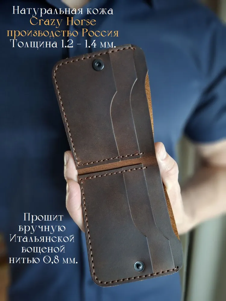 Стильный и функциональный мужской кошелек изготовлен из высококачественной натуральной кожи Crazy Horse. Этот аксессуар отлично сочетает в себе элегантность и практичность, что делает его идеальным выбором для современных мужчин. Кошелек выделяется своей долговечностью и приятной текстурой. Имеет компактные размеры 10,5 см*8,5 см., что подходит тем, кто предпочитает носить его в кармане или небольшой сумке, а металлическая кнопка обеспечит надежную фиксацию. Он легко вмещает все необходимые карты/визитки и наличные, что делает его идеальным для повседневного использования. Если Вы ищете мужской кошелек, который сочетает в себе качество, стиль и удобство, то этот аксессуар станет отличным выбором. Не упустите возможность сделать Ваш образ более завершенным и продуманным с помощью этого великолепного кошелька из натуральной кожи. Идеальный вариант подарка для мужчин, которые ценят практичность и стиль. Оптимальное сочетание цены и качества делает его привлекательным выбором для каждого. Ручная работа мастера делает каждую деталь уникальной. Мы работаем с натуральным материалом — В соответствии с ГОСТ 28631-2005 5.4.3 дефектами в изделиях не считают: пороки натуральной кожи — хорошо заросшие свищи и оспины, заросшие царапины, роговины, рубцы, ворсистость, молочные линии, незначительная стяжка, заросшие укусы насекомых, неглубокие (до 1/4 толщины кожи) подрези, неровная окраска на кожах анилинового, полуанилинового и других специальных методов крашения.— При намокании и/или интенсивном трении кожа может отдавать краску и окрашивать соприкасающиеся с ней поверхности.— В процессе эксплуатации возможно небольшое осыпание бахтармы.