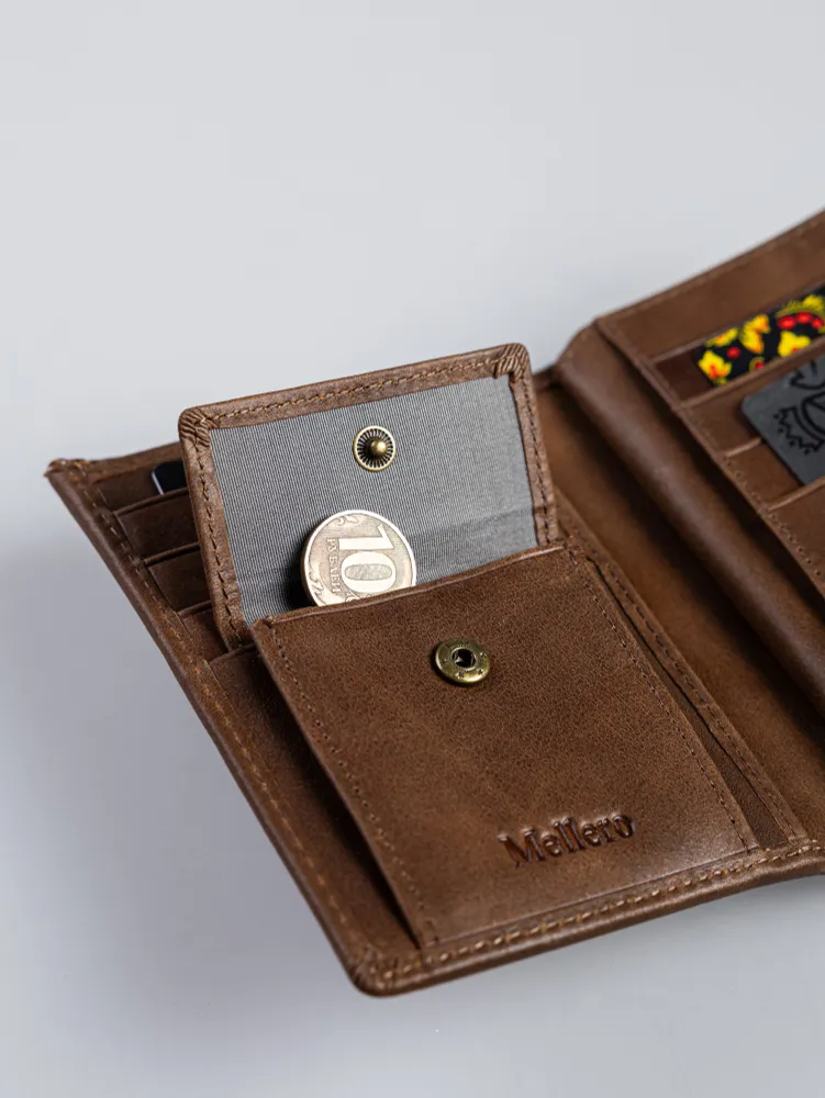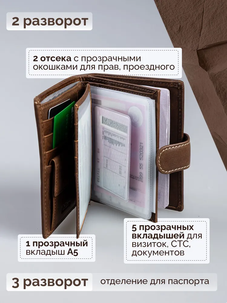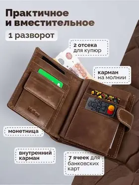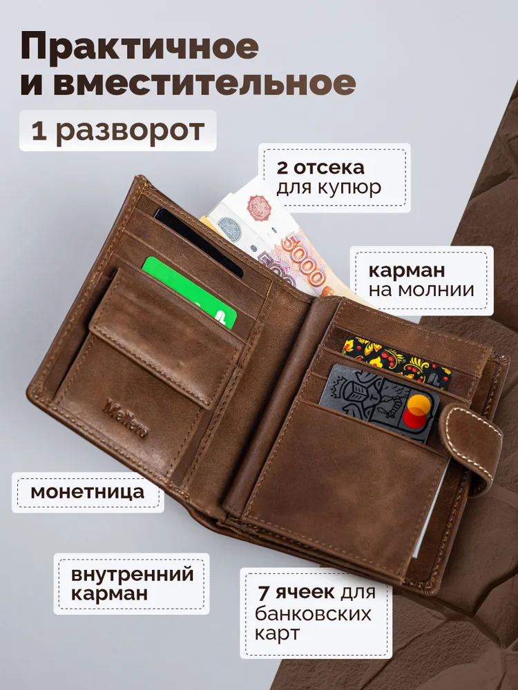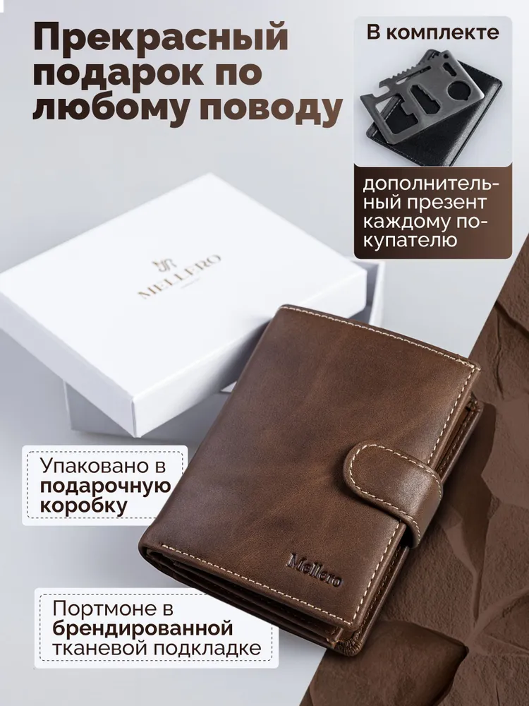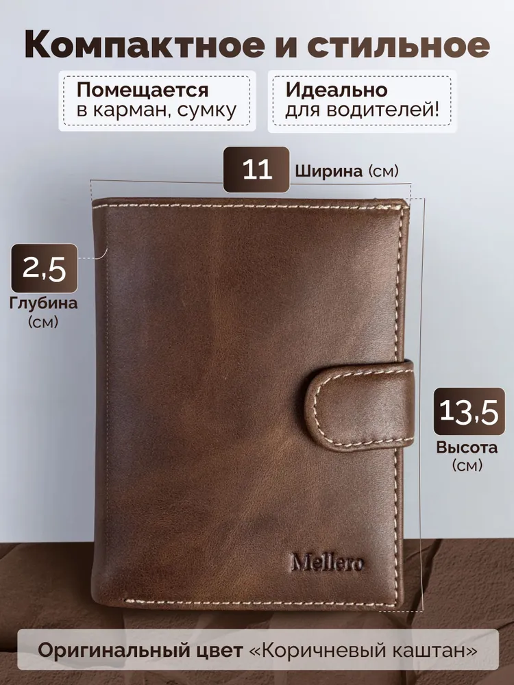 Кошелек мужской из натуральной кожи премиум класса 3в1 для денег, автодокументов, паспорта и банковских карт. Бумажник мужской сконструирован книжкой с тремя разворотами. Портмоне мужское имеет 2 отсека и большой потайной карман на молнии для купюр, важных документов, банкнот, 7 ячеек для пластиковых карт, дисконтных карточек, отсек обложка для паспорта, 2 скрытых отсека для документов, маленькое прозрачное отделение для прав, СНИЛС, 4 больших прозрачных отделения и 2 отсека с прозрачным окошком для СТС, пропусков, визиток, вкладыш с файлом для документов формата А5, ПТС, страхового полиса, карман для монет и мелочи на кнопке. Специальный клапан с металлической кнопкой соединяет все отделения, надежно защищая от внезапного открытия и потери содержимого. Компактный размер изделия позволяет с легкостью поместить его в любую сумку, карман. Кошельки мужские из экокожи быстро изнашиваются и теряют внешний вид, поэтому отделка наших изделий выполнена исключительно из натуральной кожи, которая обладает высоким уровнем износоустойчивости и защитит содержимое от влаги и повреждений. Кошелек мужской из натуральной кожи пользуется популярностью среди мужчин всех возрастов, подойдет и для мальчика или подростка. Портмоне мужское для документов можно использовать как бумажник водителя, ведь оно позволит удобно хранить паспорт, водительские права и другие ценные бумаги безопасно и надежно. Оригинальный дизайн делает кошелек мужской кожаный незаменимым предметом для любого образа. Каждый аксессуар нашего бренда завернут в тканевую подложку, упакован в брендированную подарочную коробку и матовый пакет для защиты от повреждений при транспортировке. Портмоне мужское натуральная кожа имеет размеры - 9х12х3 см, вес составляет всего 200 гр. Его часто приобретают в подарок мужу, брату или сыну на день рождения, парню, любимому на 14 февраля, другу на 23 февраля, коллеге на Новый Год, дедушке или папе на юбилей, это статусный презент для дорогого человека! Приятных покупок с Mellero!