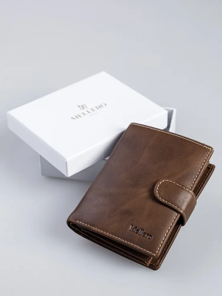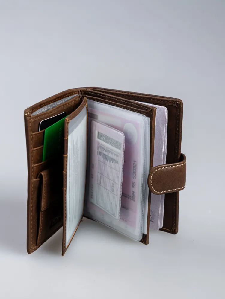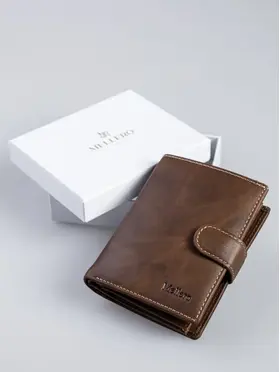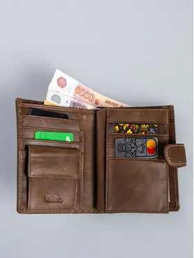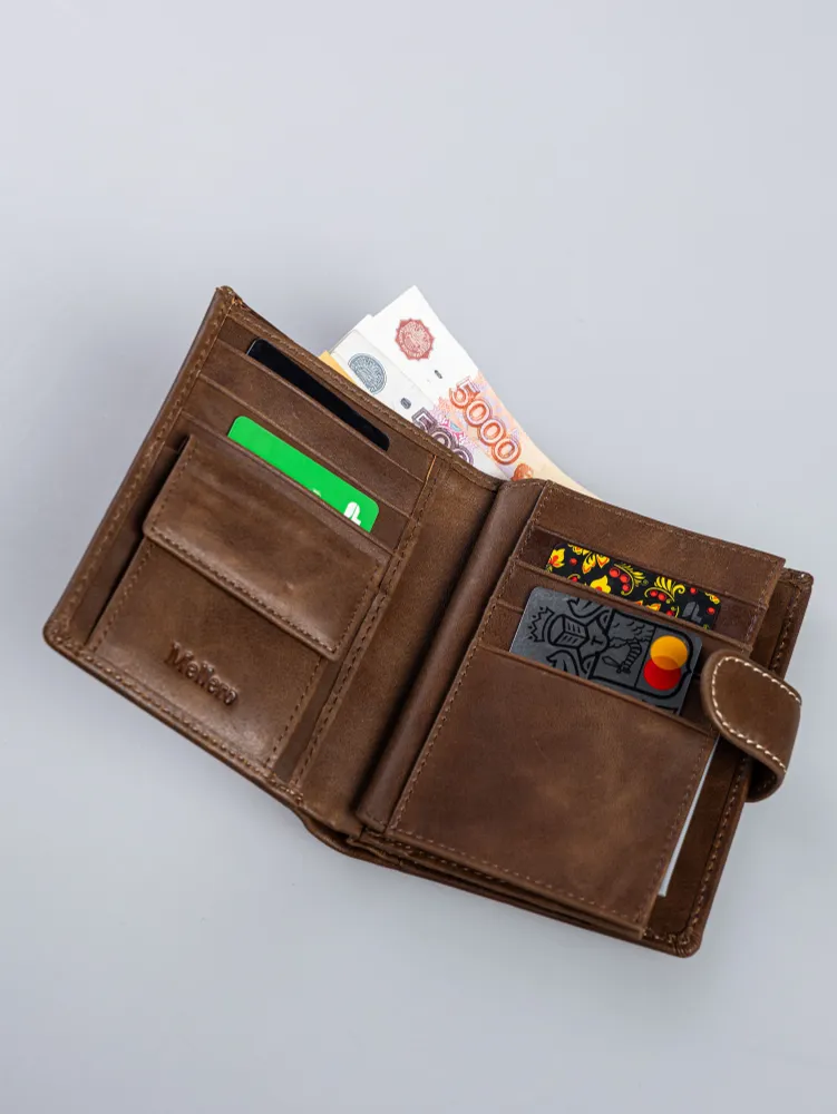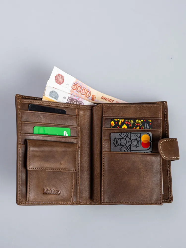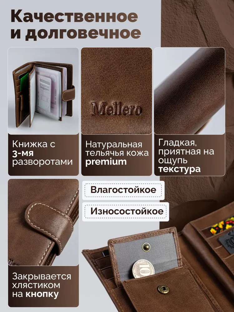Кошелек мужской из натуральной кожи премиум класса 3в1 для денег, автодокументов, паспорта и банковских карт. Бумажник мужской сконструирован книжкой с тремя разворотами. Портмоне мужское имеет 2 отсека и большой потайной карман на молнии для купюр, важных документов, банкнот, 7 ячеек для пластиковых карт, дисконтных карточек, отсек обложка для паспорта, 2 скрытых отсека для документов, маленькое прозрачное отделение для прав, СНИЛС, 4 больших прозрачных отделения и 2 отсека с прозрачным окошком для СТС, пропусков, визиток, вкладыш с файлом для документов формата А5, ПТС, страхового полиса, карман для монет и мелочи на кнопке. Специальный клапан с металлической кнопкой соединяет все отделения, надежно защищая от внезапного открытия и потери содержимого. Компактный размер изделия позволяет с легкостью поместить его в любую сумку, карман. Кошельки мужские из экокожи быстро изнашиваются и теряют внешний вид, поэтому отделка наших изделий выполнена исключительно из натуральной кожи, которая обладает высоким уровнем износоустойчивости и защитит содержимое от влаги и повреждений. Кошелек мужской из натуральной кожи пользуется популярностью среди мужчин всех возрастов, подойдет и для мальчика или подростка. Портмоне мужское для документов можно использовать как бумажник водителя, ведь оно позволит удобно хранить паспорт, водительские права и другие ценные бумаги безопасно и надежно. Оригинальный дизайн делает кошелек мужской кожаный незаменимым предметом для любого образа. Каждый аксессуар нашего бренда завернут в тканевую подложку, упакован в брендированную подарочную коробку и матовый пакет для защиты от повреждений при транспортировке. Портмоне мужское натуральная кожа имеет размеры - 9х12х3 см, вес составляет всего 200 гр. Его часто приобретают в подарок мужу, брату или сыну на день рождения, парню, любимому на 14 февраля, другу на 23 февраля, коллеге на Новый Год, дедушке или папе на юбилей, это статусный презент для дорогого человека! Приятных покупок с Mellero!