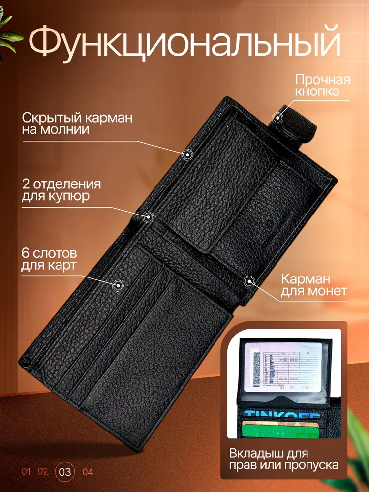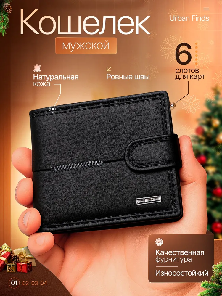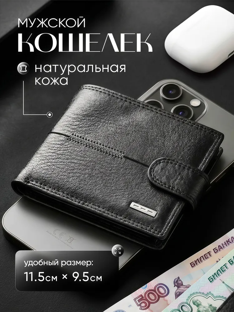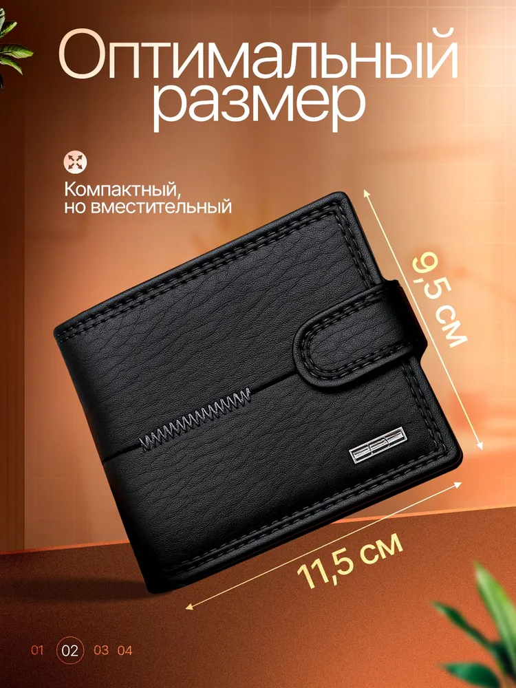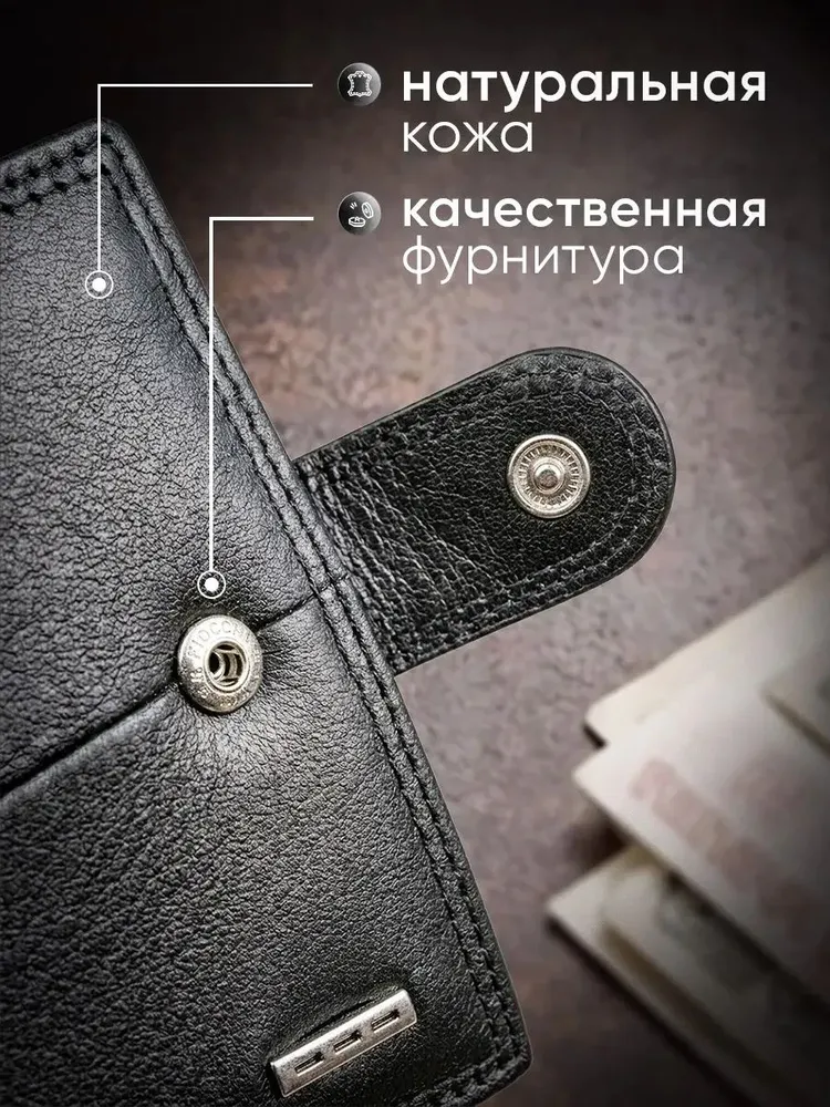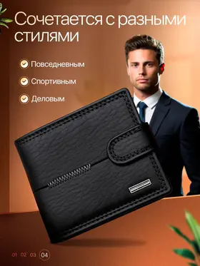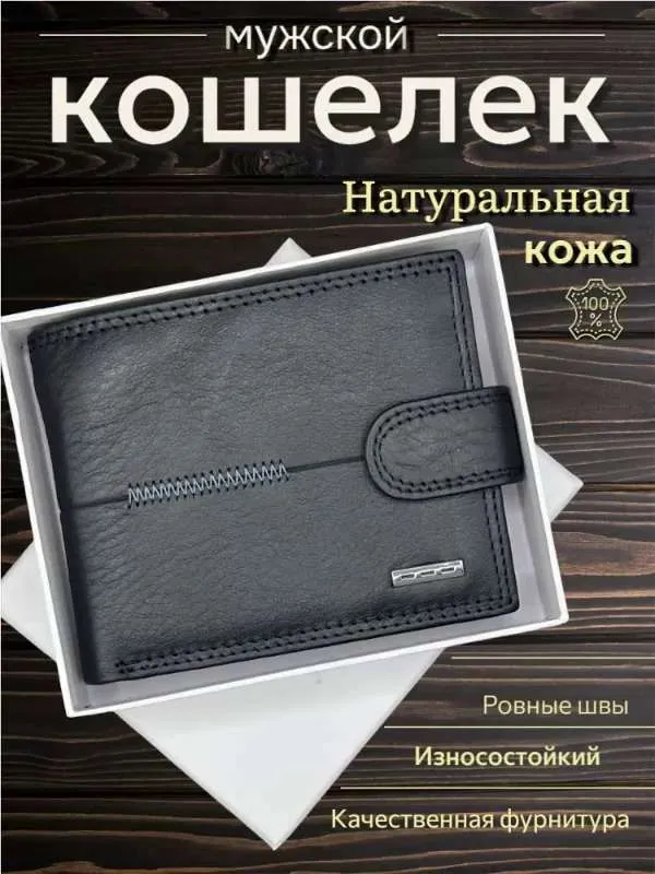 МУЖСКОЙ СТИЛЬНЫЙ КОШЕЛЕК Кожаный мужской кошелек – это именно то, что вам нужно! Этот аксессуар создан для тех, кто ценит стиль и надежность в каждой детали. 1. Высококачественные материалы: Кошелек изготовлен из натуральной кожи, что гарантирует его долговечность и износостойкость. Кожа обладает приятной текстурой и со временем становится только красивее, подчеркивая ваш индивидуальный стиль. 2. Удобная надежная застежка обеспечивает легкий доступ к вашим картам и наличным. 3. Элегантный и современный дизайн: Черный цвет и лаконичные линии делают этот кошелек универсальным аксессуаром, он легко сочетается с любым стилем одежды, добавляя нотку строгости и стиля. 4. Компактные размеры и функциональность: Несмотря на свои небольшие размеры, кошелек из вмещает все необходимые карты, наличные и документы. Он легко помещается в кармане или сумке, не занимая много места, что делает его идеальным спутником для активного образа жизни. 5. Идеальный подарок для мужчин- кошелек станет отличным подарком для вашего друга, брата или коллеги.