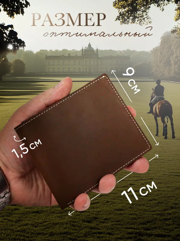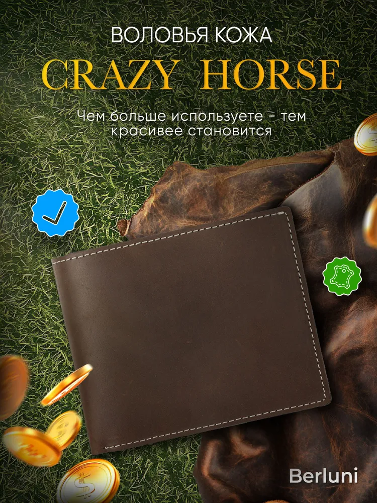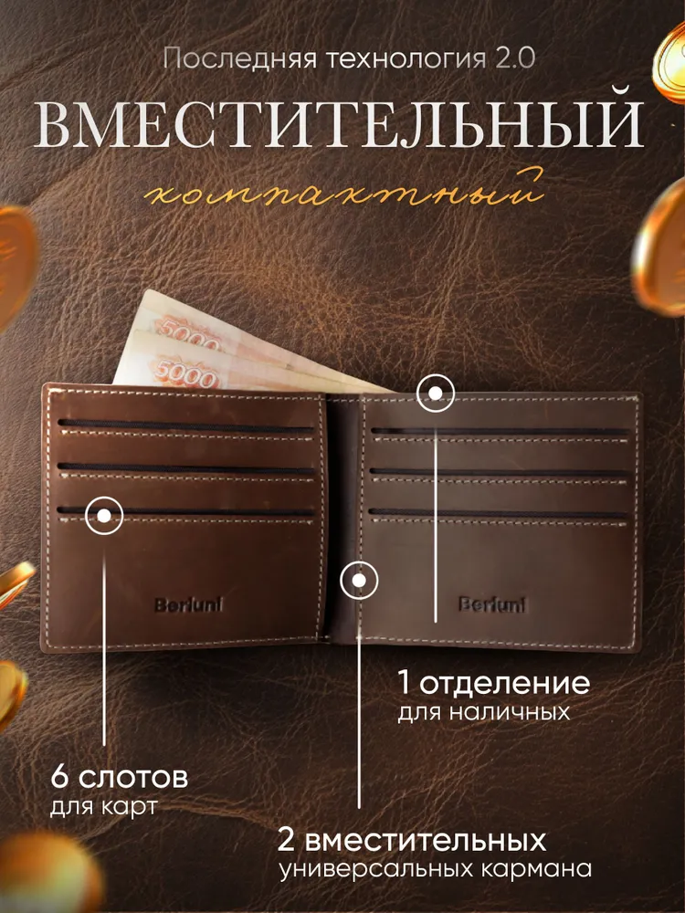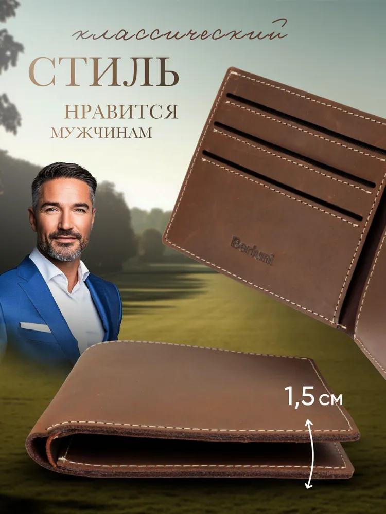 Berluni Кошелек для мужчин от премиум бренда Berluni сочетает в себе стиль и функциональность. Этот кожаный аксессуар выполнен из натуральной кожи, обладающей мягкостью и долговечностью. Отличается тонким и компактным дизайном, идеально подходящим для тех, кто ценит удобство и элегантность. Портмоне предлагает шесть слотов для банковских карт, что позволяет всегда иметь при себе все необходимые карточки. Одно отделение предназначено для купюр, а два дополнительных отделения предоставляют возможность хранить различные мелкие документы или карты. Такой бумажник станет незаменимым атрибутом современного мужчины. Этот тонкий кошелёк будет отличным подарком на День Рождения, Юбилей, Новый Год, 14 февраля и 23 февраля. Идеальное портмоне для карт и документов Вместительность партмоне радует своей простой организацией внутреннего пространства. Кредитница надежно удерживает пластиковые карты благодаря тщательно продуманной конструкции. Водительские документы также найдут свое место рядом с визитницей или кредитницами. Изготовление из цельных пластов кожи Кошельки производят из высококачественной, цельной натуральной кожи. Кошелек Berluni - стиль и качество любого мужчины Этот кожаный аксессуар выглядит стильно благодаря премиум коже Crazy Horse, которая придает кошельку изысканный вид. Данный тип кожи смотрится очень благородно и со временем будет ещё интереснее и натуральнее. Кожа Crazy Horse бывает разного качества, мы в бренде Berluni используем самое дорогое сырьё, в отличии от похожих моделей конкурентов.