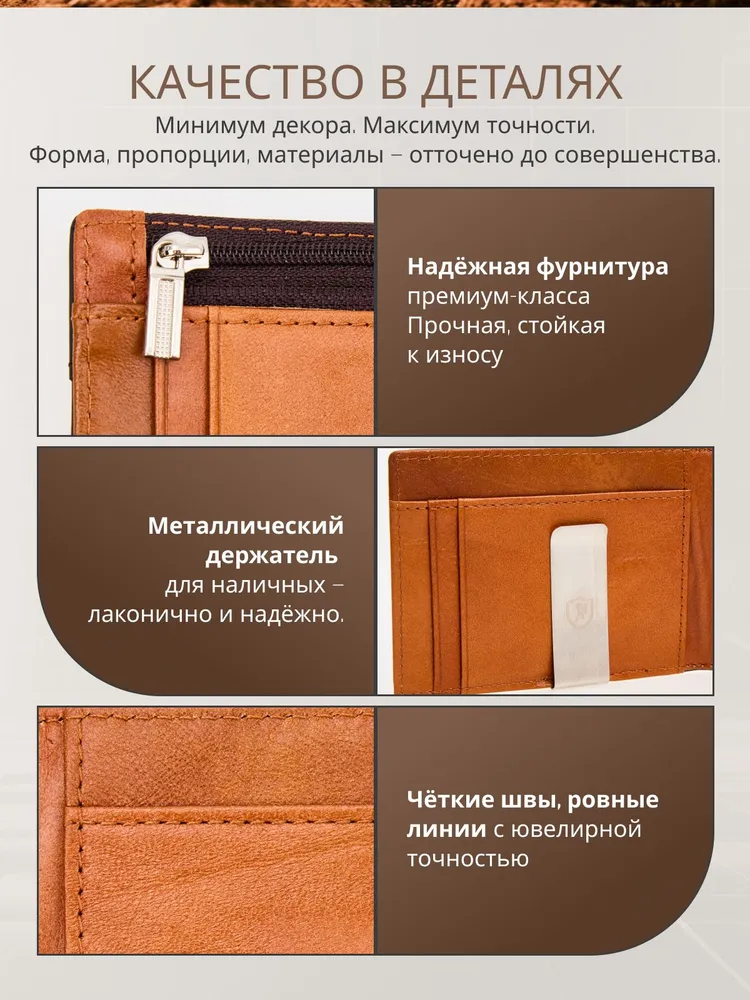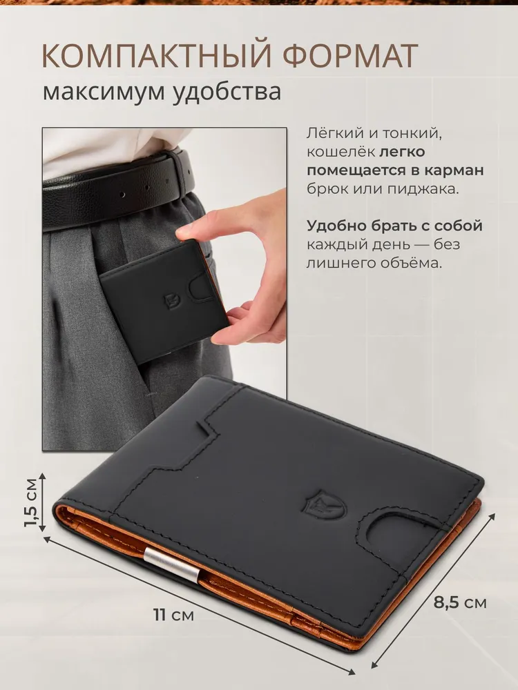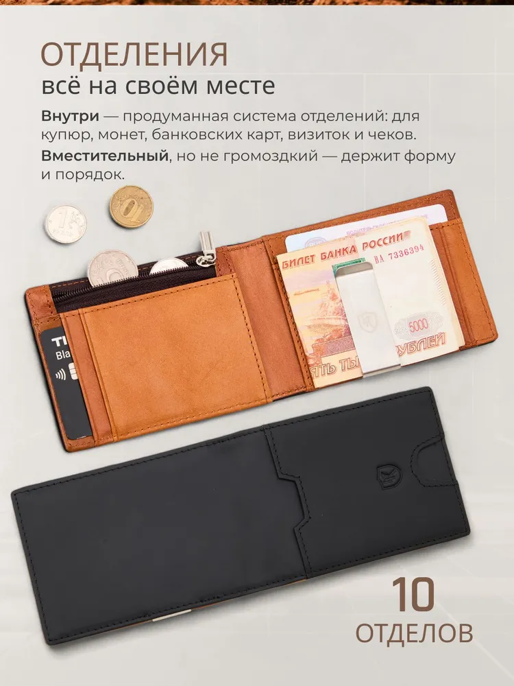 Стильный и функциональный мужской кошелек - идеальный аксессуар для современного мужчины. Этот картхолдер выполнен из натуральной кожи, что обеспечивает прочность и долговечность. С его помощью вы сможете удобно размещать все необходимые вещи. В кошельке 8 отделений для кредитных карт и отдельные секции для мелочи и денег. В портмоне есть визитница и монетница на молнии. Теперь хранить важные карточки и мелкие деньги можно в одном месте. Портмоне оснащен зажимом для купюр, что делает его использование еще более удобным. Он не только элегантно и привлекательно выглядит, но и обеспечивает надежную защиту. Благодаря технологии RFID blocking wallet, вы можете не беспокоиться о том, что ваши карты могут подвергнуться кибератакам и их данные могут быть украдены. С таким бумажником деньги будут в безопасности, так как сканирование с карт, находящихся в кошельке, невозможно. Уникальная конструкция позволяет кредитнице быть тонкой и маленькой, но при этом она будет оставаться очень вместительной. Мини кошелек отличный вариант для подарка мужчине, будь то муж, парень или коллега. Этот мужской аксессуар в подарочной упаковке станет готовым подарком на день рождения, Новый год, 14 февраля или 23 февраля. Модный тренд 2025 года для настоящих мужчин!