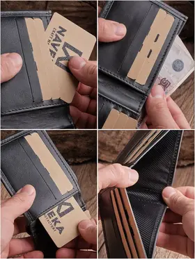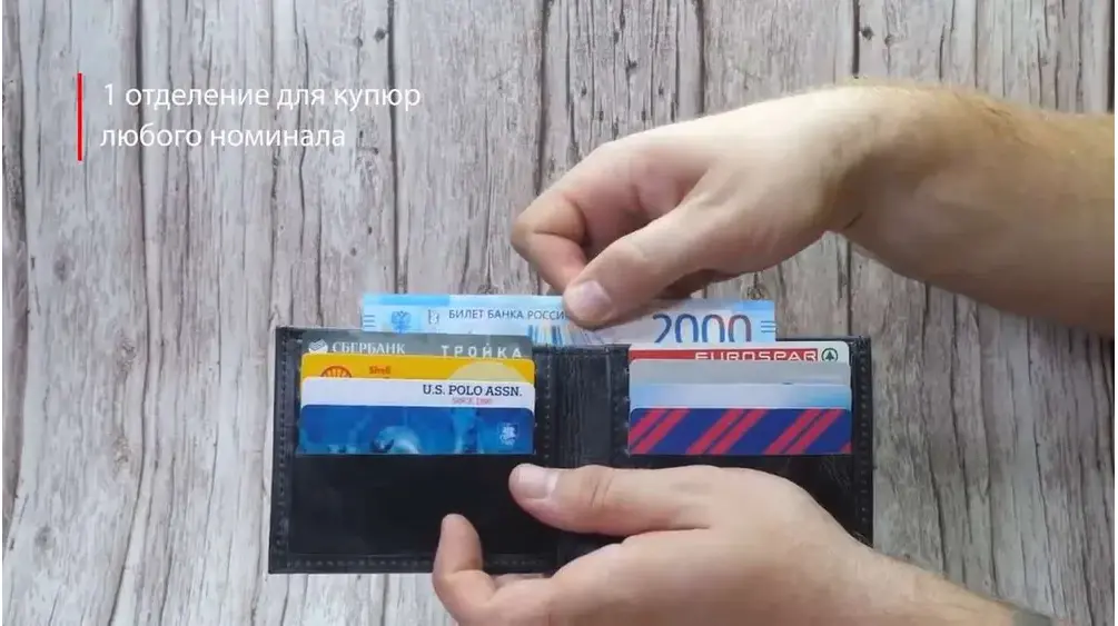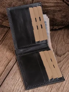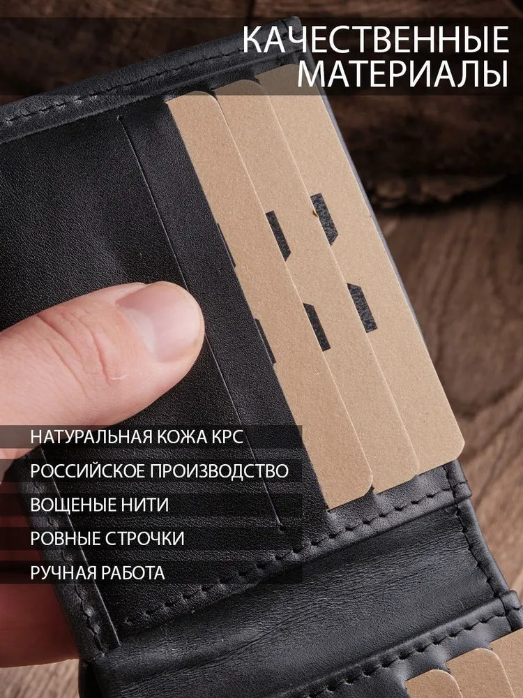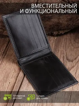 Наш бренд представляет Вам одну из мужских моделей кошельков "Техас", в которой отлично сочетаются функциональность и минимализм. У нас собственное производство, и мы выбираем материалы только высокой категории. Благодаря этому мы создаем кошельки, лонгеры, портмоне, клатчи, кредитницы, картхолдеры, рюкзаки и другие изделия наилучшего качества. Эргономичность Портмоне имеет все необходимые кармашки и отделения. В данной модели: - 10 слотов для пластиковых карт, визиток, водительских прав; - 1 вместительное отделение для купюр. Картхолдер не имеет застежки, но продуманный дизайн не позволит ему открыться без вашего желания. Кошелек имеет небольшой размер (9х11х1 см), поэтому поместится в любую сумку или карман. Отличный подарок Бумажник отлично подойдет как подарок для мужа, брата, отца и друга, или станет стильным аксессуаром на любой встрече. Кошелек гармонирует с любым образом и понравится многим мужчинам.