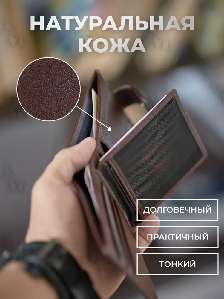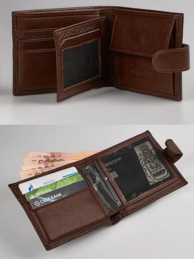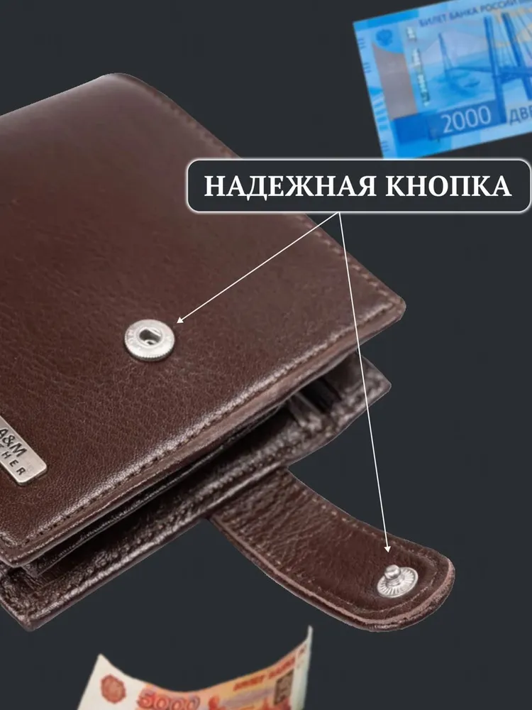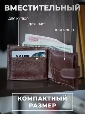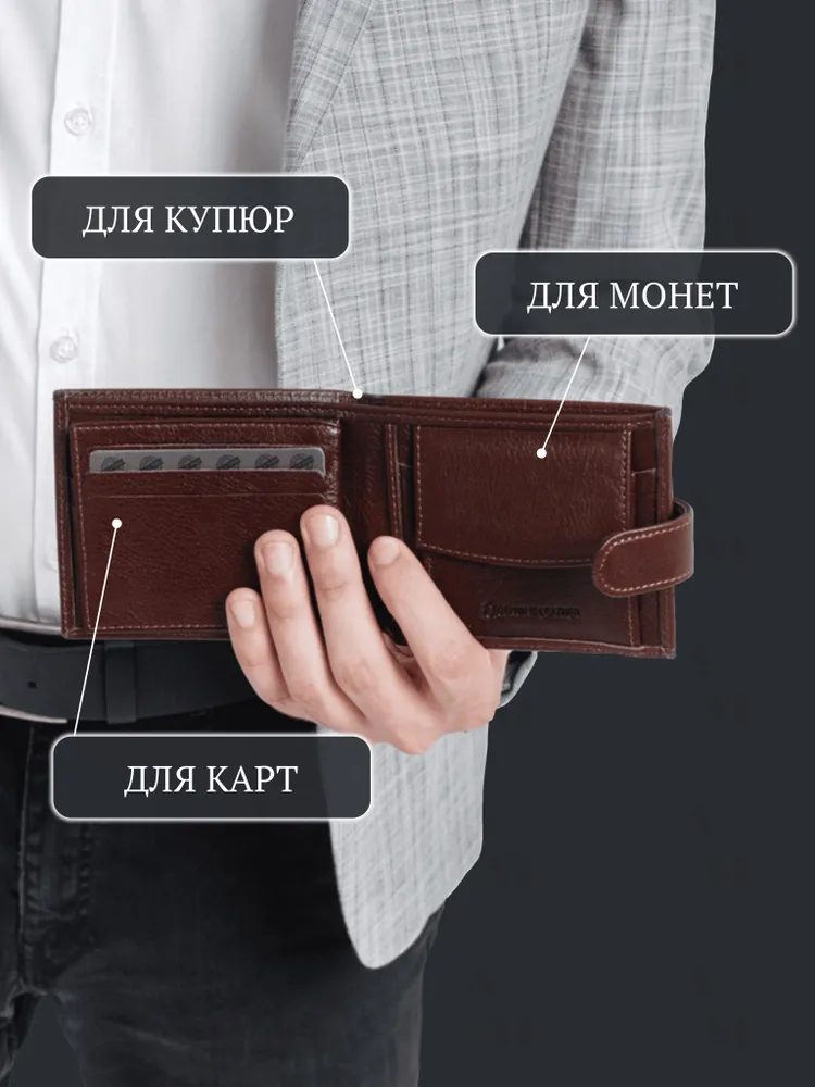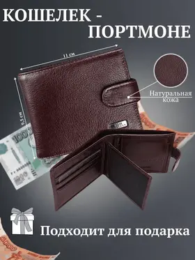 КОШЕЛЕК БУМАЖНИК ПОРТМОНЕ Минимализм! Высокий функционал! Натуральная кожа! Темно коричневый мужской кошелек из натуральной кожи идеально подойдёт не только для хранения купюр, но и для пластиковых карт или водительских прав. Складывается пополам и закрывается на заклёпку. Два больших отделения для крупных купюр со скрытым кармашком на молнии, монетница на кнопке, несколько отделений для карт, проездных, пропусков или водительских прав. Благодаря красивой коробке станет прекрасным подарком. Кошелек Портмоне Бумажник Удобный размер: 9,5х11х2см. Специально разработанный для вашего комфорта, этот кошелек легко помещается в карманы брюк, пиджака и рубашки, сохраняя ваш стиль в любой ситуации. Безопасное закрывание на кнопку: Ваши деньги и документы всегда под надежной защитой.