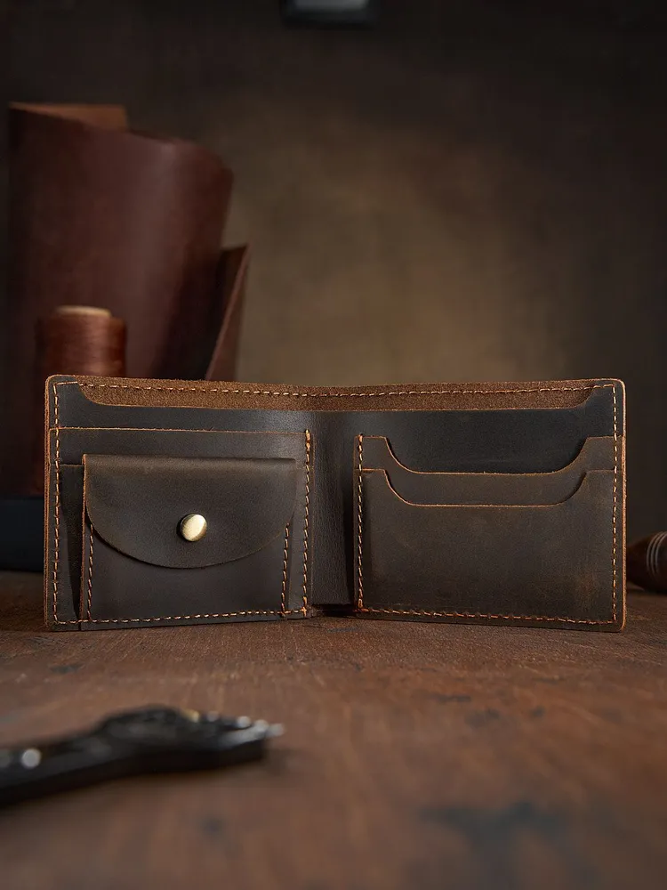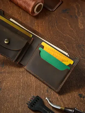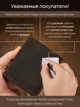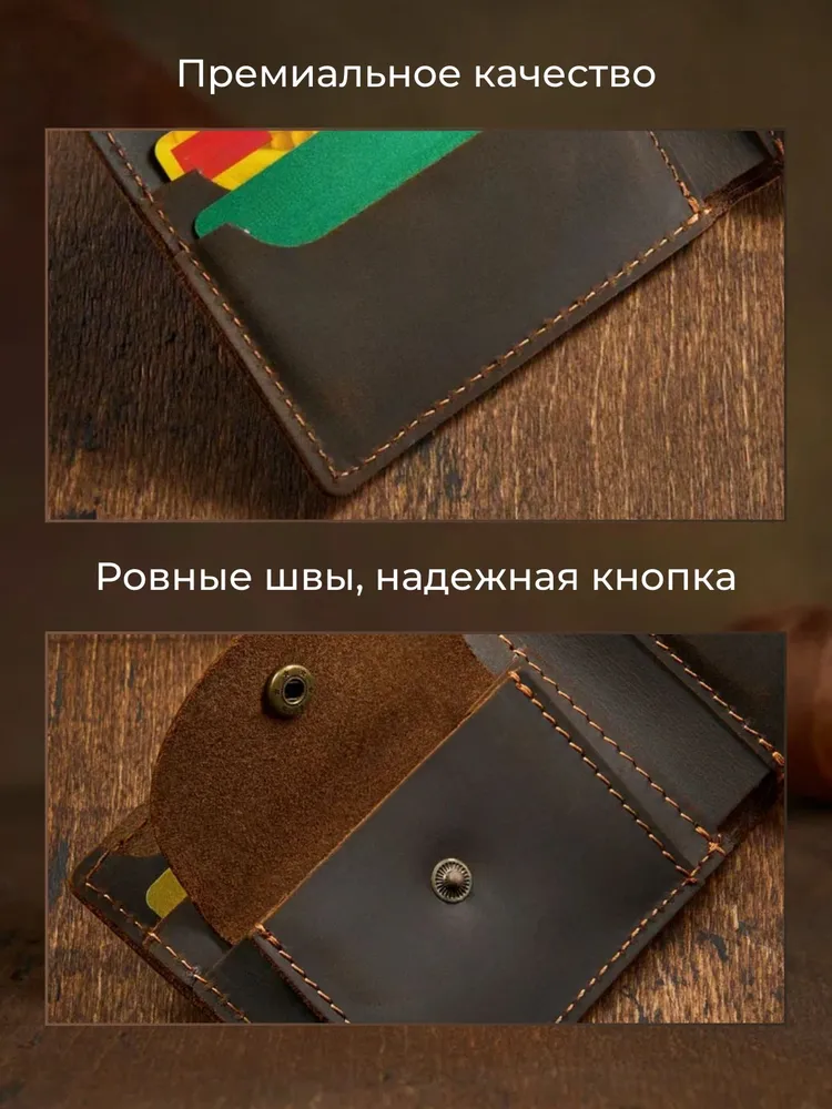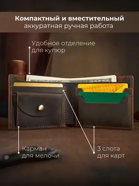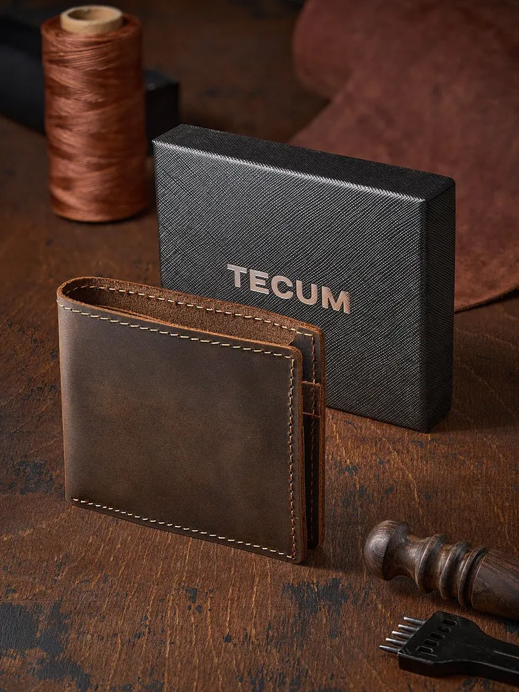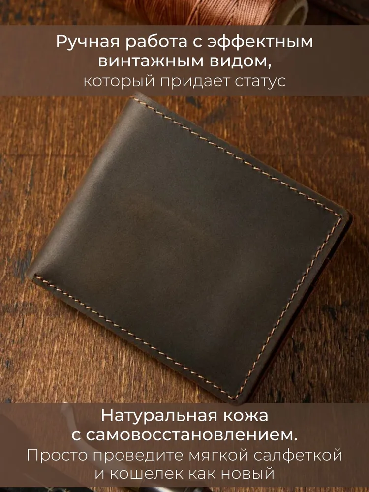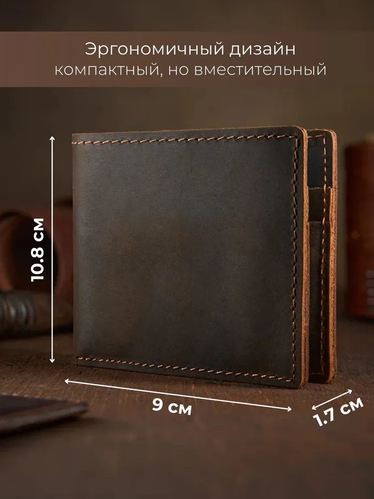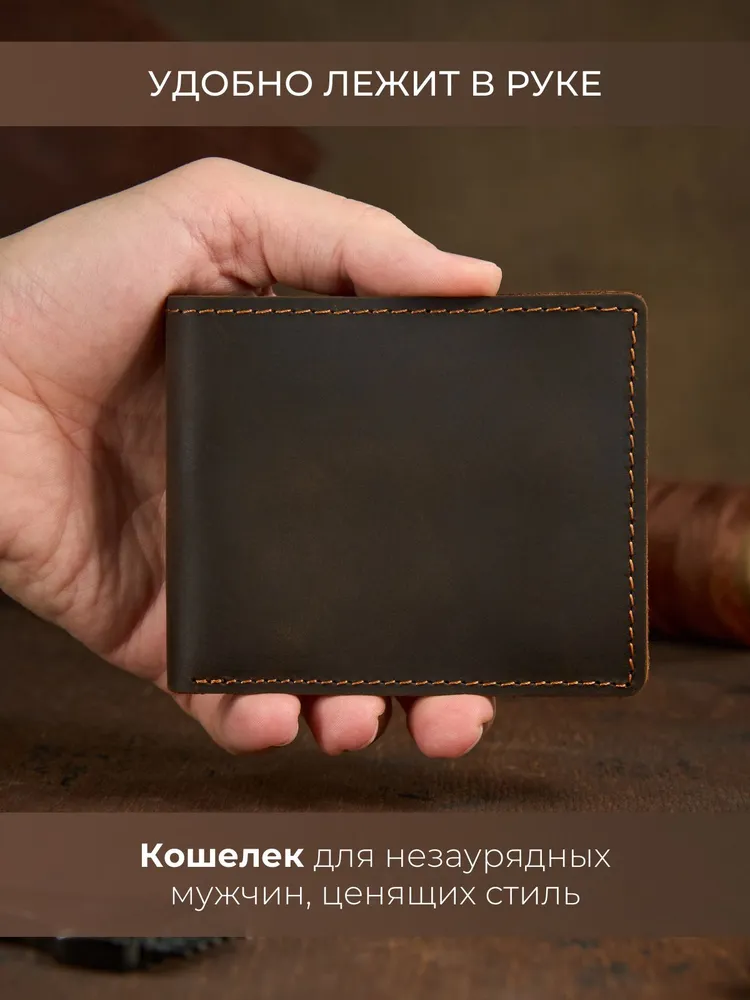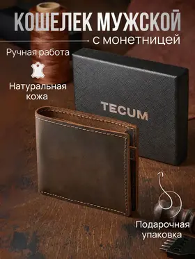Незаменимый мужской аксессуар. - Натуральная кожа crazy horse - Удобный и функциональный - Премиальное качество Узнайте больше в описании ↓ Стильный кошелек ручной работы бренда Tecum. Полезный мужской аксессуар для всех, кто хочет держать важные мелочи, карты и вещи всегда под рукой. Выполненный из восхитительной натуральной кожи дубления crazy horse, которую приятно держать в руках. Она красиво стареет и приобретает патину с легким глянцем, благодаря тугоплавким воскам. Компактный. При своей высокой функциональности, кошелек занимает весьма мало места в руке, в кармане, сумке или рюкзаке. Прочный и универсальный. Материал кошелька надежный, износостойкий, не поддается стиранию и механическим повреждениям. Вместительный и надежный. Несмотря на компактный размер, в бумажнике 5 отделений для прав, карт, купюр и мелочи! Качественная прошивка позволит прослужить кошельку долгое время. Аристократический стиль в ваших руках. Красивая расцветка в темно коричневом цвете понравятся каждому любителю оригинальных аксессуаров. Такая кожа отличается особенной текстурой и цветовым переливанием в сочетании с мягкостью. Приятна на ощупь, обладает высокой прочностью и со временем при использовании создастся эффект антикварности. Идеальный мужской презент! Вы можете использовать кошелек как повседневно, так и в качестве презента! Красивая и плотная подарочная коробка, в которой вы смело можете дарить кошелек дорогим, важным и близким вашим людям. Стиль, проверенный временем. Классический дизайн, который никогда не выйдет из моды. Минимум деталей, максимум стиля и практичности — кошелёк, который уместен в любой ситуации. Подходит как для офиса, так и для повседневного использования. Добро пожаловать в наш магазин бренда TECUM! Пользуйтесь с удовольствием нашими изделиями! Кликайте на фото, заходите к нам на страничку и выбирайте подходящие для вас или ваших близких аксессуары нашего магазина под ваш стиль жизни. Спасибо за выбор нашего магазина. Ваш бренд TECUM!