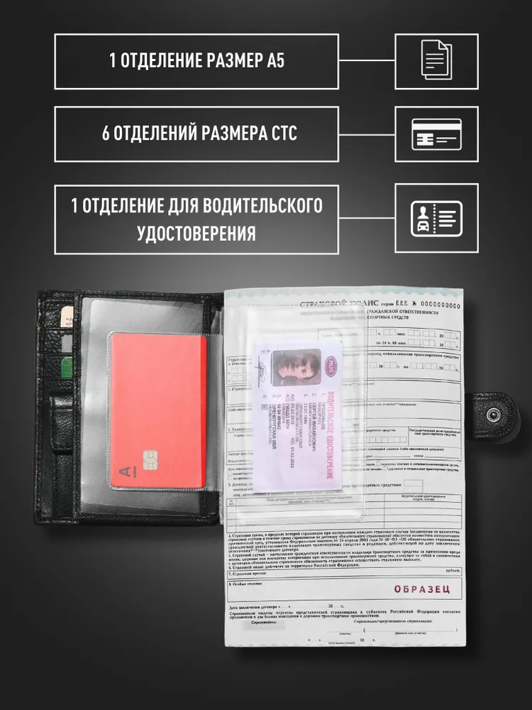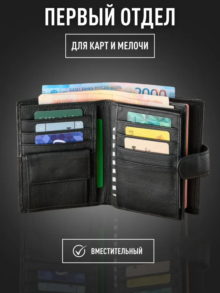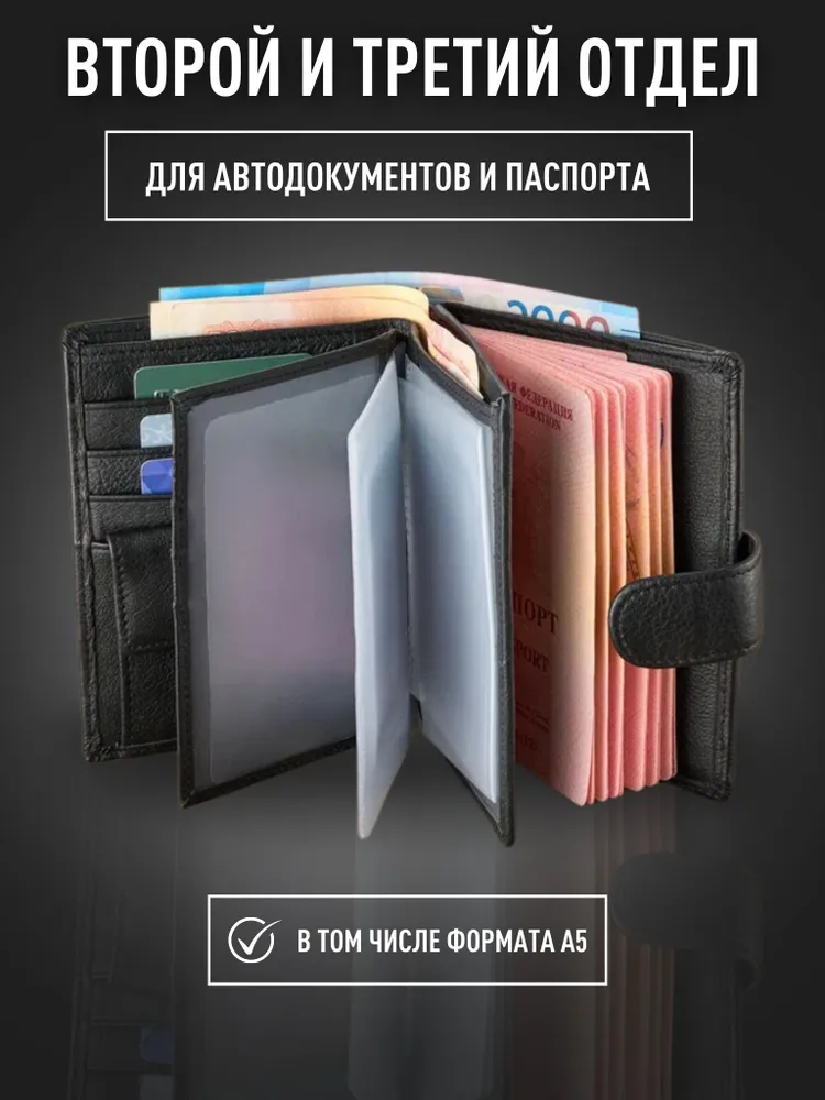 Натуральная кожа Premium качества Мужское портмоне - это не просто аксессуар, а важный элемент гардероба каждого мужчины. Кошелек из натуральной кожи станет отличным подарком, благодаря красивой и стильной упаковке, имеет классический дизайн, что делает его очень практичным и подходящим под любой стиль. Вместительный и функциональный Вы найдете 21 отделение, позволяющие без проблем хранить и организовывать вашу коллекцию карт, отделения для наличных и документов. А так же 1 потайное отделение на молнии. Для денег и мелочи В портмоне есть удобное отделение для монет и мелочи, которое надежно закрывается на прочную стальную кнопку. Благодаря этому мелочь не смешивается с купюрами и не высыпается. Для документов Особенностью этого портмоне являются два прозрачных отделения, одно из которых формата А5 которые позволяют разместить важные документы, такие как паспорт, СНИЛС, СТС или водительские права. Это удобное решение для тех, кто хочет иметь быстрый доступ к таким документам. Стиль. Качество. Дизайн. Размер данного кожаного бумажника делает его удобным в использовании и компактным в хранении. Портмоне качественно прошит и сделан из тактильно приятного материала как снаружи, так и изнутри. Данная модель с изящным дизайном, закрывается на крепкую застежку «кнопку», и хорошо сочетается с любым стилем одежды: повседневным, классическим или спортивным.
