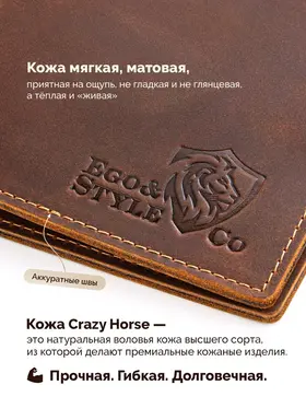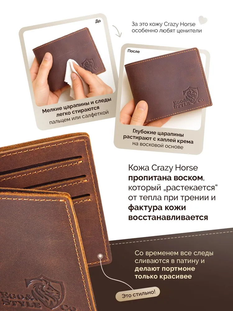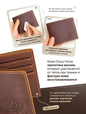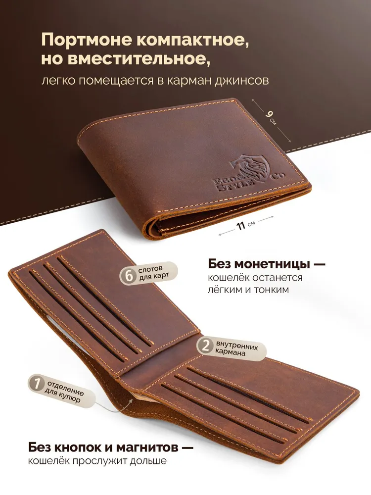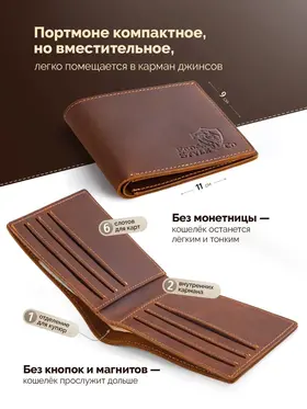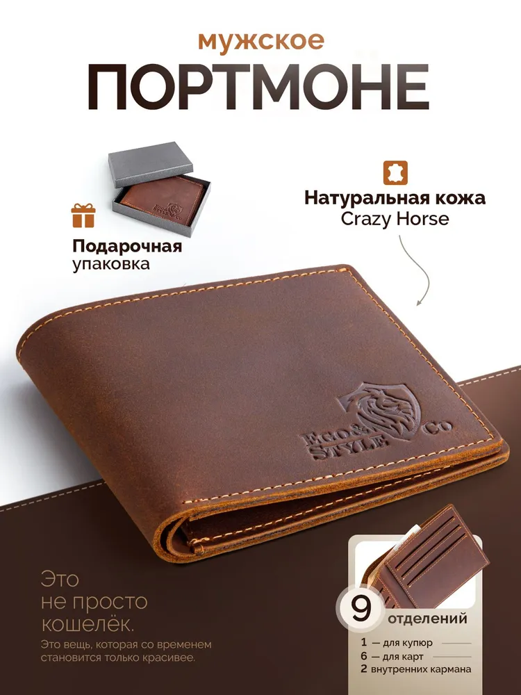 Кожаный кошелек-портмоне для мужчин из натуральной кожи – стильный аксессуар, который подчеркнет статус и вкус своего владельца. Этот элегантный предмет гардероба не только станет надежным хранителем ваших финансов и документов, но и дополнит любой образ, добавляя ему изысканности и солидности. Представляем вашему вниманию классическое портмоне, созданное специально для тех, кто ценит качество, практичность и безупречный дизайн. Изготовленный из натуральной кожи Crazy Horse, этот кошелек отличается исключительной прочностью и долговечностью. Материал устойчив к механическим повреждениям, а его мягкая текстура приятна на ощупь. Каждая деталь аксессуара говорит о внимании к качеству и продуманности дизайна. Несмотря на компактные размеры, этот мужской кошелек удивляет своей вместительностью. Внутри предусмотрено несколько отделений для карт, купюр и монет, что делает его идеальным выбором для тех, кто предпочитает минимализм и удобство. Благодаря небольшому формату, он легко помещается в карман брюк, пиджака или сумки, не создавая лишнего объема. Это оптимальное решение для современных мужчин, которые стремятся к порядку и комфорту. Если вы ищете достойный подарок для любимого человека, будь то муж, отец, друг или коллега, этот кожаный кошелек станет превосходным выбором. Он поставляется в стильной подарочной упаковке, которая подчеркивает его премиальность и готовность радовать нового владельца. Такой презент не останется незамеченным и обязательно запомнится своим качеством и элегантностью. Дизайн портмоне сочетает в себе классические линии и современный минимализм, что делает его универсальным аксессуаром для любого случая. Богатый коричневый оттенок кожи добавляет изделию благородства и шарма, а его матовая поверхность выглядит особенно эффектно. Этот кошелек станет не просто функциональным помощником, но и стильным дополнением вашего образа, подчеркивая вашу индивидуальность. Выбирая этот аксессуар, вы инвестируете в качество и комфорт. Натуральная кожа, продуманная конструкция и безупречное исполнение гарантируют, что кошелек прослужит долгие годы, сохраняя свой первоначальный вид. Он станет верным спутником в повседневной жизни, а также прекрасным подарком для тех, кто ценит роскошь и практичность. Подарите себе или своим близким истинное удовольствие от владения вещью, которая объединяет в себе стиль, функциональность и долговечность. Этот кожаный кошелек – это больше, чем просто аксессуар, это символ безупречного вкуса и уверенности в себе.