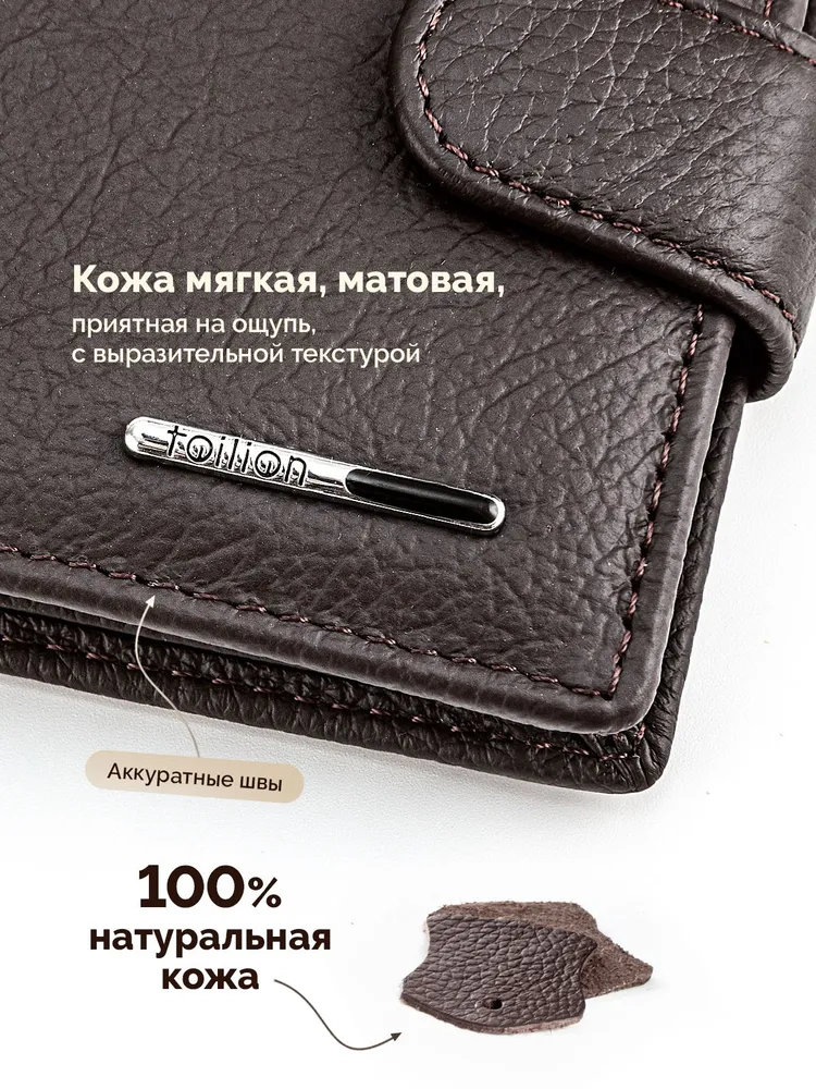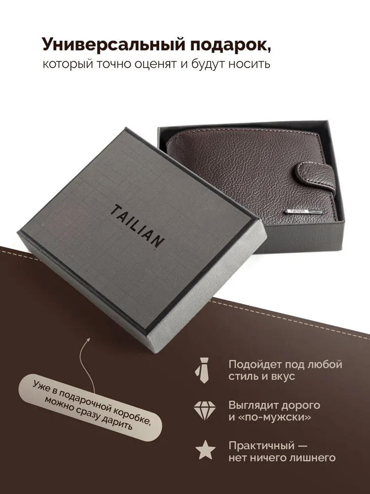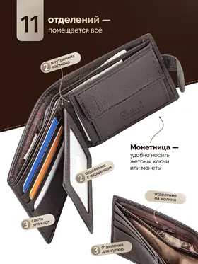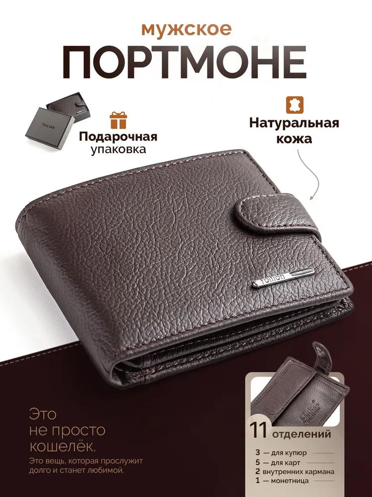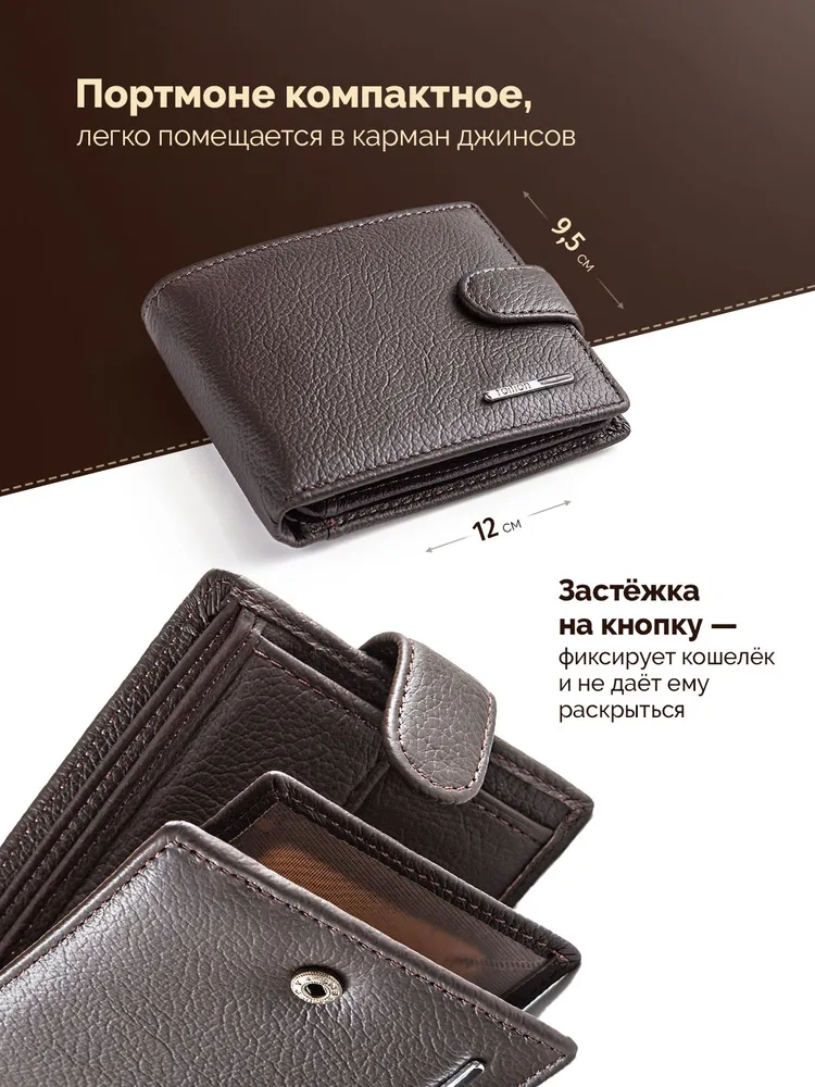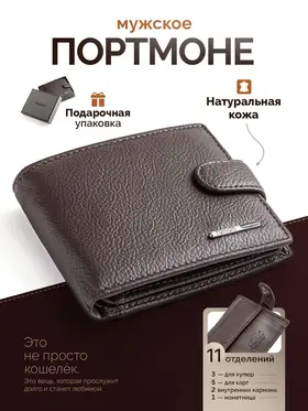 Кошелек портмоне из натуральной кожи Кошелек портмоне из натуральной кожи маленький - стильный и практичный спутник в повседневной жизни любого мужчины или подростка. Портмоне компактный и вместительный, что позволяет с легкостью разместить купюры, монеты, банковские карточки, карты, кредитницы. Благодаря своему небольшому размеру, он без проблем помещается в любой карман вашей одежды. Вы сможете всегда иметь при себе все необходимые деньги и карточки, не занимая лишнего места. А также он изготовлен из высококачественной натуральной кожи и прослужит вам долгие годы, сохраняя свою привлекательность и идеальное состояние. Этот удобный и надежный аксессуар станет незаменимым помощником в организации вашей финансовой жизни. Независимо от возраста или стиля мужской классический бумажник будет смотреться стильно и подчеркивать вашу индивидуальность. Данный мужской аксессуар подойдет как для повседневной жизни, так и для бизнес-встреч. Кошелек в подарочной коробке станет идеальным подарком для каждого мужчины или подростка на любой повод.