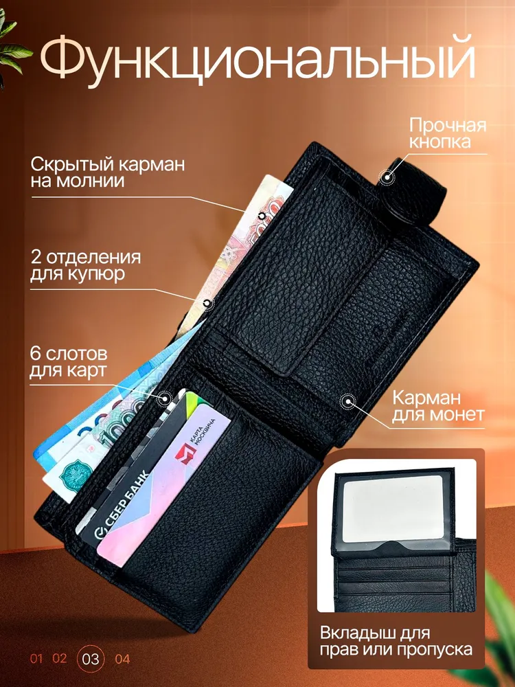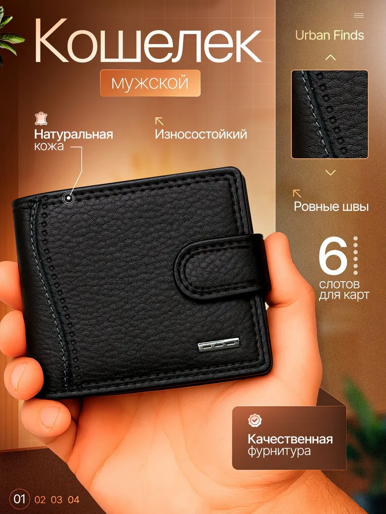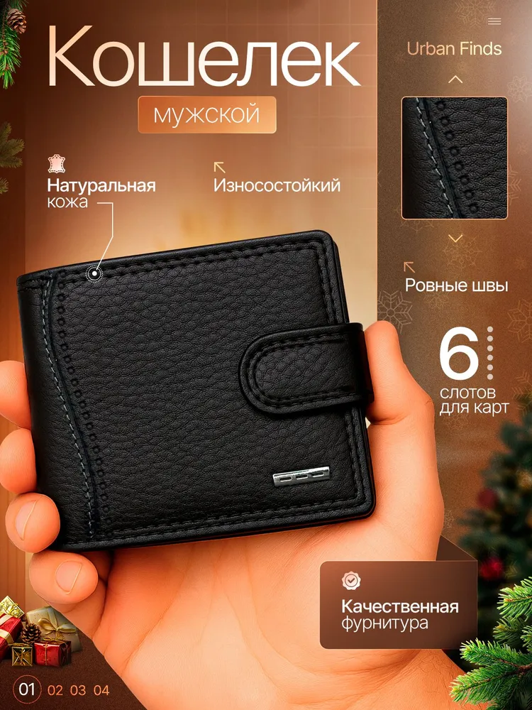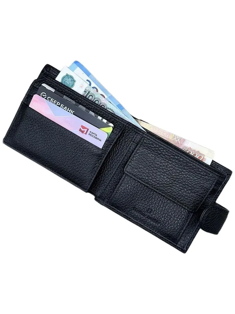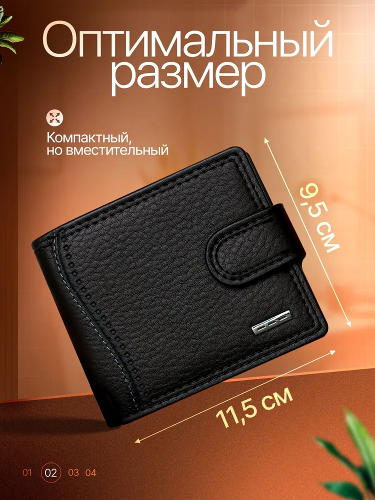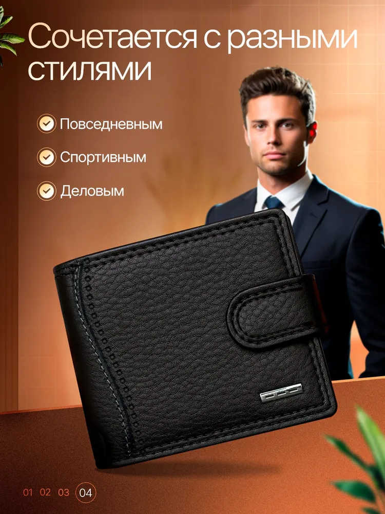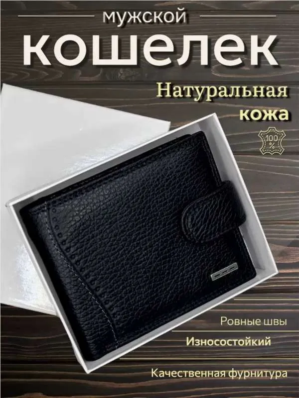 МУЖСКОЙ СТИЛЬНЫЙ КОШЕЛЕК Кожаный мужской кошелек – это именно то, что вам нужно! Этот аксессуар создан для тех, кто ценит стиль и надежность в каждой детали. 1. Высококачественные материалы: Кошелек изготовлен из натуральной кожи, что гарантирует его долговечность и износостойкость. Кожа обладает приятной текстурой и со временем становится только красивее, подчеркивая ваш индивидуальный стиль. 2. Удобная надежная застежка обеспечивает легкий доступ к вашим картам и наличным. 3. Элегантный и современный дизайн: Черный цвет и лаконичные линии делают этот кошелек универсальным аксессуаром, он легко сочетается с любым стилем одежды, добавляя нотку строгости и стиля. 4. Компактные размеры и функциональность: Несмотря на свои небольшие размеры, кошелек из вмещает все необходимые карты, наличные и документы. Он легко помещается в кармане или сумке, не занимая много места, что делает его идеальным спутником для активного образа жизни. 5. Идеальный подарок для мужчин- кошелек станет отличным подарком для вашего друга, брата или коллеги.