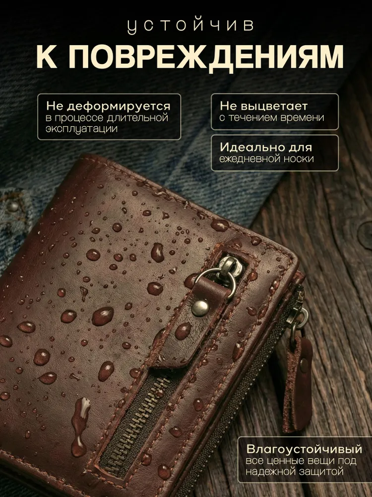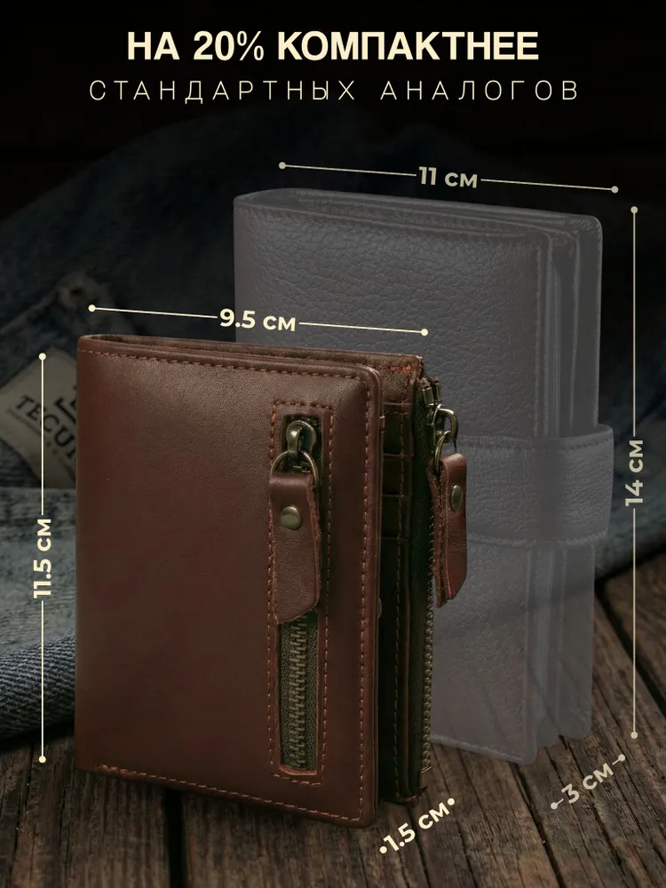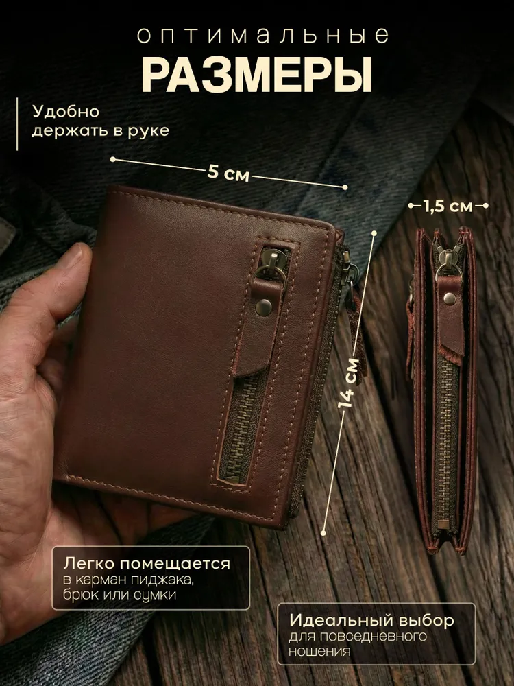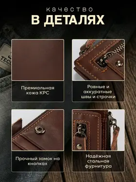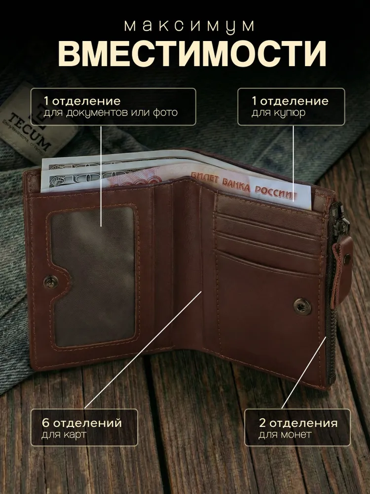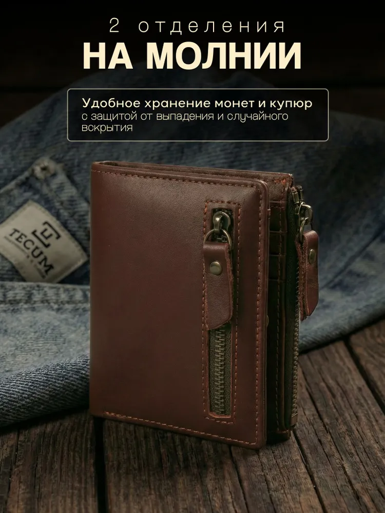 Незаменимый мужской аксессуар. - Натуральная кожа - Удобный и функциональный - Премиальное качество Узнайте больше в описании ↓ Стильный кошелек из натуральной кожи. Полезный мужской аксессуар для всех, кто хочет держать важные мелочи, карты и вещи всегда под рукой. Натуральная кожа, классический и строгий внешний вид - все это подчеркнет ваш статус и хороший вкус. Компактный. При своей высокой функциональности, кошелек занимает весьма мало места в кармане, сумке или рюкзаке. Внешняя аккуратная молния позволяет вместить дополнительные важные мелочи или монеты. Прочный и надежный. Материал кошелька надежный, износостойкий, не поддается стиранию и механическим повреждениям. Качественная прошивка и фурнитура позволит прослужить кошельку долгое время. Вместительный. Несмотря на компактный размер, в бумажнике 10 отделений для прав, карт, купюр, документов и мелочи! Качество на лицо. Красивая расцветка в коричневом цвете понравятся каждому любителю оригинальных аксессуаров. Кожа отличается мягкостью и приятна на ощупь, обладает высокой прочностью и устойчивостью к повреждениям и влаге. Идеальный мужской презент! Вы можете использовать кошелек как повседневно, так и в качестве презента! Красивая и плотная подарочная коробка, в которой вы смело можете дарить кошелек дорогим, важным и близким вашим людям. Подчеркни свой стиль и статус Аксессуар, который говорит о вкусе без слов. Лаконичный дизайн, качественные материалы и удобство — всё, что нужно современному мужчине. Добро пожаловать в наш магазин бренда TECUM! Пользуйтесь с удовольствием нашими изделиями! Кликайте на фото, заходите к нам на страничку и выбирайте подходящие для вас или ваших близких аксессуары нашего магазина под ваш стиль жизни. Спасибо за выбор нашего магазина. Ваш бренд TECUM!