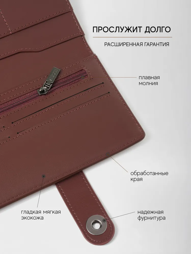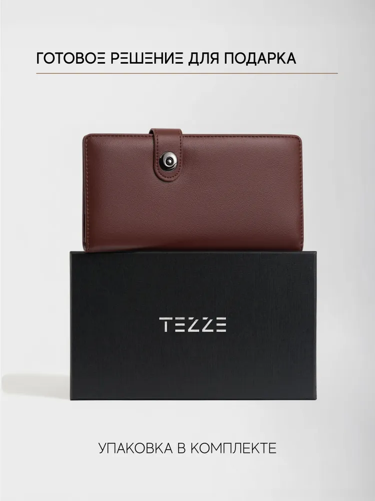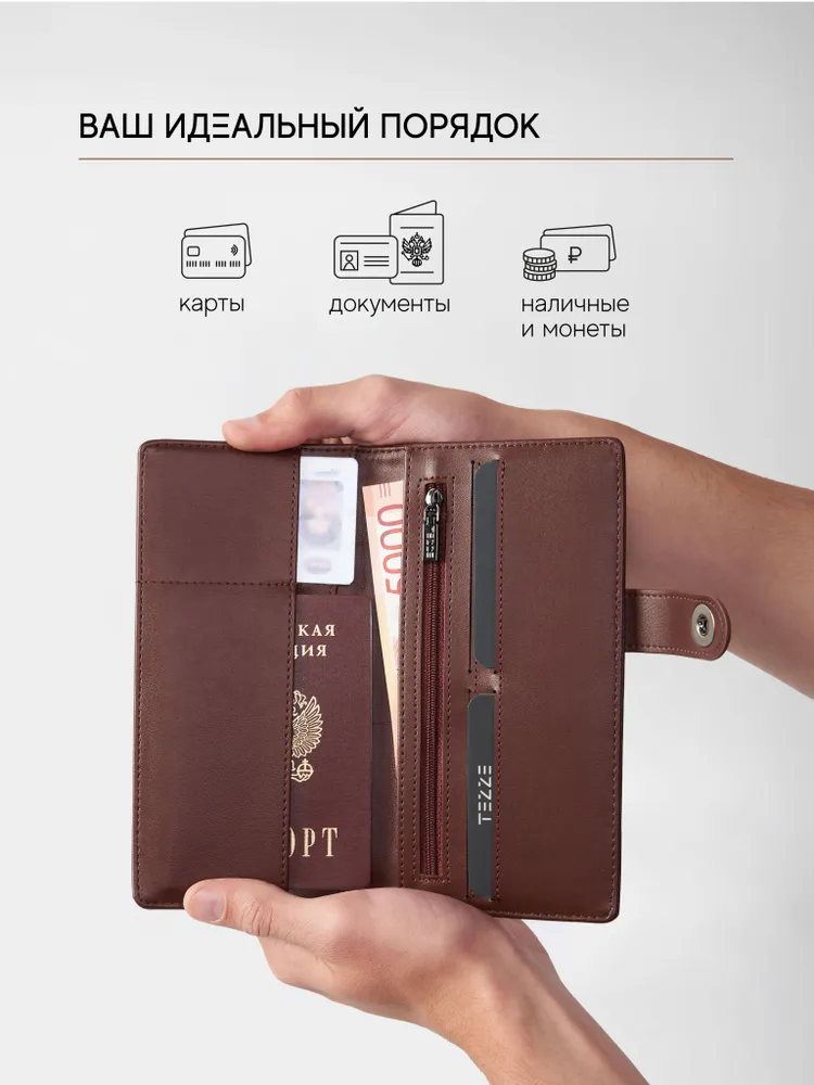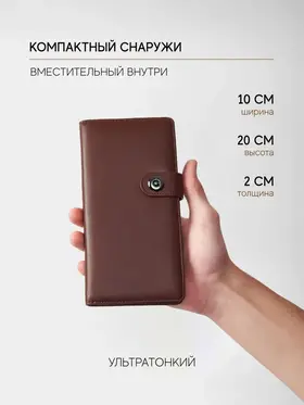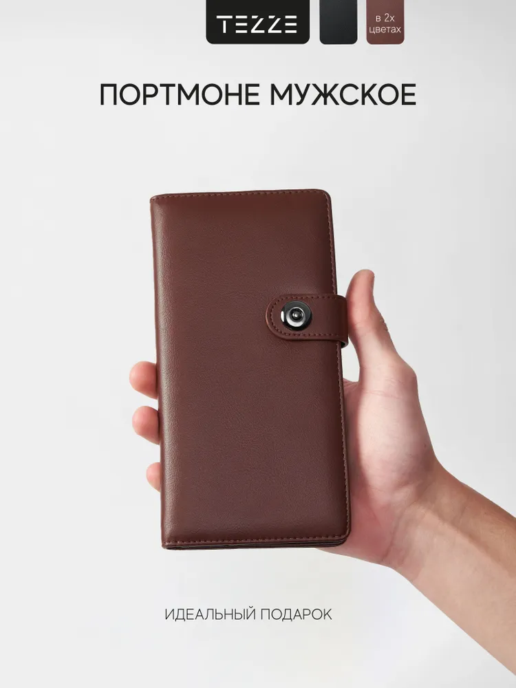 Коричневый мужской классический кошелёк на кнопке от TEZZE — тонкий формат, максимум порядка. Классический компактный кошелёк в коричневом цвете, который вмещает паспорт и документы на автомобиль, оставаясь при этом тонким и аккуратным. Надёжное закрытие на кнопку фиксирует содержимое и исключает выпадение бумаг, а отсутствие логотипов и декоративных строчек делает модель универсальной — она гармонично впишется в любой стиль, от делового до повседневного. Выполнен из качественной искусственной кожи с максимальным сходством с натуральной — приятной на ощупь, немаркой и легко поддающейся уходу. Высокая износостойкость и гарантия производителя обеспечивают долгие годы безупречной службы. Ключевые преимущества: Формат, вмещающий паспорт и документы на автомобиль — всё под рукой. При большом внутреннем объёме остаётся тонким — не утяжеляет карман. Закрытие на кнопку — надёжная фиксация содержимого. Минимализм без логотипов и декоративных строчек — подходит к любому стилю. Искусственная кожа с максимально естественной текстурой — эстетика натуральной кожи без её недостатков. Гарантия качества и высокая износостойкость — хранит аккуратный вид долгие годы. Лёгкий уход — достаточно протереть влажной мягкой тканью.