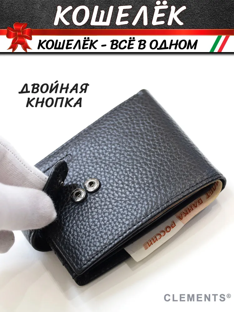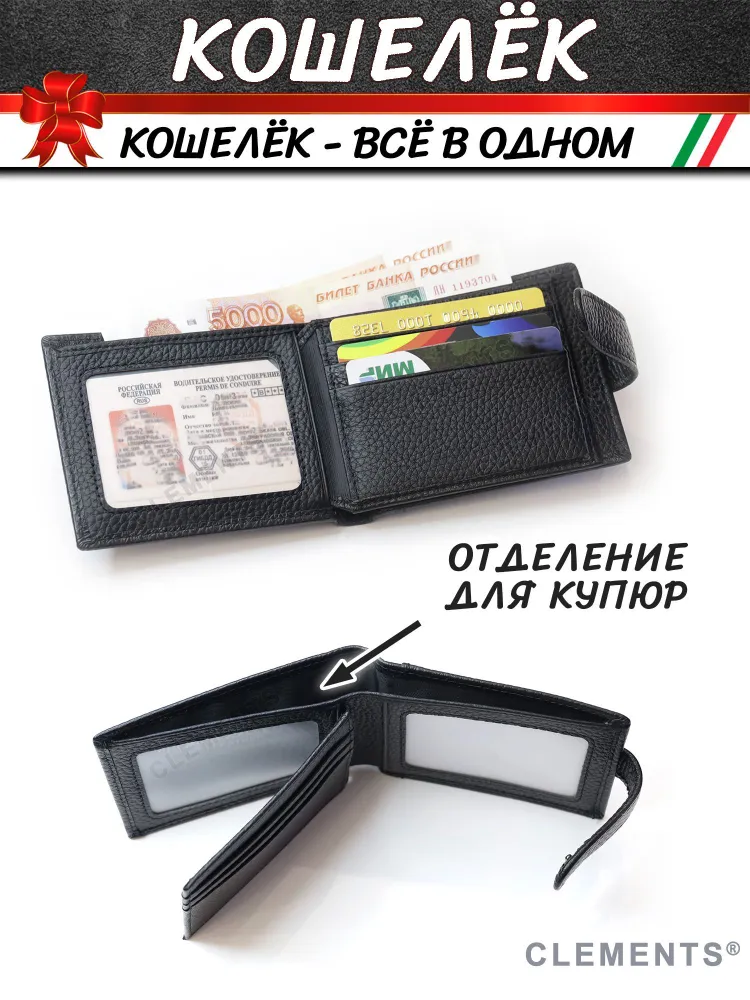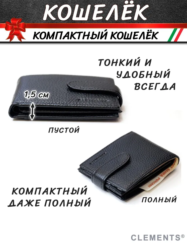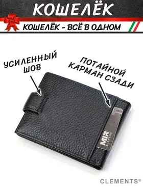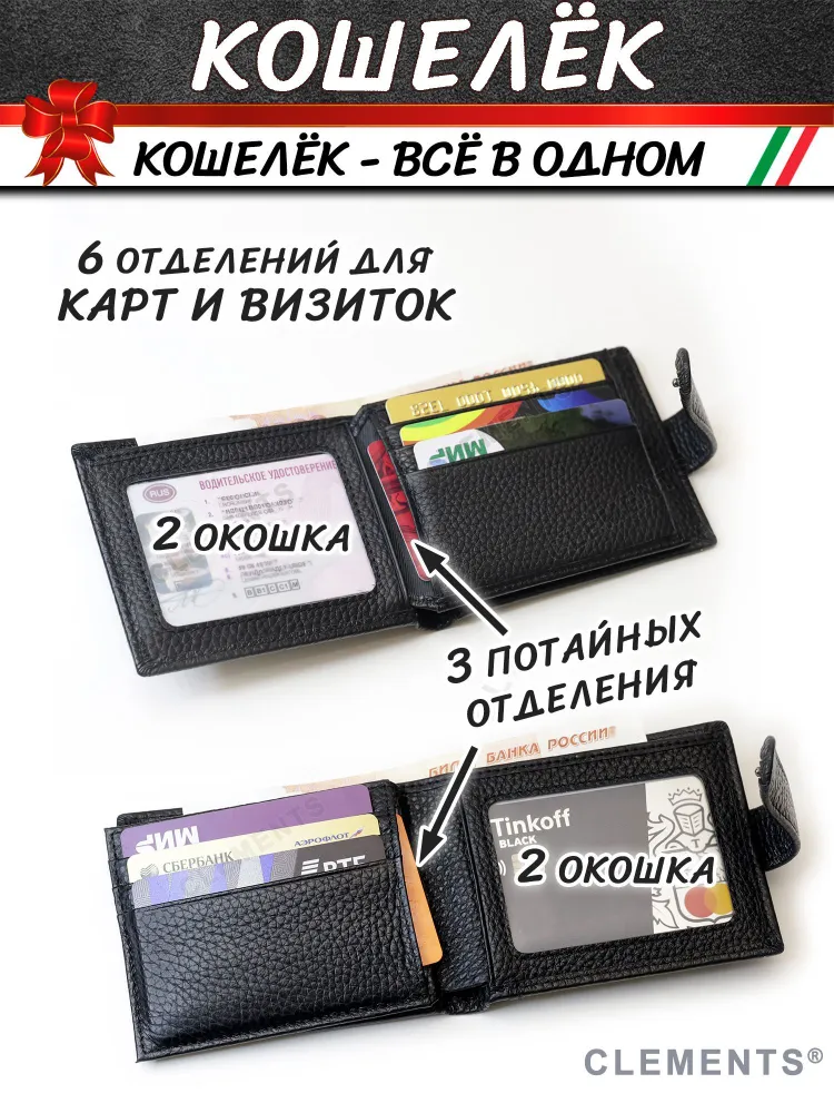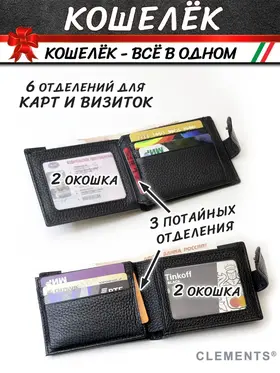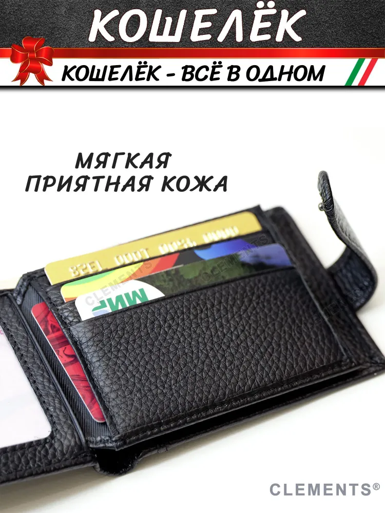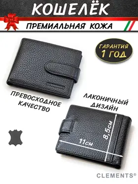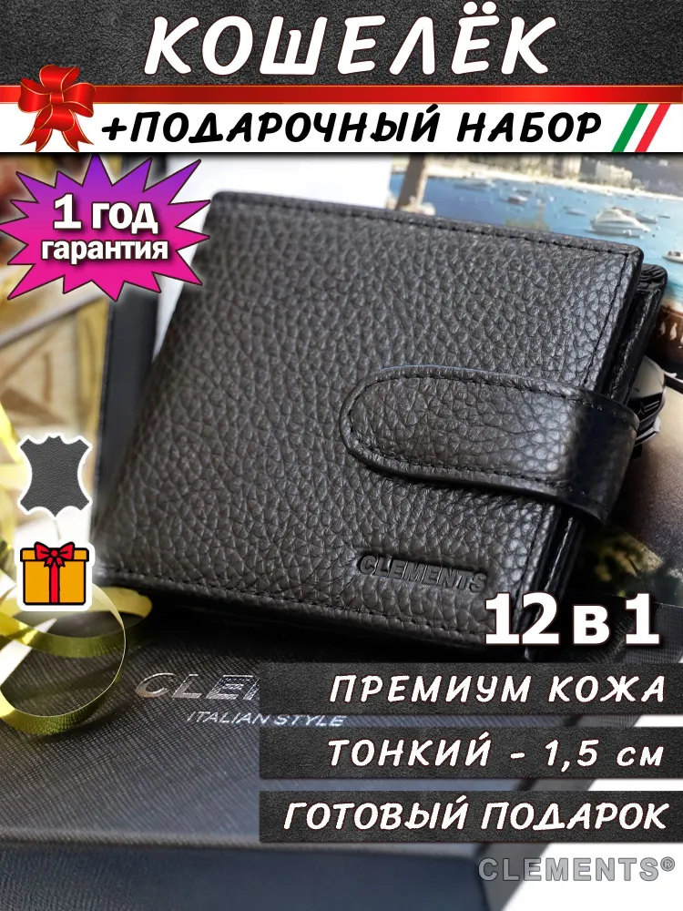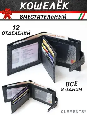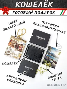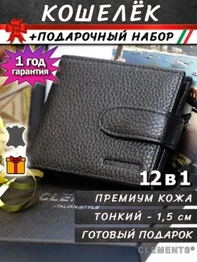 Очень качественный подарочный набор для мужчин - Кошелек мужской мини из натуральной кожи премиум под брендом Clements это модный аксессуар безупречного качества в современном стиле. Не смотря на свои компактные размеры, наш черный кожаный бумажник очень функциональный, он имеет 12 отделений: 6 карманов для карт и визиток, удобные скрытые отсеки для чего-угодно, два кармана с окошком для прав водительских или фото, страховки и прочих документов, а также одно большое вместительное отделение под деньги для купюр. Есть несколько потайных карманов. Компания Clements делает упор прежде всего на качество и удобство своих изделий. Вы будете очень довольны, если купите наши аксессуары, у которых просто нет аналогов в России. Думаете, что подарить мужчине? Наш премиальный бумажник мужской - это идеальный подарок мужу и брату, папе и дедушке, презент коллеге и боссу, а также другу. Наш кожаный кошелек обязательно понравится любимому парню. Данное портмоне ручной работы настолько компактное, что его можно использовать, как маленький кошелёк для подростка. Это будет лучшая покупка на др и не только на день рождения или 23 февраля, но и на Новый год 24-25, День святого Валентина, на день водителя или 9 мая, 14 февраля и даже годовщину. Портмоне имеет большой съемный прозрачный вкладыш для автодокументов водителя. Его часто берут друзьям на подарок. И хотя наш брендовый wallet - кошелек ручной работы самый тонкий (всего 1,5 см), в нем есть полноценная визитница - картхолдер, чтобы носить банковские карточки. В набор входит сам брендовый кошелёк кожаный черный мягкий в красивой упаковке без рисунка с принтом Clements Italian Style (Итальянский стиль) и всё, чтобы этот аксессуар красиво преподнести. На данный кошелек мы предоставляем гарантию 1 год. Способы ее получения прописаны в гарантийном талоне. Успейте купить идеальный подарок себе или парню на любой праздник.