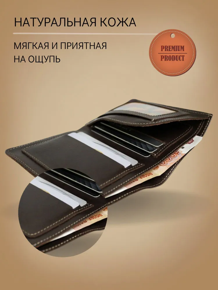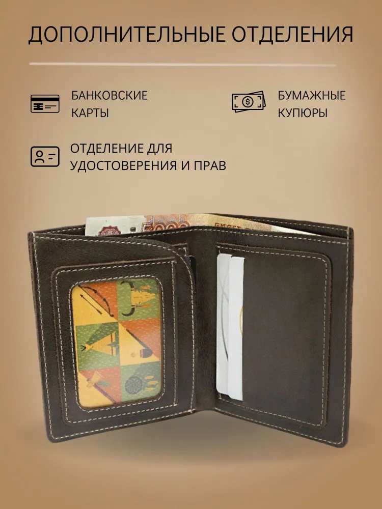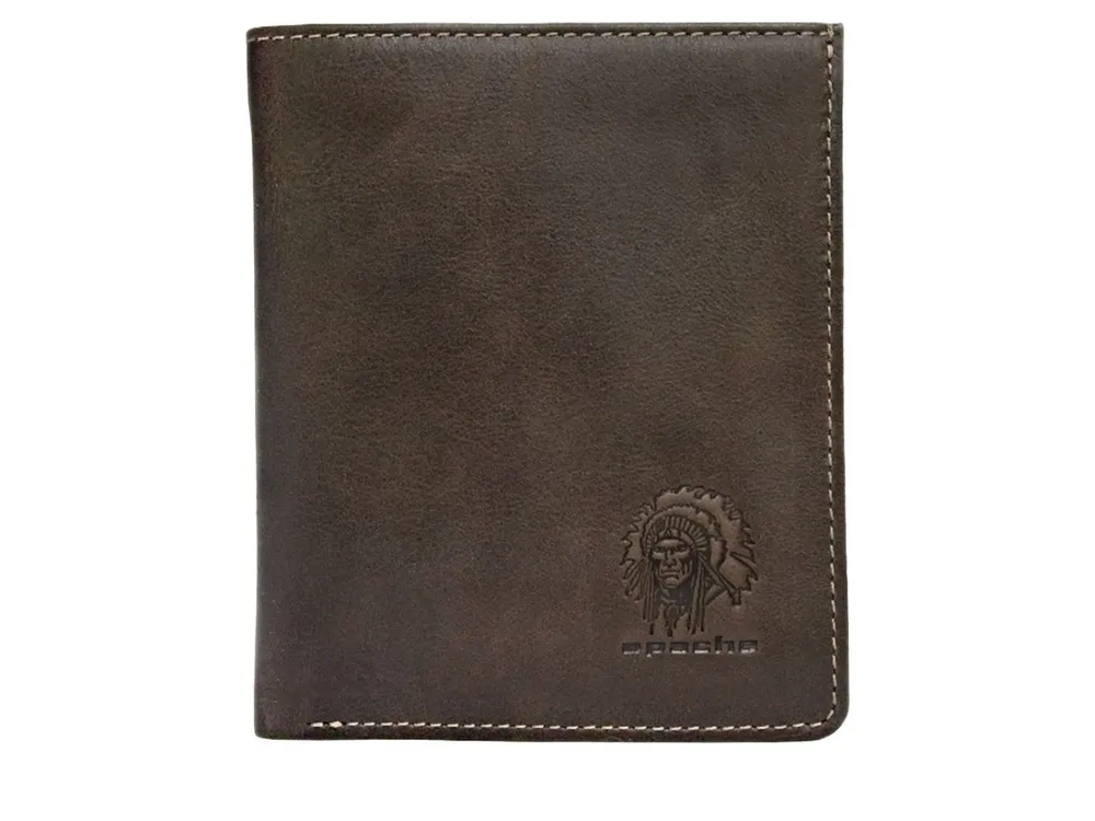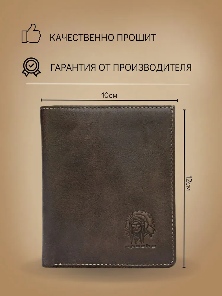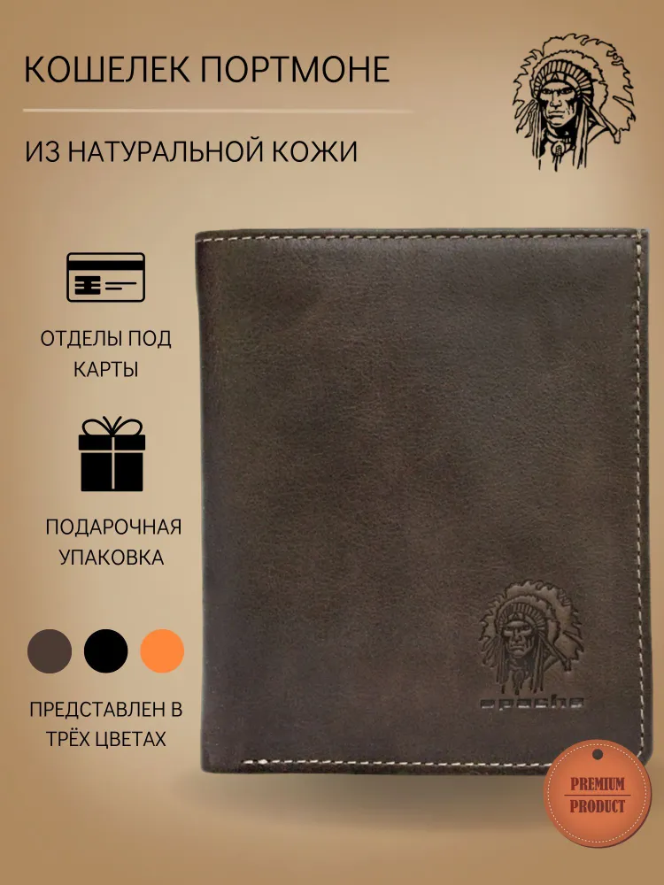 Кошелек портмоне мужское из натуральной кожи ВП-А Apache коричневое Портмоне кошелёк выполнено из натуральной кожи премиум качества. Украшено тиснением с логотипом бренда Apache. Внутри портмоне одно отделение для купюр, два накладных кармана для кредитных, пластиковых карт. На фигурном полукармане накладной пластиковый карман отделанный кожей. Кожа надежно прошита крепкой нитью и очень приятна на ощупь. Кошелек портмоне упаковано в дизайнерскую коробку из плотного картона. Практичный и хороший подарок для папы, дедушки, мужа, мамы, брата, коллеги или партнёра на 23 февраля, День Рождения и Новый год!