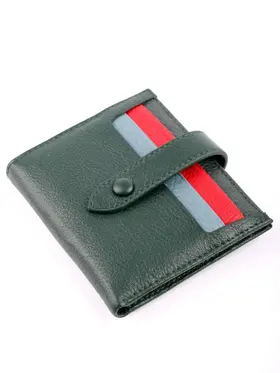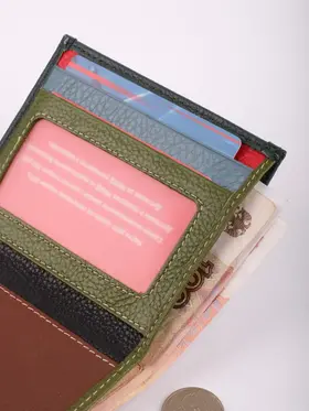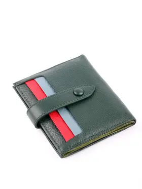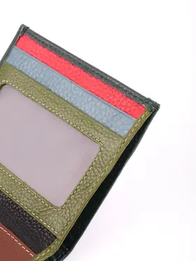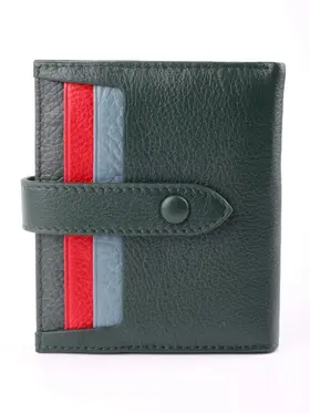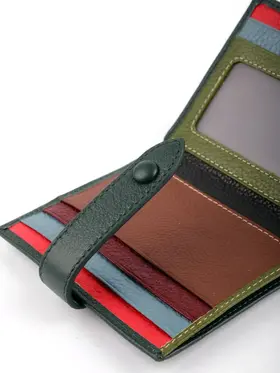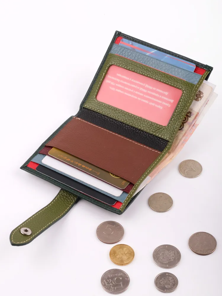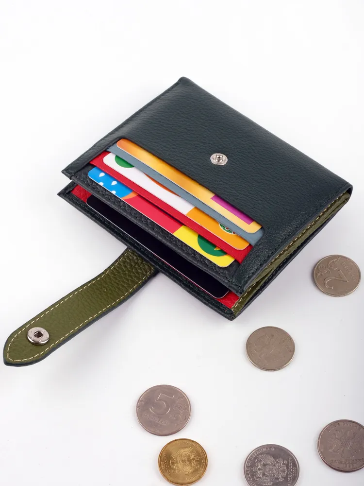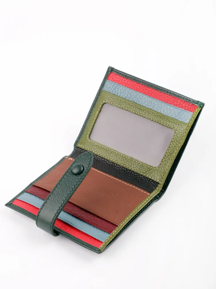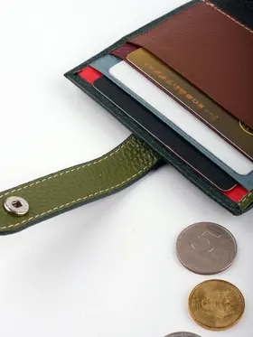 Кошелек - Кредитница из натуральной итальянской кожи для Ваших пластиковых карт, визиток, монет и купюр. Стильный и компактный аксессуар выполнен в оригинальном дизайнерском исполнении с разноцветными элементами кармашков, которые не повторяются дважды, что придает индивидуальность изделию. На лицевой стороне 3 кармашка для банковских карт. С тыльной стороны карман на молнии для всяких мелочей. Внутри: 4 отсеков для пластиковых карт и 2 потайных кармана, 1 карман-окошко. С торца полноценное отделение для купюр. Всего 12 отделений. Закрывается хлястиком на кнопку. Поставляется в подарочной коробке.