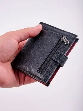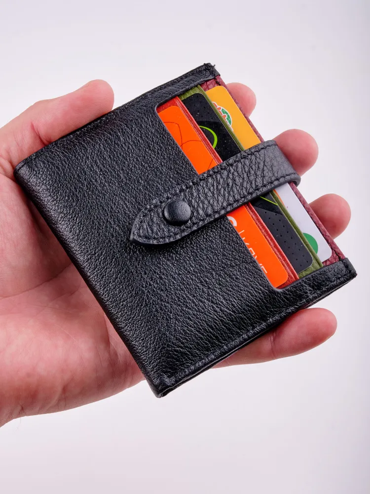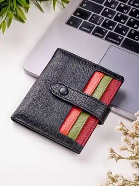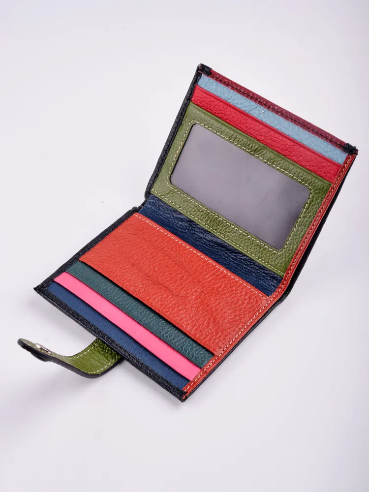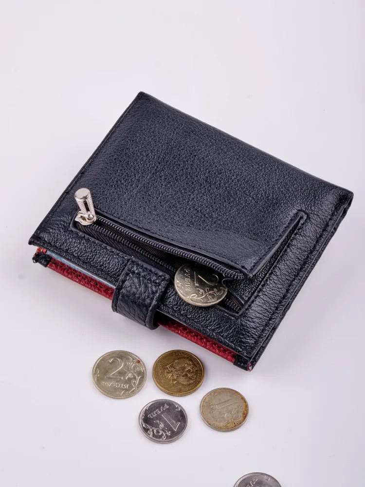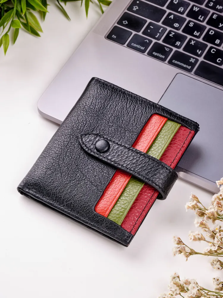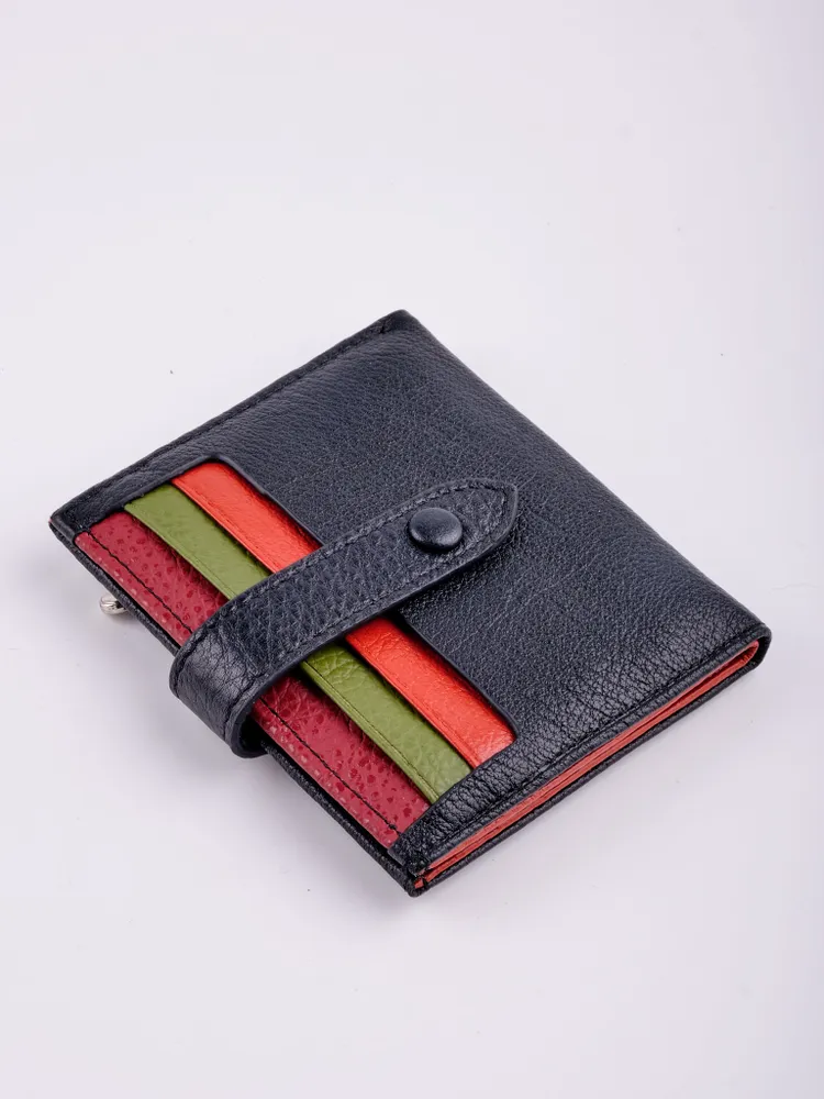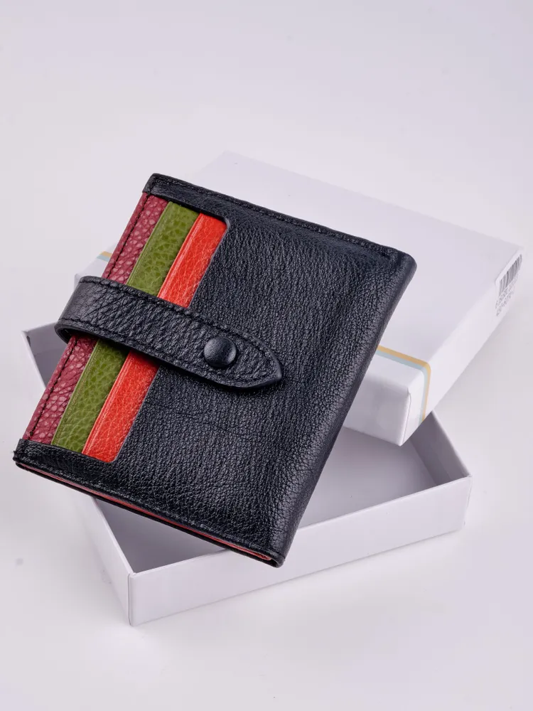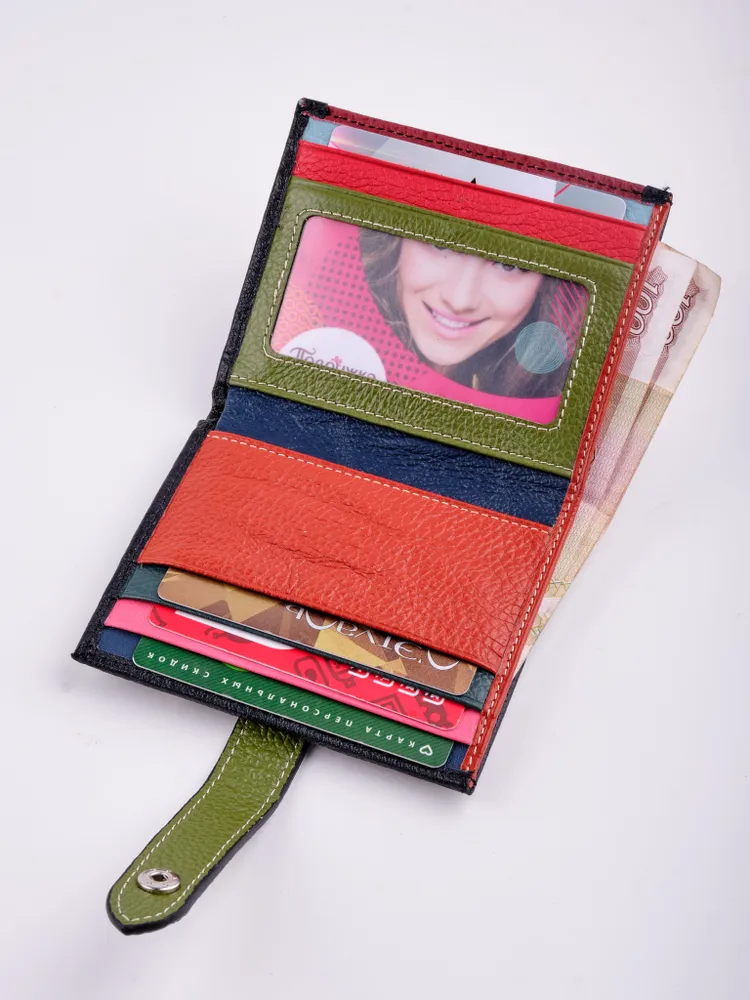 Кошелек - Кредитница из натуральной итальянской кожи для Ваших пластиковых карт, визиток, монет и купюр. Стильный и компактный аксессуар выполнен в оригинальном дизайнерском исполнении с разноцветными элементами кармашков, которые не повторяются дважды, что придает индивидуальность изделию. На лицевой стороне 3 кармашка для банковских карт. С тыльной стороны карман на молнии для всяких мелочей. Внутри: 4 отсеков для пластиковых карт и 2 потайных кармана, 1 карман-окошко. С торца полноценное отделение для купюр. Всего 12 отделений. Закрывается хлястиком на кнопку. Поставляется в подарочной коробке.