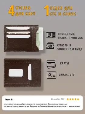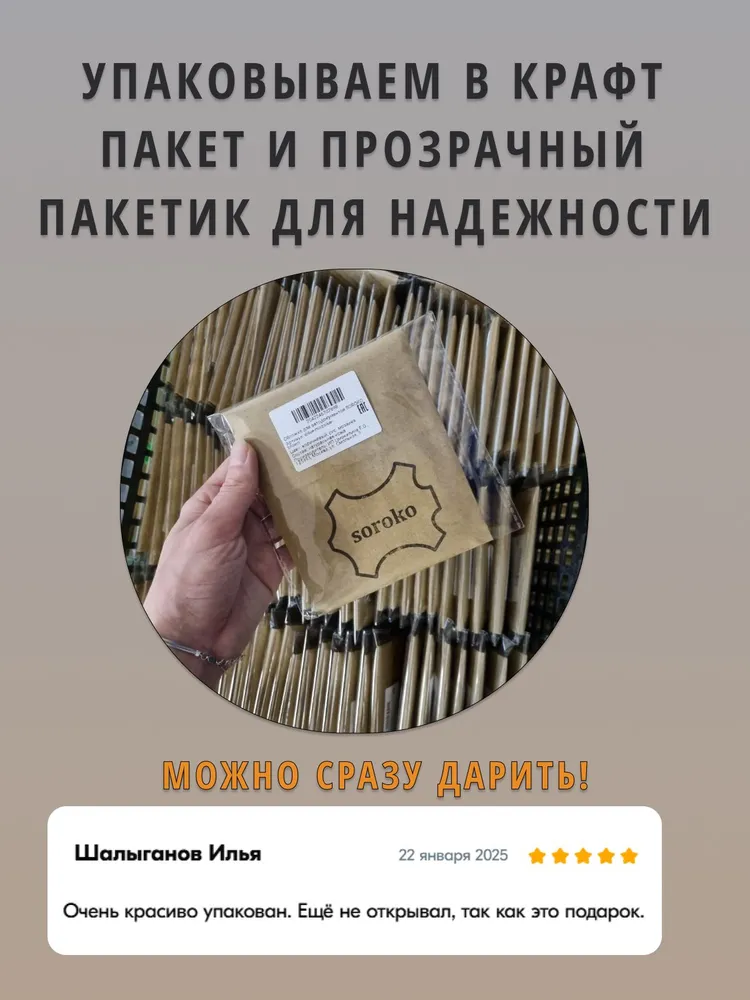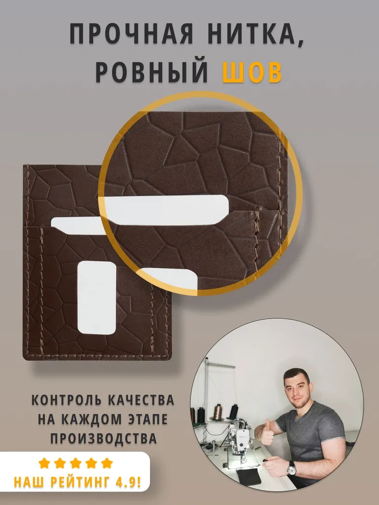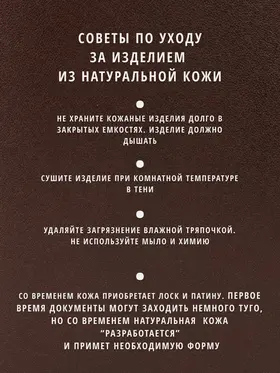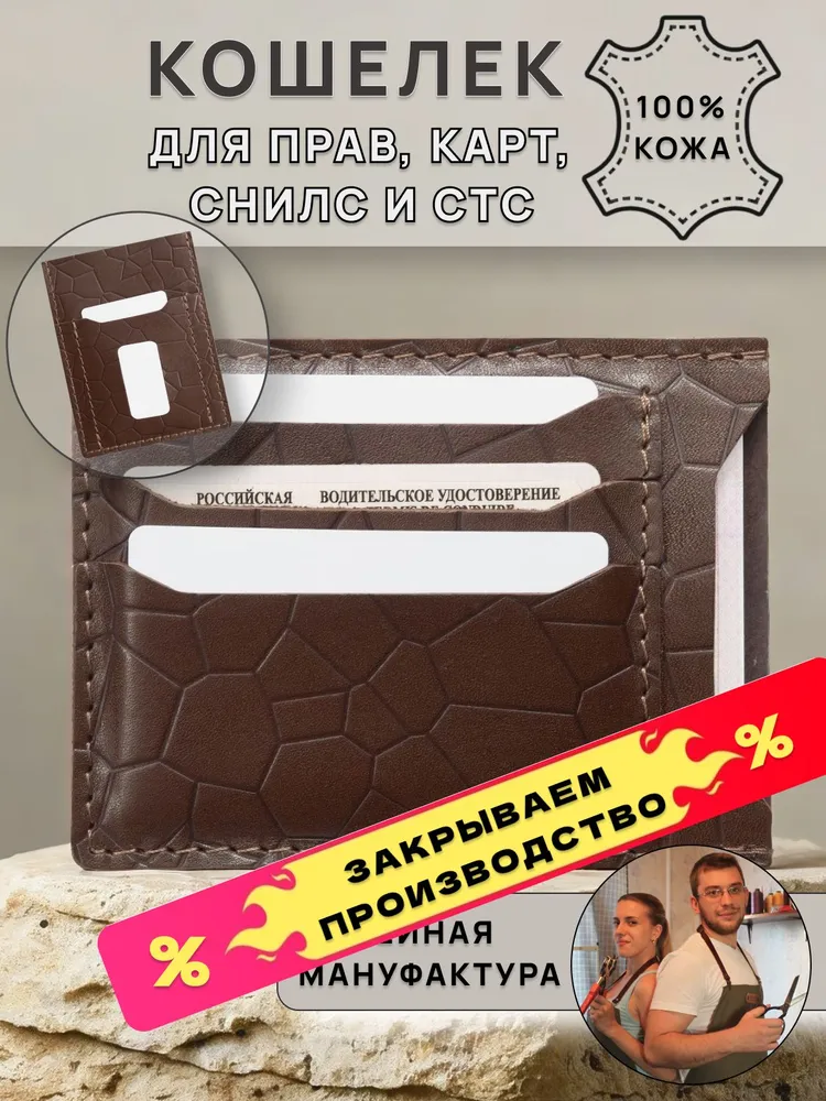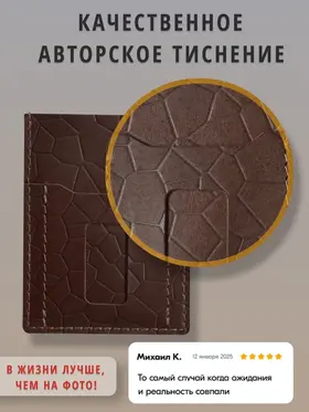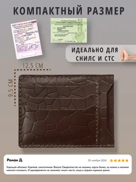 Уважаемый покупатель! Мы гордимся тем, что являемся производителями всей нашей продукции. Наши изделия создаются на собственном производстве в России, что позволяет нам контролировать качество на каждом этапе. Обложка для автодокументов выполнена из натуральной бычьей кожи. Со временем она приобретает винтажный вид, что лишь подчеркивает её уникальность. На данном картхолдере рисунок мозаика. Холдер для карт и водительского удостоверения имеет размер 12,5x9,5 см. С одной стороны кардхолдера расположены три отсека для карт, в центре визитницы— отдел для СНИЛС и СТС, а сзади кредитницы — для прав или проездного. Эта документница станет отличным подарком для подруги, мамы, коллеги или близкого человека на 8 Марта, Новый год или день рождения. А бумажник для прав можно подарить отцу, сыну, парню или мужу. Мы с радостью ждем ваших отзывов на кожаную карточницу и всегда открыты для обратной связи. Будем рады сшить для вас что-то особенное. С уважением, Никита и Катерина SOROKO.