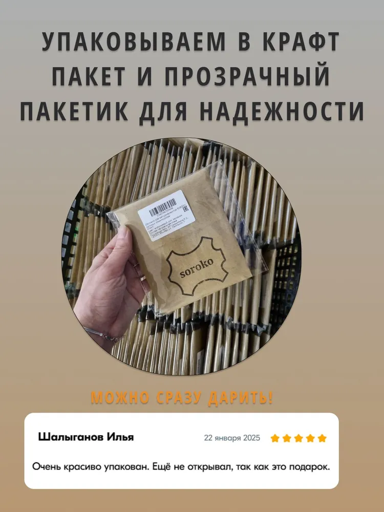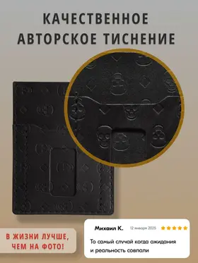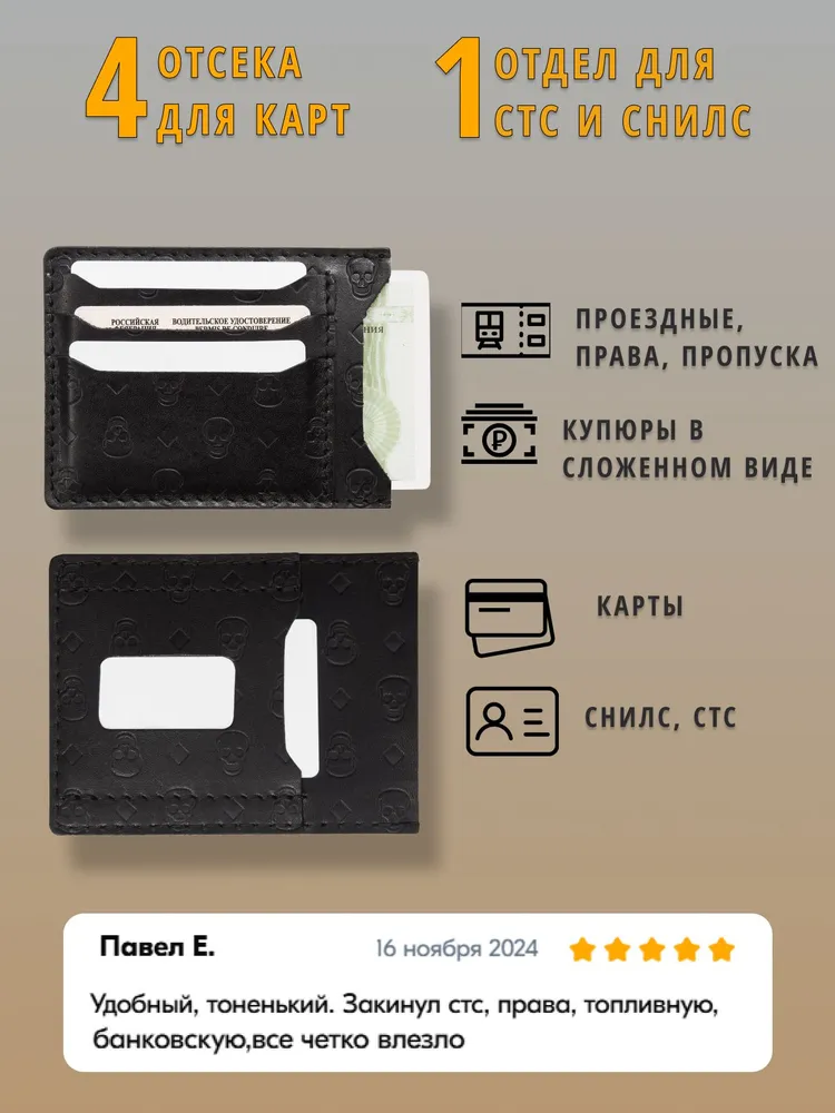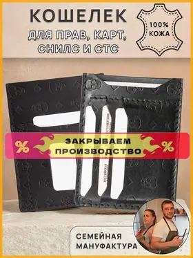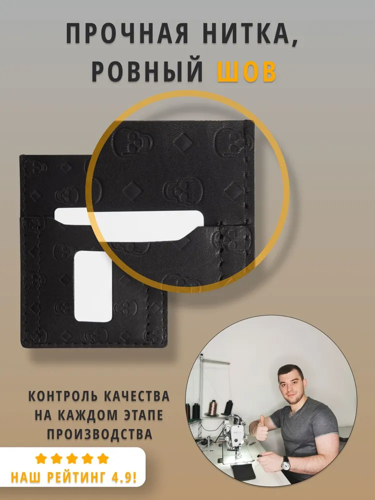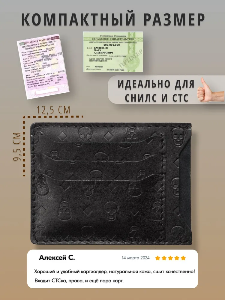 Уважаемый покупатель! Мы гордимся тем, что являемся производителями всей нашей продукции. Наши изделия создаются на собственном производстве в России, что позволяет нам контролировать качество на каждом этапе. Обложка для автодокументов выполнена из натуральной бычьей кожи. Со временем она приобретает винтажный вид, что лишь подчеркивает её уникальность. На данном картхолдере рисунок черепа. Холдер для карт и водительского удостоверения имеет размер 12,5x9,5 см. С одной стороны визитницы расположены три отсека для карт, в центре кредитницы— отдел для СНИЛС и СТС, а сзади карточницы — для прав или проездного. Эта документница станет отличным подарком для подруги, мамы, коллеги или близкого человека на 8 Марта, Новый год или день рождения. А бумажник для прав можно подарить отцу, сыну, парню или мужу. Мы с радостью ждем ваших отзывов на кардхолдер и всегда открыты для обратной связи. Будем рады сшить для вас что-то особенное. С уважением, Никита и Катерина SOROKO.