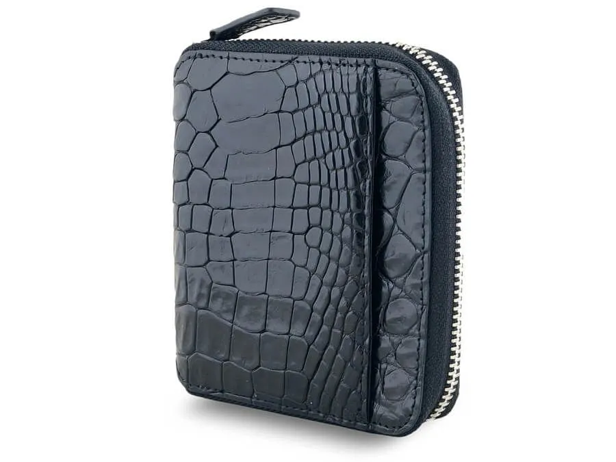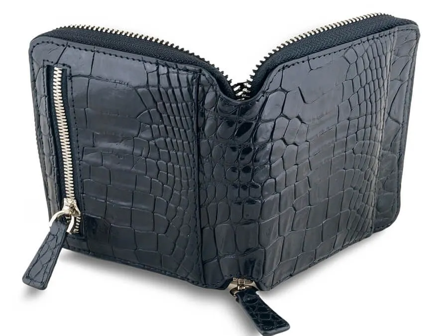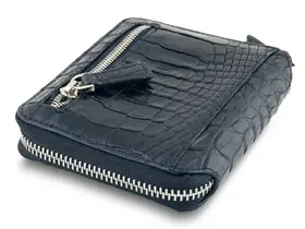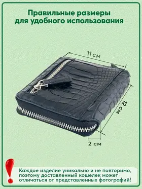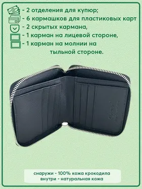 Эксклюзивный кошелек на молнии из натуральной кожи сиамского крокодила: оригинальный подарок для стильных людей Необычный кошелек на молнии по периметру из настоящей кожи сиамского крокодила черного цвета станет оригинальным подарком и верным спутником на многие годы для любого современного человека. Этот эксклюзивный кожаный мужской кошелек изготовлен из гладкой и мягкой крокодиловой кожи (лат. Crocodylus siamensis), полученной с брюха и бочков рептилии. Внутри применяется высококачественная телячья кожа, что подчеркивает его статус и надежность. Функциональные особенности этого стильного кошелька включают: - 2 отделения для купюр, - 6 карманов для пластиковых карт, - 2 скрытых кармана, - внешний карман на лицевой стороне, - карман на молнии на тыльной стороне. Производство осуществляется в Таиланде, где мастера тщательно обрабатывают натуральные материалы, создавая поистине уникальные изделия. Обратите внимание, что благодаря натуральности используемых материалов, каждое изделие является уникальным и может отличаться по внешнему виду, фактуре и рисунку кожи от представленных на фотографиях. Натуральная кожа крокодила (каймана, аллигатора) — это уникальный природный материал с выдающимися характеристиками. Она признается одной из самых красивых и престижных, а также отличается высокой прочностью и долговечностью. Хотя изделия из натуральной кожи крокодила часто воспринимаются как атрибут богатых, мы стремимся сделать их доступными для широкой аудитории. Мы гарантируем, что все наши изделия изготовлены исключительно из настоящей натуральной кожи, как указано в описании, и легальность происхождения кожи подтверждается приложенным сертификатом. Подарите этот эксклюзивный кошелек себе или своим близким и подчеркните их индивидуальность и стиль!