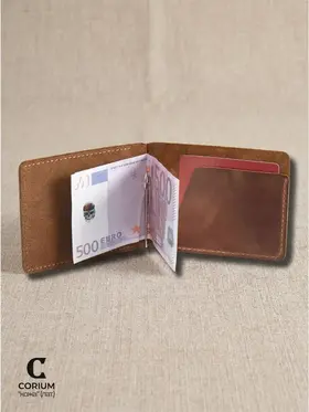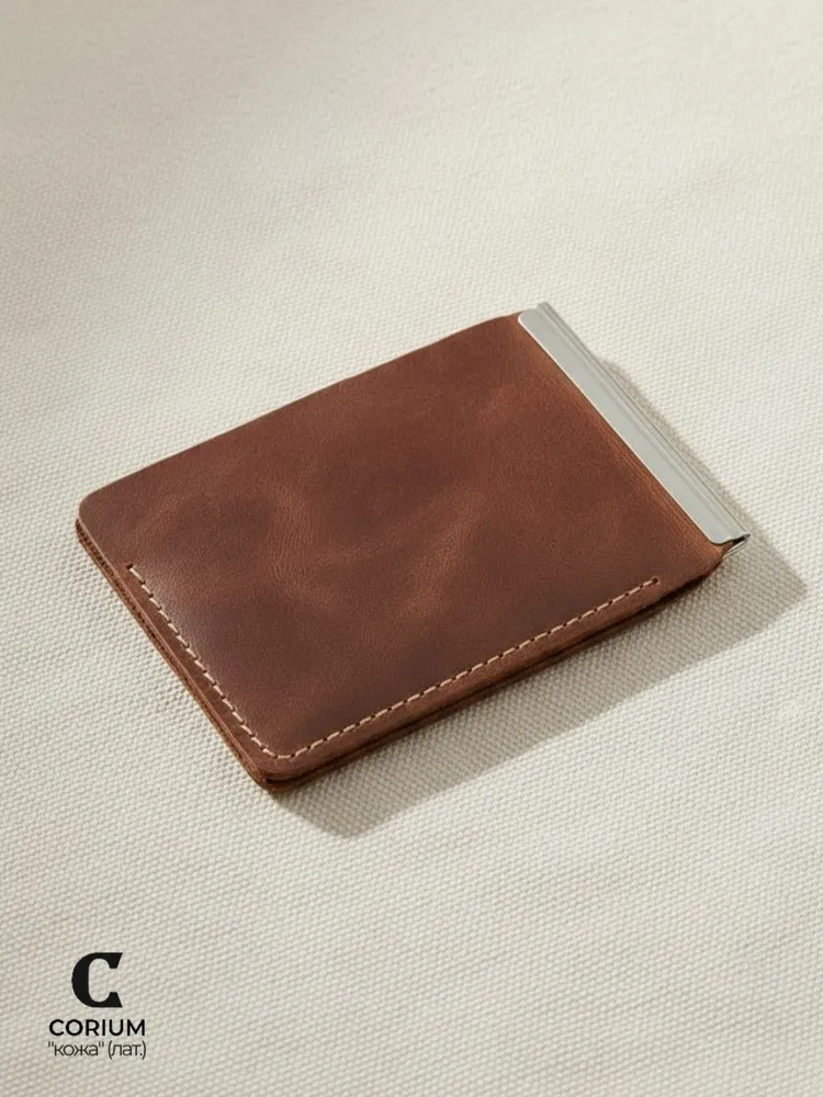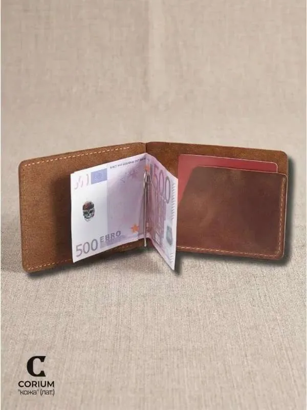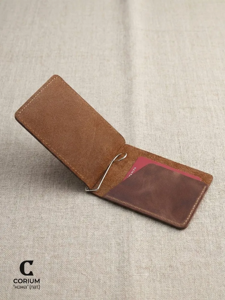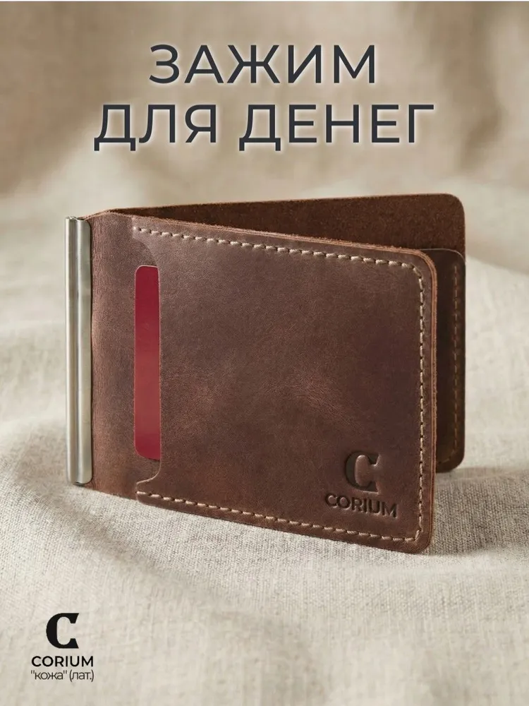 Кожаный зажим для денег CORIUM, натуральная кожа, темно-коричневый Зажим для денег с 2 кожаными карманами для пластиковых карт: внешним и внутренним. Внутри металлический зажим для денежных купюр. Зажим для денег - отличный подарок - практичный и оригинальный! Материал: натуральная кожа Размеры: 112 х 80 х 8 мм Производство: Россия Натуральная кожа Натуральная кожа Пуллап – кожа премиум с восковым покрытием, обладает необычной окраской поверхности и мягким эффектом дымки.