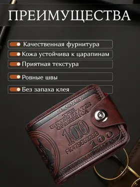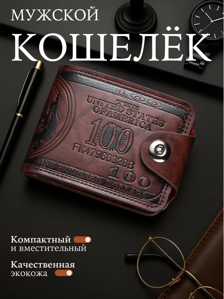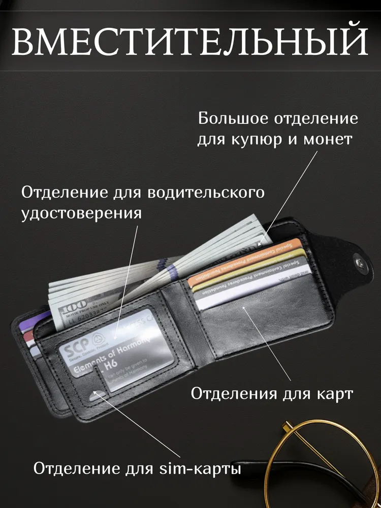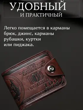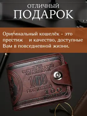 Ищете оригинальный подарок мужчине на Новый год, День святого Валентина, 23 февраля? Кошелек мужской из качественной эко кожи – это не просто аксессуар, он станет стильным и практичным решением для современного мужчины. Этот портмоне не только идеально подойдет для хранения кредитных карт и денежных купюр, но и станет отличным бумажником для вашего ежедневного использования. Никогда не подведет вас в самый неподходящий момент, кошелек мужской создан для тех, кто ценит роскошь и надежность. Материал, из которой он изготовлен, является 100% натуральной эко кожей, что гарантирует ее долговечность и приятный на ощупь материал. Кошельки и кредитницы мужской - неотъемлемая часть мужских аксессуаров. Они не только позволяют вам элегантно дополнять ваш образ, но и облегчают организацию вашего пространства. Небольшие отделения, вмещающие все необходимое, включая монеты, карточки и наличные деньги, помогут держать все под рукой. Не секрет, что мужчины часто предпочитают классику и надежность, поэтому этот кошелек черного цвета станет идеальным выбором для вашего брата, парня, коллеги или сына. Однотонный дизайн придают ему статусный вид, который подчеркнет ваш безупречный стиль. Помимо эстетической составляющей, портмоне мужское также призвано облегчить вам повседневные заботы. Отделение для автодокументов позволит хранить их в надежности и порядке. Дополнительное отделение для монет идеально подойдет для хранения мелочи и облегчит поиск нужной суммы. Особое внимание стоит уделить деталям. Есть отделение на молнии, а сам кошелек закрывается на кнопку и дополнительно кошелек надежно сохраняет все ваши ценности внутри. Он прекрасен в своей простоте и практичности – идеальный вариант для водителя или для современного мужчины, который ценит комфорт и качество. Независимо от того, где и когда вам потребуется достать деньги или карту, этот кошелек всегда будет на вашем месте. кошелек мужской маленький. портмоне для документов мужское.