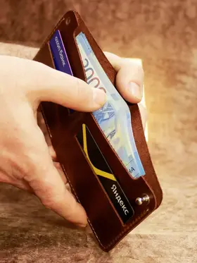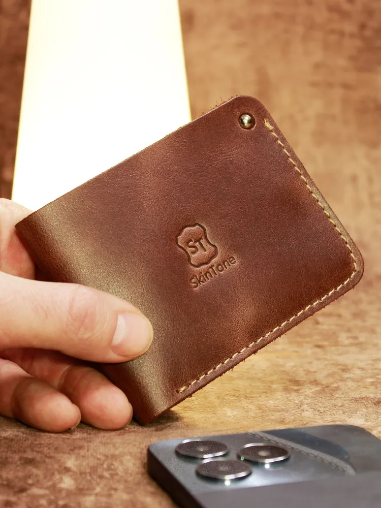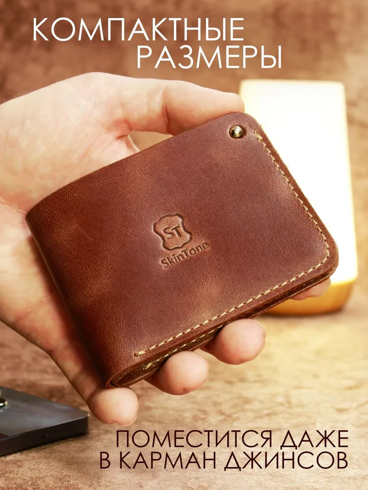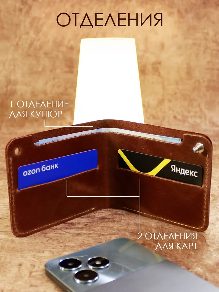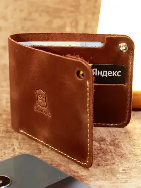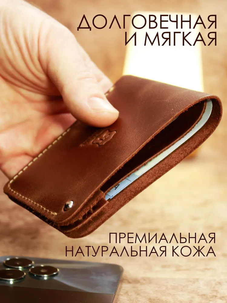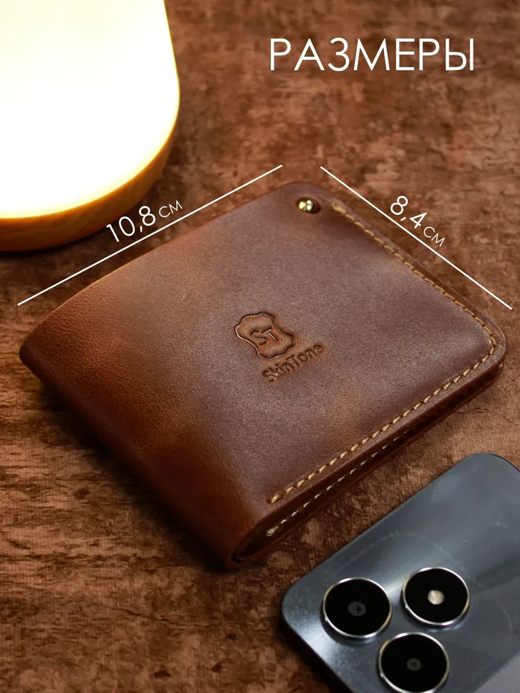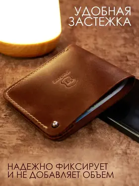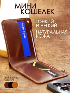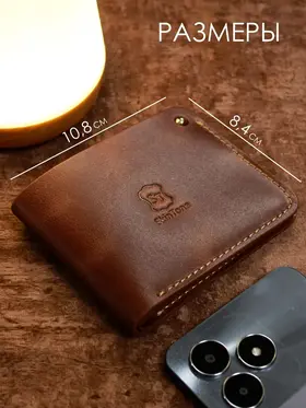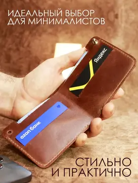 Идеальный размер для вашей ладони. Оцените безупречную компактность. Этот маленький кошелек мужской из натуральной кожи настолько продуман, что полностью помещается в руке. Он создан, чтобы освободить ваши карманы от громоздких вещей, предлагая элегантную альтернативу. Надежная застежка для сохранности денег. Его тонкость сравнима с современным смартфоном. Этот мини кошелек в технологии «Пулап» не создает неудобного объема даже в самом тонком кармане рубашки или брюк. Это — новый стандарт мужского портмоне. Элегантность в каждой детали. Легкость и изящество, которые говорят сами за себя. Удерживаемый двумя пальцами, этот кожаный кошелек мужской демонстрирует свою практичную легкость и безупречное качество прошивки. Ничего лишнего — только суть. Гибкость натуральной кожи. Настоящая натуральная кожа — живая и податливая. На фото видно, как кошелек принимает естественный изгиб, не теряя формы. Это гарантия долговечности и комфорта в использовании каждый день. Продуманная организация пространства. Внутри царит идеальный порядок. Одно отделение для купюр и два — для самых важных банковских карт. Этот бумажник мужской создан для тех, кто ценит функциональность и четкую организацию в деталях. Мини-кошелек ↑ Обложка ↑ Обложка ↑