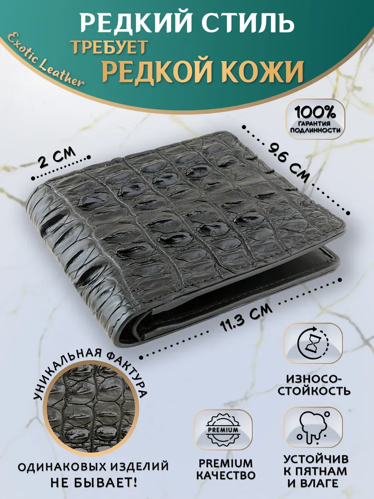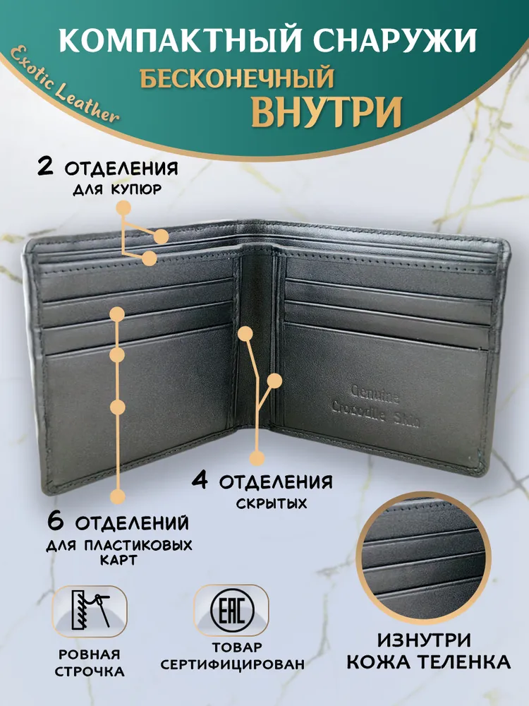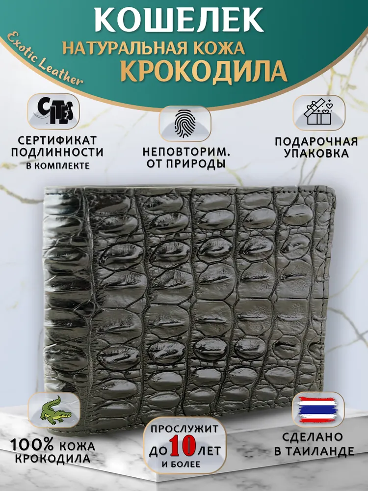 Классический мужской кошелек из натуральной кожи крокодила (хвостовая часть) станет по-настоящему модным и оригинальным подарком для любого современного мужчины. Кошелек отличается приятной мелкой фактурностью и лаконичным внутренним содержанием. Изнутри используется натуральная телячья кожа. Обращаем ваше внимание, что, в силу природных особенностей, изделия из экзотической кожи по фактуре своей кожи, существует в единственном экземпляре, поэтому доставленный вам кошелек из крокодила может отличаться от представленного на этих фотографиях, но модель и цвет будут максимально выдержаны. - 2 отделения для купюр - 6 карманов для пластиковых карт - 4 потайных кармана Страна производства: Таиланд