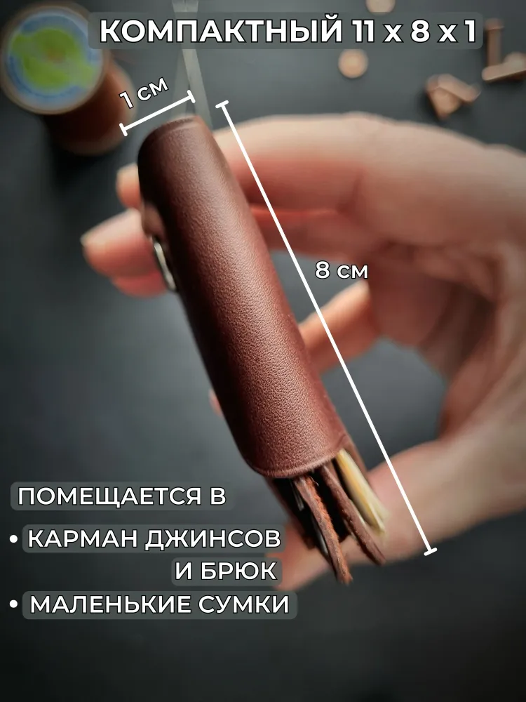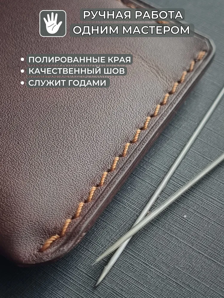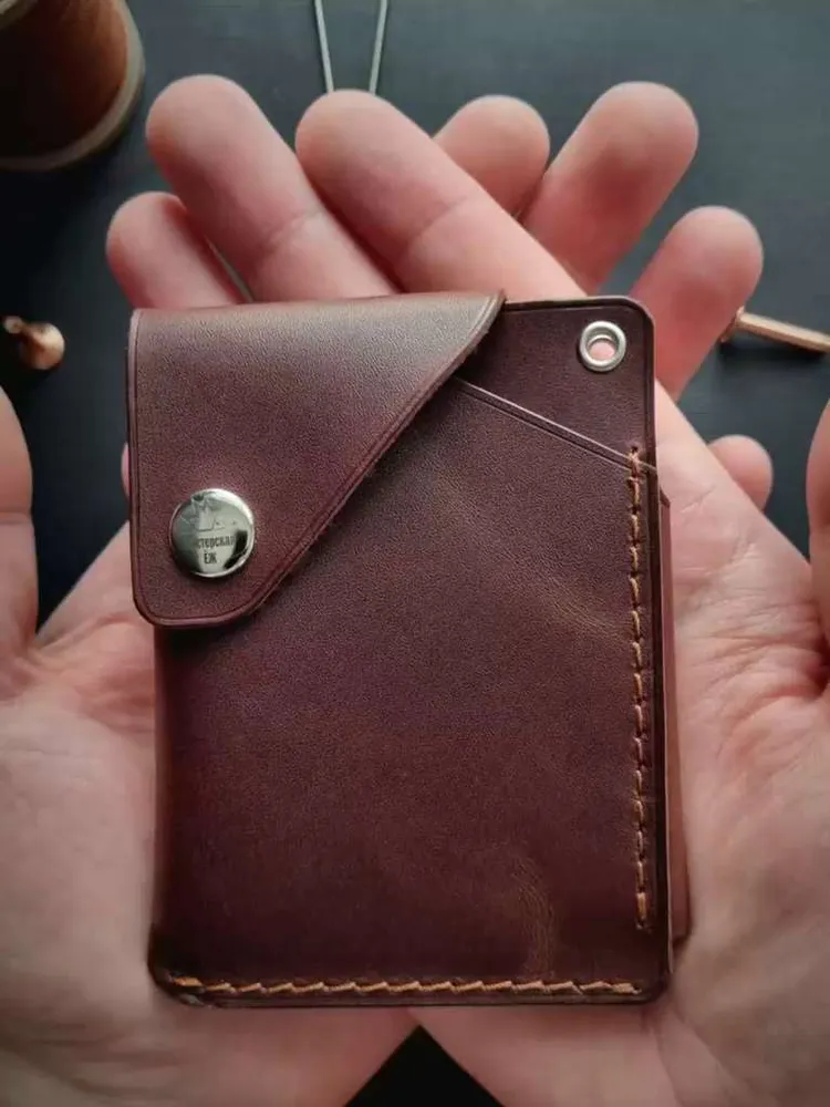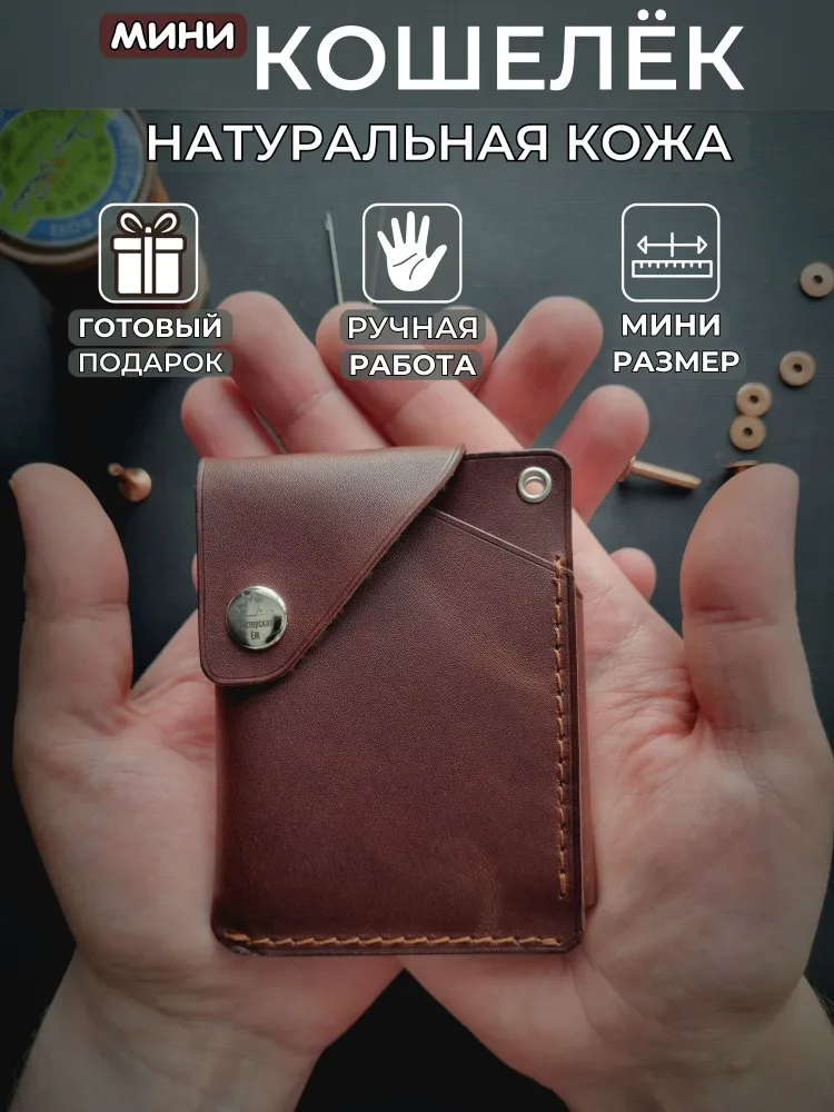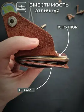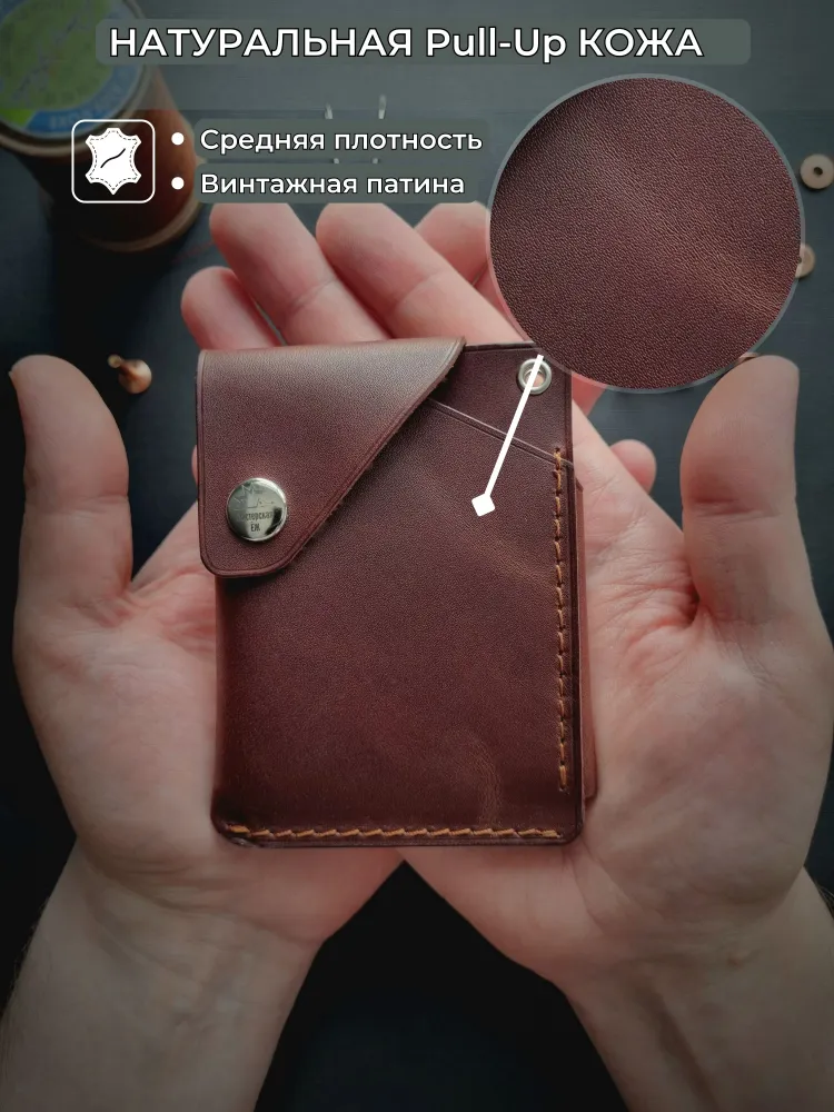 Мини-кошелек (картхолдер) коричневый из натуральной кожи Pull-Up, ручная работа Элегантный коричневый кошелек из натуральной кожи Pull-Up с лёгкой патиной подчеркнёт ваш стиль и индивидуальность. Компактный и удобный, этот кожаный картхолдер ручной работы вместит банковские карты, визитки и купюры, сохраняя их в порядке. Подходит как мужчинам, так и женщинам, будет уместен в деловом, повседневном и подарочном формате. Натуральная кожа Pull-Up Красивый натуральный оттенок и мягкость, лёгкий винтажный эффект. Ручная работа Сделан вручную одним мастером, с вниманием к каждой детали. Компактность и вместительность Вмещает до 10 карт и купюры, при этом легко помещается в карман. Универсальный стиль Подходит мужчинам и женщинам, гармонично дополняет любой образ. Долговечность Торцы отполированы воском вручную, кожа устойчива к износу. Коричневый кошелек Pull-Up — надёжный аксессуар на каждый день Выбирайте аксессуар, который со временем становится только лучше и рассказывает вашу историю.