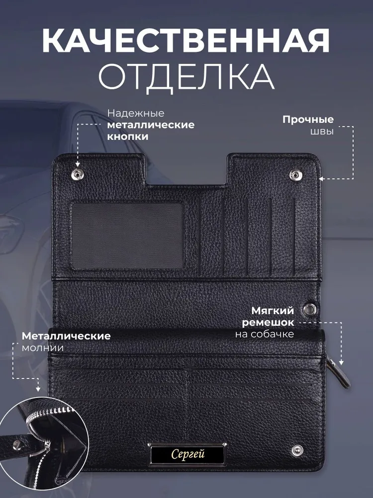 Мужской кошелёк – стильный и вместительный аксессуар, который дополнит любой образ мужчины. Клатч портмоне мужской выполнен из качественной мягкой ЭКО кожи, которая не трескается и прослужит не один год. Кошелёк мужской имеет отделение на кнопках для кредитных, дебетовых или скидочных карт. Во втором отделение на молнии можно носить автодокументы, паспорт, телефон, купюры, мелочь, а также повэрбанк. Мужское портмоне для документов и денег в классическом стиле отлично дополнит любой образ: деловой, повседневный или спортивный. Кошелёк имеет небольшой размер, поэтому удобно и комфортно держать в руке. Такой мужской клатч станет отличным подарком мужчине, папе, другу, дедушке, дяде на Новый год, 23 февраля, день рождения, 14 февраля, юбилей.