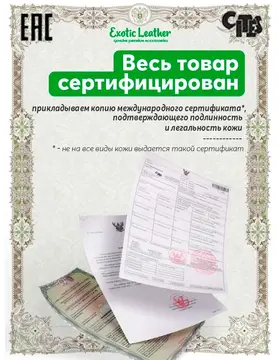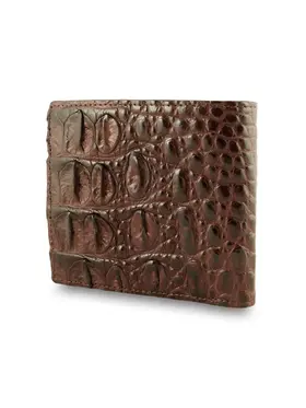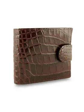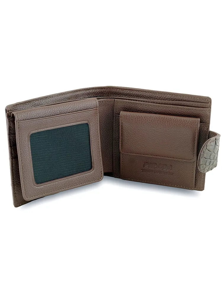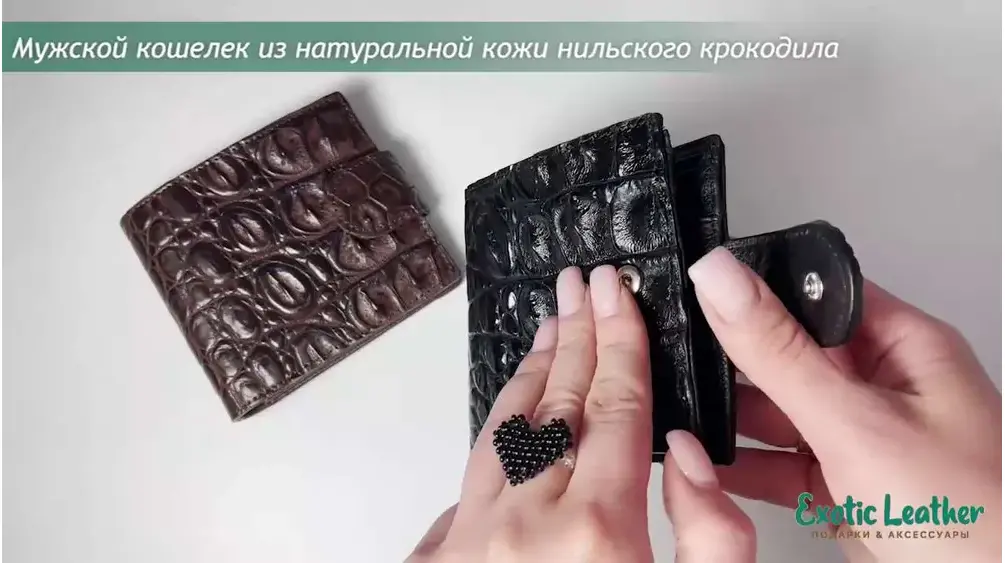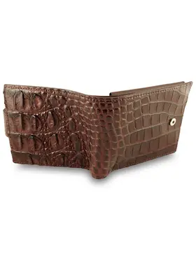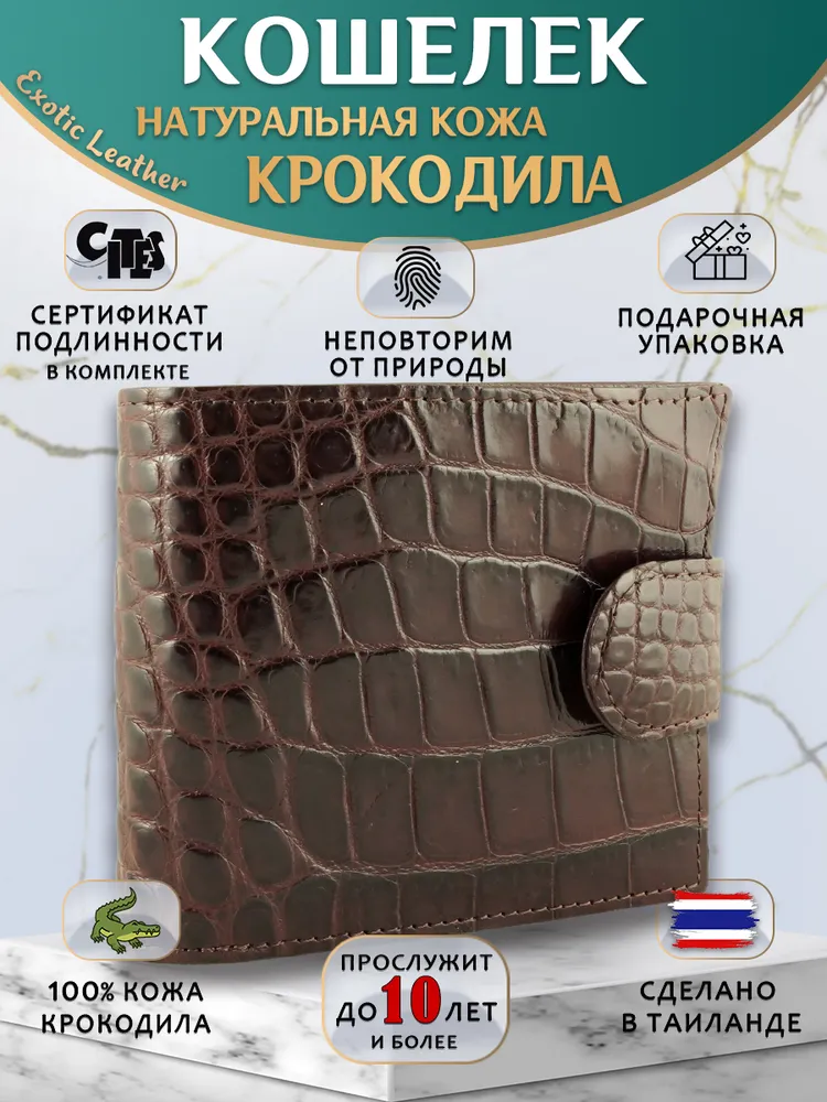 Мужской бумажник из настоящей кожи крокодила темно-коричневого цвета станет настоящим украшением и верным помощником любого современного мужчины. Бумажник выполнен из целиковой шкурки нильского крокодила (Crocodylus niloticus), с его спинки переходящей через бочки к брюху. Поэтому на лицевой стороне он имеет гладкую кожу, а далее небольшую фактурность. Бумажник имеет монетницу и закрывается на хлястик на кнопке. Для внутренней отделки используется высококачественная натуральная кожа. - 2 отделения для купюр, - 1 отделение на молнии, - 3 кармашка для пластиковых карт, - 2 скрытых кармашка, - 2 кармашка с прозрачным окошком, - монетница на кнопке. Страна производства: Таиланд Обращаем ваше внимание, что в силу натуральности применяемых материалов, данные изделия не могут существовать в нескольких абсолютно одинаковых экземплярах, а значит доставленное вам изделие будет отличаться по внешнему виду, фактуре и рисунку кожи от представленных на фотографиях на этом сайте. Но модель, цвет и функциональное наполнение будут максимально выдержаны. Натуральная кожа крокодила (каймана, аллигатора) является уникальным природным материалом с выдающимися характеристиками. Кроме того, что она считается одной из самых красивых и престижных, она еще отличается и своею прочностью и долговечностью. При том, что изделия из натуральной кожи крокодила признаются большинством как атрибут только для богатых, мы постарались сделать их доступными максимальному количеству россиян. Мы гарантируем, что все наши изделия изготовлены из настоящей натуральной кожи, заявленной в описании к данному товару. Легальность происхождения кожи подтверждается приложенным сертификатом. В профиле нашего бренда вы сможете найти большой ассортимент модных и стильных аксессуаров из натуральной экзотической кожи, некоторые из которых вы не найдете больше нигде в России (а иногда и в мире).