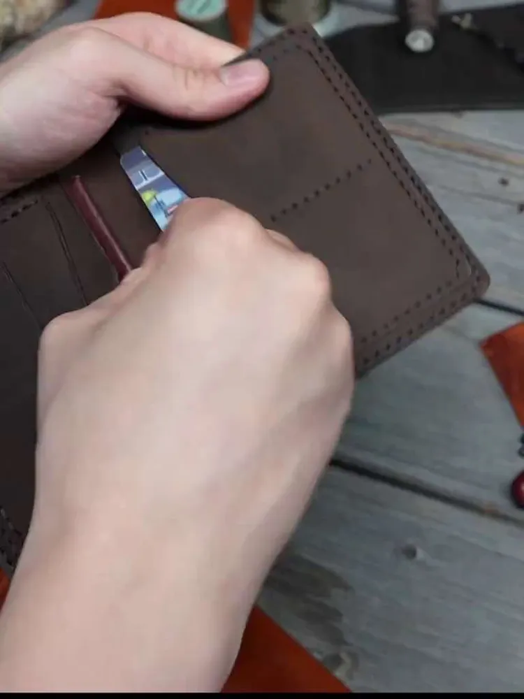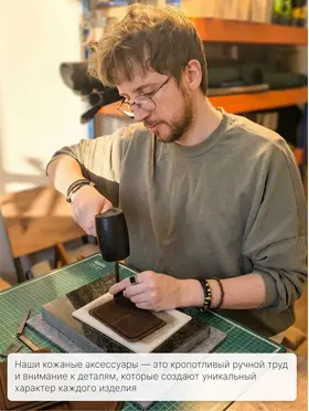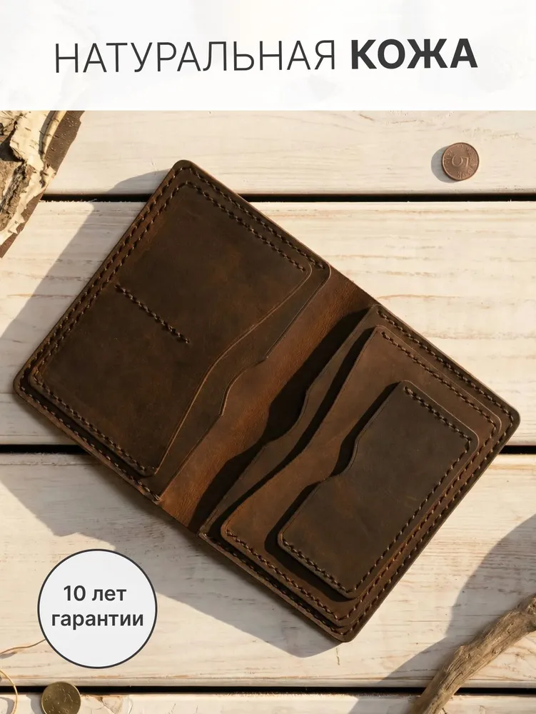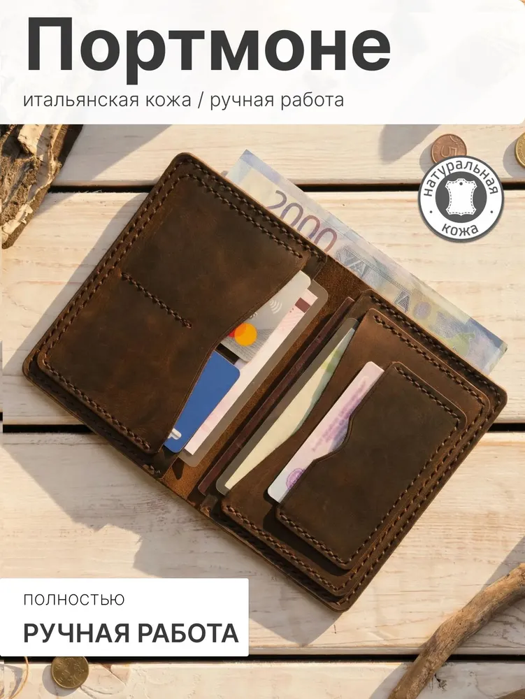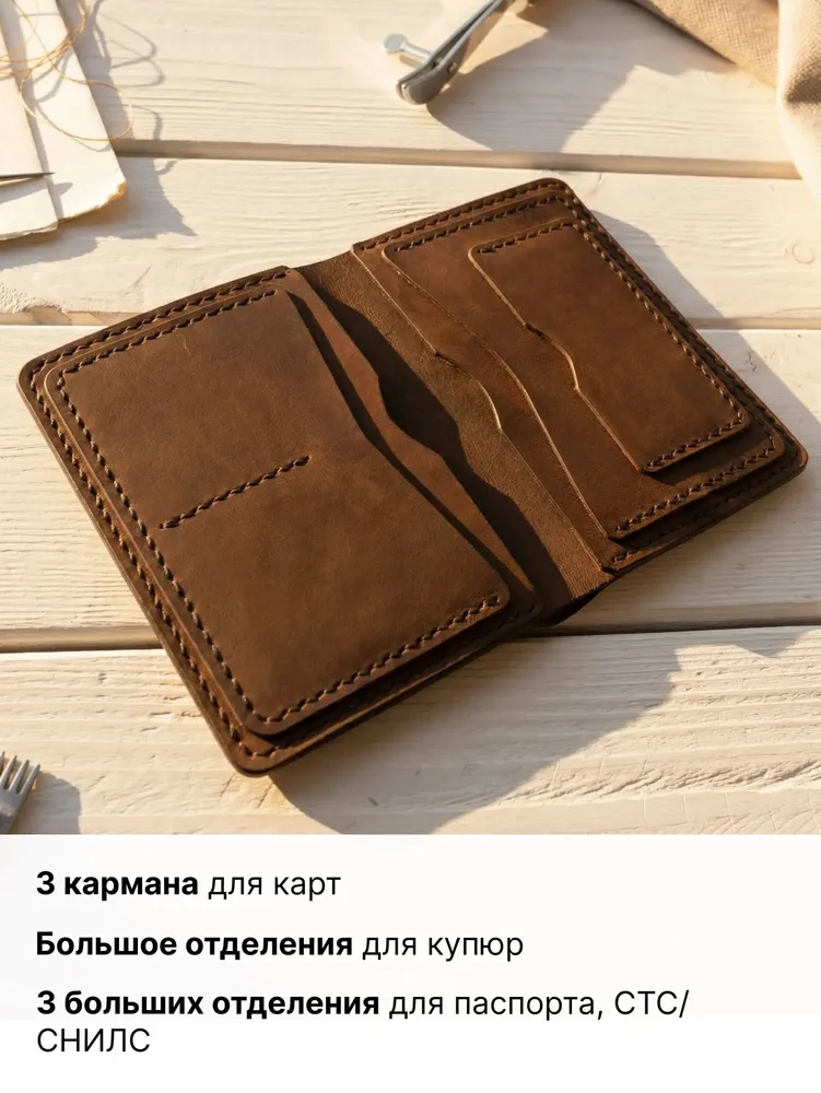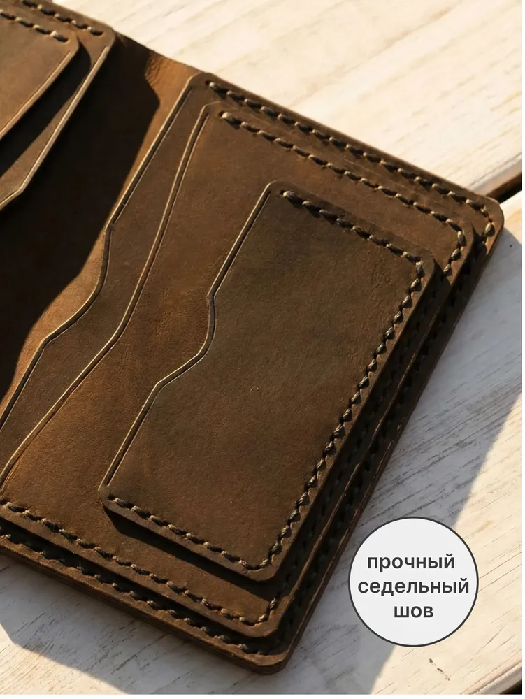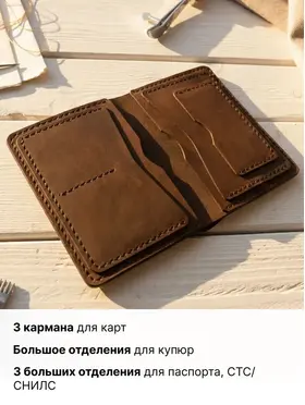 Совершенство в каждой детали Представляем эксклюзивный бумажник ручной работы из натуральной кожи Crazy Horse премиум-класса.Этот стильный аксессуар доступен в четырёх элегантных цветах: благородном зелёном хаки, сдержанном сером, классическом чёрном и глубоком синем. Каждый бумажник - произведение искусства, созданное с любовью и вниманием к деталям нашими талантливыми мастерами. Благодаря уникальному подходу, когда один мастер создает изделие от начала до конца, каждый аксессуар обретает неповторимый характер и душу. Изящество и надежность Для изготовления бумажников мы используем только лучшую плотную воловью кожу Crazy Horse, которая имеет особый эффект патины. Со временем кожа приобретает благородный оттенок в местах частого прикосновения и сгибов, что придаёт изделию винтажный шарм и ощущение богатой истории. Наши мастера работают исключительно с ручными инструментами, такими как шило, нож, пробойники, киянка и иглы, чтобы создать настоящий шедевр. Каждый стежок выполнен сверхпрочным седельным швом, который практически невозможно разорвать, обеспечивая долговечность и надёжность изделия. Лучший спутник в самых разных ситуациях Наш элегантный кожаный бумажник - ваш идеальный спутник! Ручная работа из отборной кожи Crazy Horse гарантирует уникальность и долговечность. Стильный дизайн и компактность позволяют носить его незаметно во внутреннем кармане пиджака. Побалуйте себя роскошью ручной работы - закажите бумажник прямо сейчас! Количество ограничено. Характеристика - Натуральная воловья кожа «Крейзи Хорс» (Crazy Horse Leather) - Полностью ручная работа - в том числе и прошивка - Отделение для купюр; - Отделения для прав и карточек; - Отделение для Свидетельства о регистрации ТС и сложенной страховки Размеры: 14*11 см в закрытом состоянии Вес: 133 г