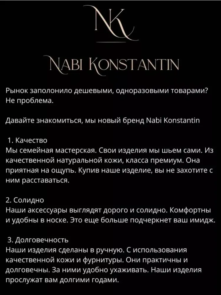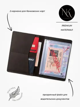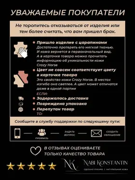 Nabi Konstantin – семейная мастерская кожаных изделий. Уже много лет мы создаем эксклюзивные изделия премиум класса. Только ручная работа, выполненная из натуральной кожи. В каждое изделие вложена энергия мастера! Бумажник для документов продуман до мелочей: 2 отдела для банкнот и паспорта, 2 кармана для банковских карт, 1 карман под снилс, прозрачный файл для водительских документов. Данная модель идет в 6 цветах. Для любителей классики подойдет изделие в черном цвете из кожи флотер. А для ценителей эксклюзива изделие в цвете из турецкой кожи Крэйзи Хорс. Данный аксессуар органайзер идеальный подарок для настоящего мужчины! Портмоне из натуральной кожи мужской и женский отлично подойдет как подарок любимому, подруге, девушке, коллеге, коллегам, маме, на юбилей, дочери или сыну. Портмоне женское из натуральной кожи подойдет в качестве подарка любимой жене на 8 марта, день рождения, новый год, день влюбленных, день свадьбы. Кошелек мужской и женский. Мужское портмоне для автодокументов продумано до мелочей. Портмоне мужской и женский из натуральной кожи станет стильным аксессуаром в вашем гардеробе. Портмоне ручной работы, поэтому партия ограничена. Спешите купить по-настоящему качественное изделие по доступной цене!