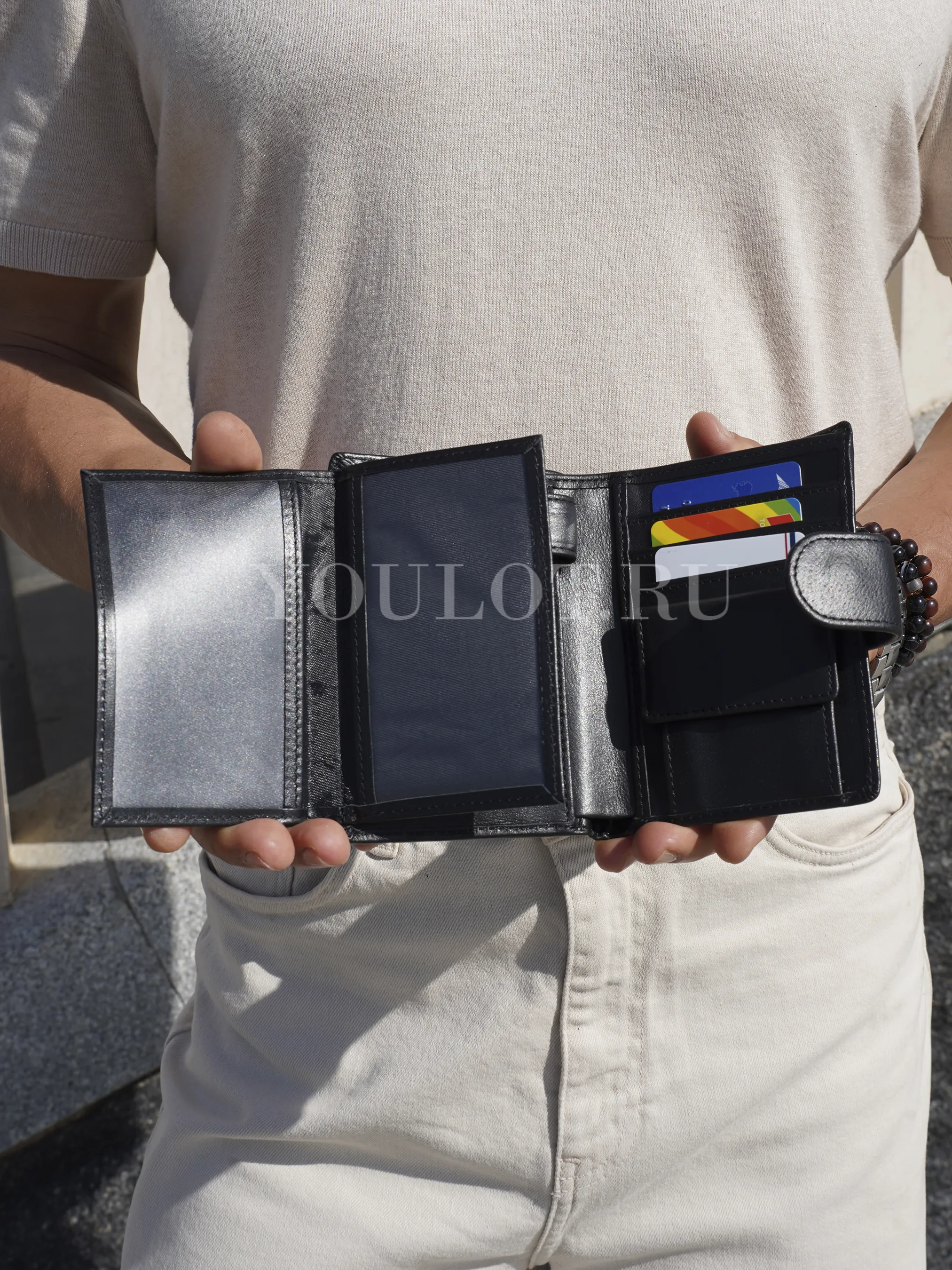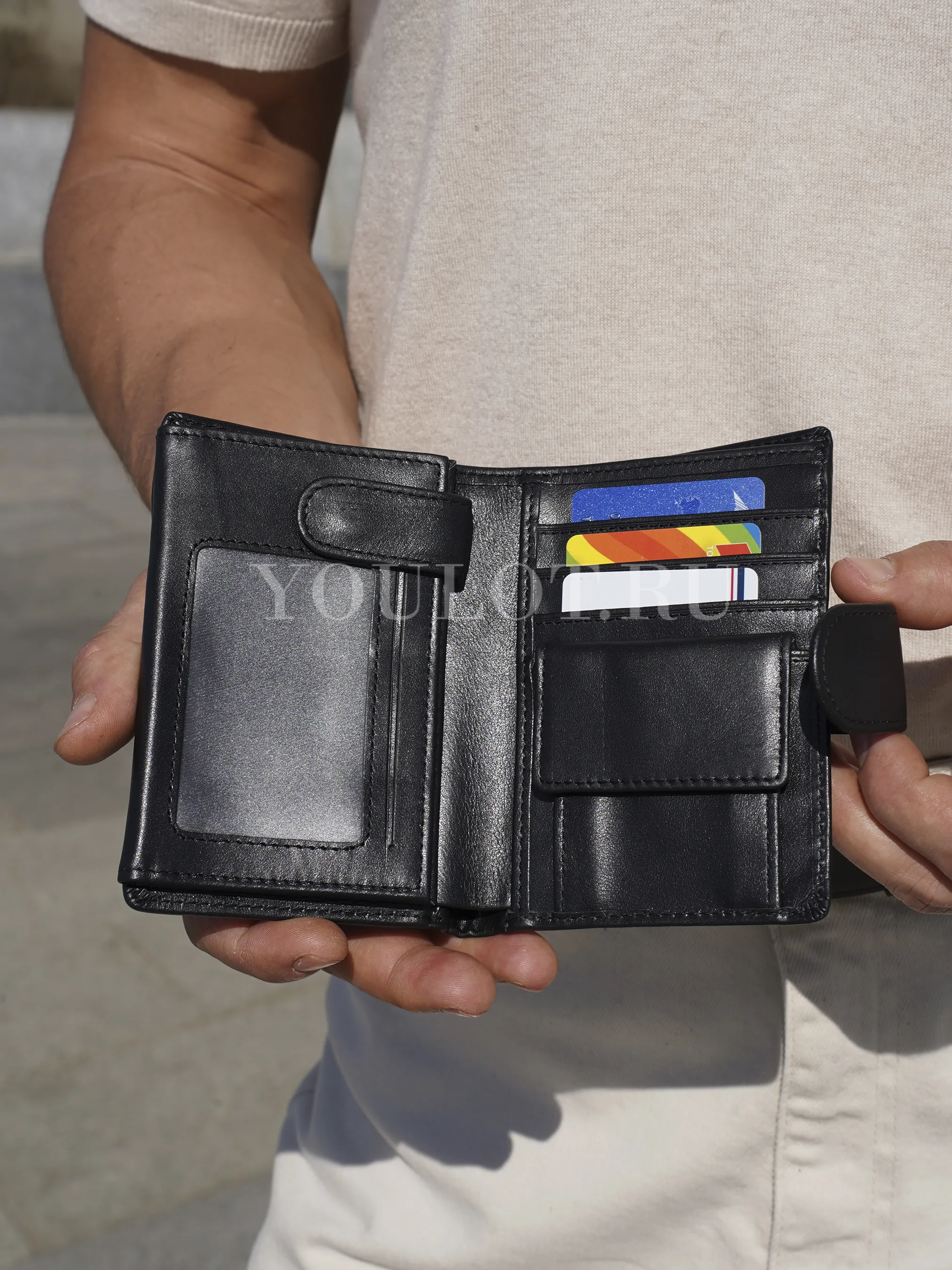 три кармана с прозрачными окошками — удобно для водительского удостоверения, пропуска или фотографий,