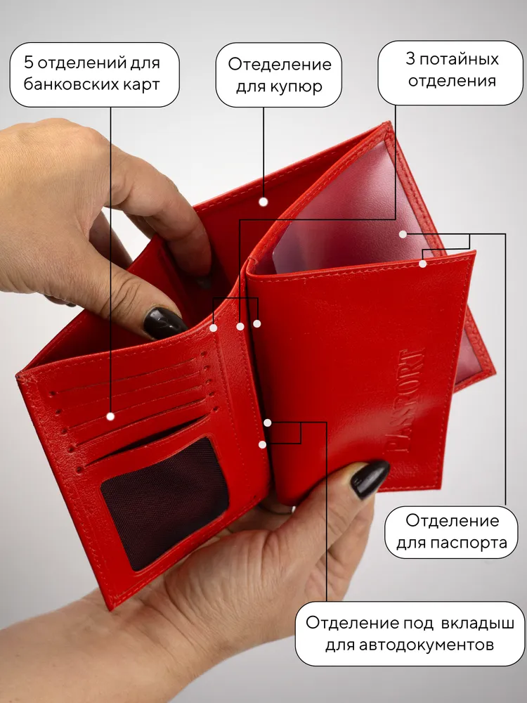 Качественное портмоне для автомобильных документов и паспорта РФ от бренда «Barsalini Land» с большим отделением для денег, вмещающим в себя до 50 купюр, станет незаменимым аксессуаром для каждого водителя. Простой и удобный органайзер без застежки наведет и сохранит порядок в ваших бумагах. Внутри вместительного лопатника из натуральной премиум кожи расположено 5 удобных кармашков для визиток, кредиток, банковских карт и дисконтных карточек, один из них сетчатый - под водительское или фото, также есть 3 потайных кармана для особо важных вещей. В комплекте с мужской или женской автообложкой идет прочный прозрачный вкладыш для автодокументов. В автовкладыш поместится страховой полис ОСАГО, СНИЛС, 4 свидетельства СТС, ОМС, права, лист формата А5 для страховки в сложенном виде. Кожаная документница – паспортница упакована в подарочную коробку – упаковку и подходит как для мужчин, так и для женщин. Чехол - книжку можно удобно разместить в бардачке автомобиля или взять с собой в сумке или кармане – компактное изделие не займет много места. Элементы дизайна кошелька продуманы до мелочей и отвечают всем требованиям современных автовладельцев – корочка отлично защитит от повреждений, влаги, загрязнений, сохранив его в идеальном состоянии на протяжении долгого времени. Позаботьтесь о своих авто документах так же, как вы заботитесь о своей машине! Этот брендовый автоаксессуар – бумажник от Барсалини Ленд будет служить долгие годы эксплуатации транспортного средства. Мы сами производим товары, которые продаем, поэтому можем предложить высокое качество по доступной цене. Ваша удачная покупка – наша большая победа!