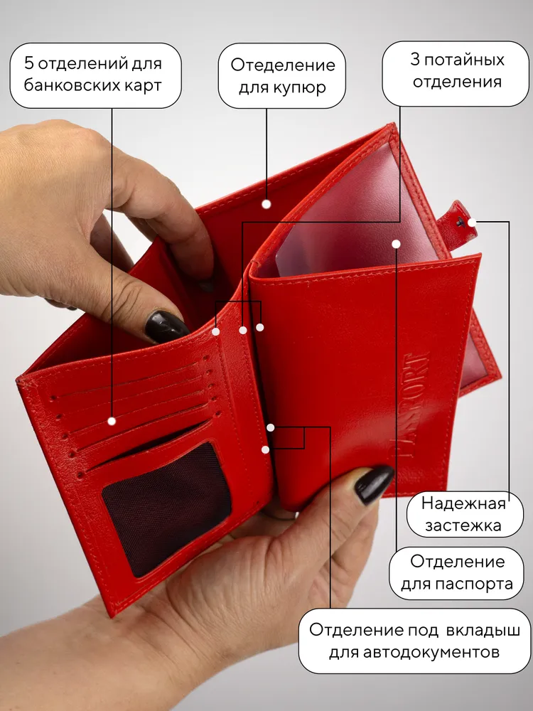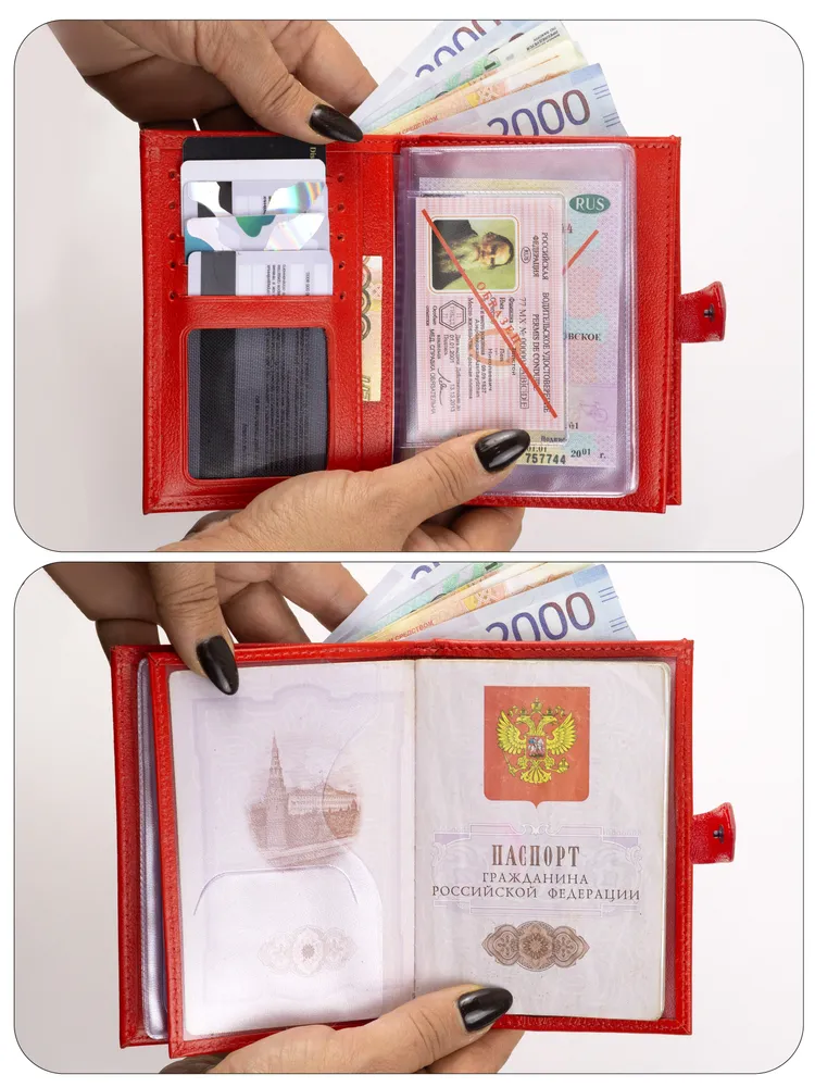 Качественное портмоне для автомобильных документов и паспорта РФ от бренда «Barsalini Land» с большим отделением для денег, вмещающим в себя до 50 купюр, станет незаменимым аксессуаром для каждого водителя. Простой и удобный органайзер с застежкой на кнопке наведет и сохранит порядок в ваших бумагах. Внутри вместительного лопатника из натуральной премиум кожи расположено 5 удобных кармашков для визиток, кредиток, банковских карт и дисконтных карточек, один из них сетчатый - под водительское или фото, также есть 3 потайных кармана для особо важных вещей. В комплекте с мужской или женской автообложкой идет прочный прозрачный вкладыш для автодокументов. В автовкладыш поместится страховой полис ОСАГО, СНИЛС, 4 свидетельства СТС, ОМС, права, лист формата А5 для страховки в сложенном виде. Кожаная документница – паспортница упакована в подарочную коробку – упаковку и подходит как для мужчин, так и для женщин. Чехол - книжку можно удобно разместить в бардачке автомобиля или взять с собой в сумке или кармане – компактное изделие не займет много места. Элементы дизайна кошелька продуманы до мелочей и отвечают всем требованиям современных автовладельцев – корочка отлично защитит от повреждений, влаги, загрязнений, сохранив его в идеальном состоянии на протяжении долгого времени. Позаботьтесь о своих авто документах так же, как вы заботитесь о своей машине! Этот брендовый автоаксессуар – бумажник от Барсалини Ленд будет служить вам долгие годы эксплуатации транспортного средства. Мы сами производим товары, которые продаем, поэтому можем предложить высокое качество по доступной цене. Ваша удачная покупка – наша большая победа!, которые продаем, поэтому можем предложить высокое качество по доступной цене. Ваша удачная покупка – наша большая победа!