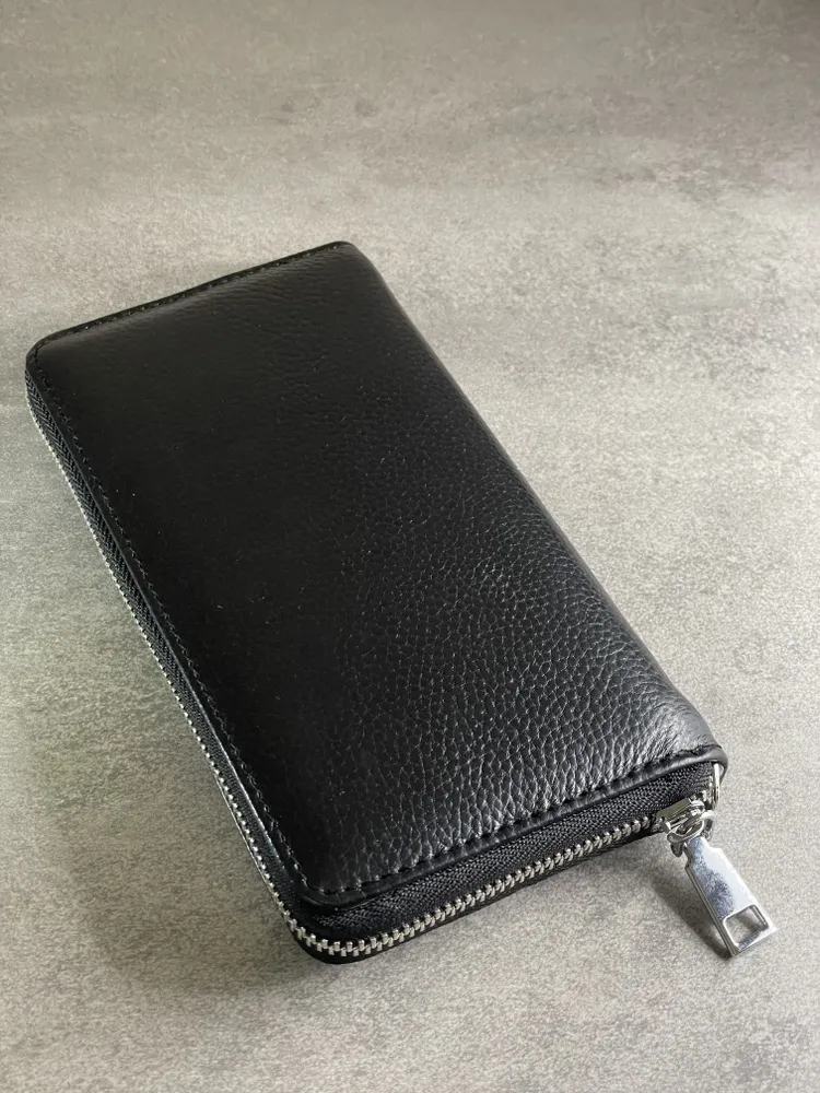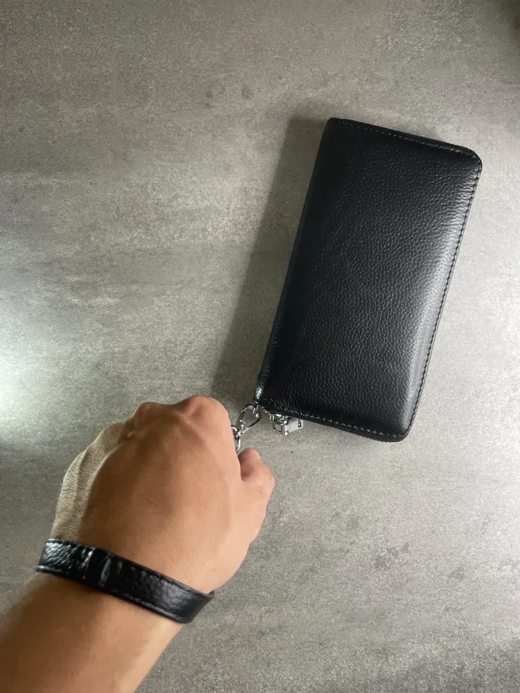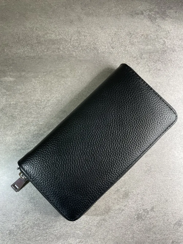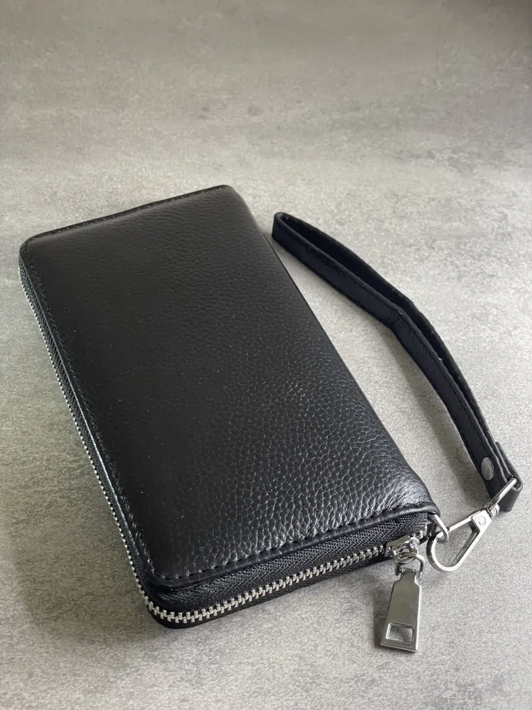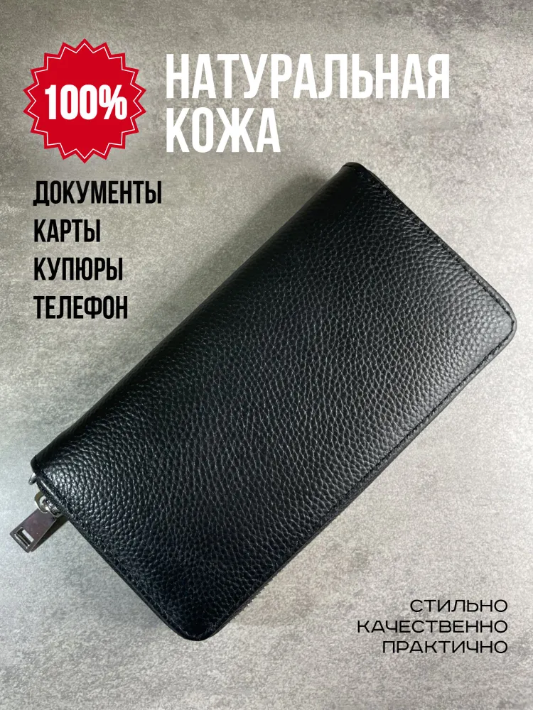 Портмоне из натуральной кожи Настоящее портмоне должно быть только из натуральной кожи. У нас именно такое. Это база: кожа, черный цвет, молния, съемный ремешок. Поместится всё, что нужно Внутри портмоне много отделений. Поместятся пластиковые карточки, водительское удостоверение, паспорт, СТС, денежные купюры, мелочь. Даже телефон, если он не слишком большой. И повторим: это 100% натуральная кожа!