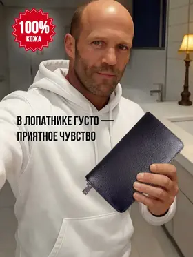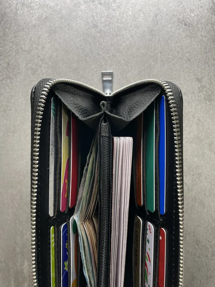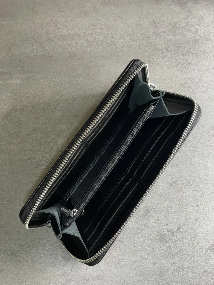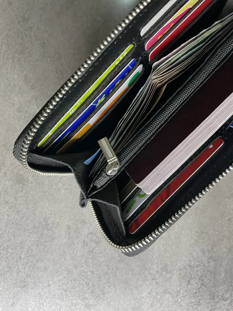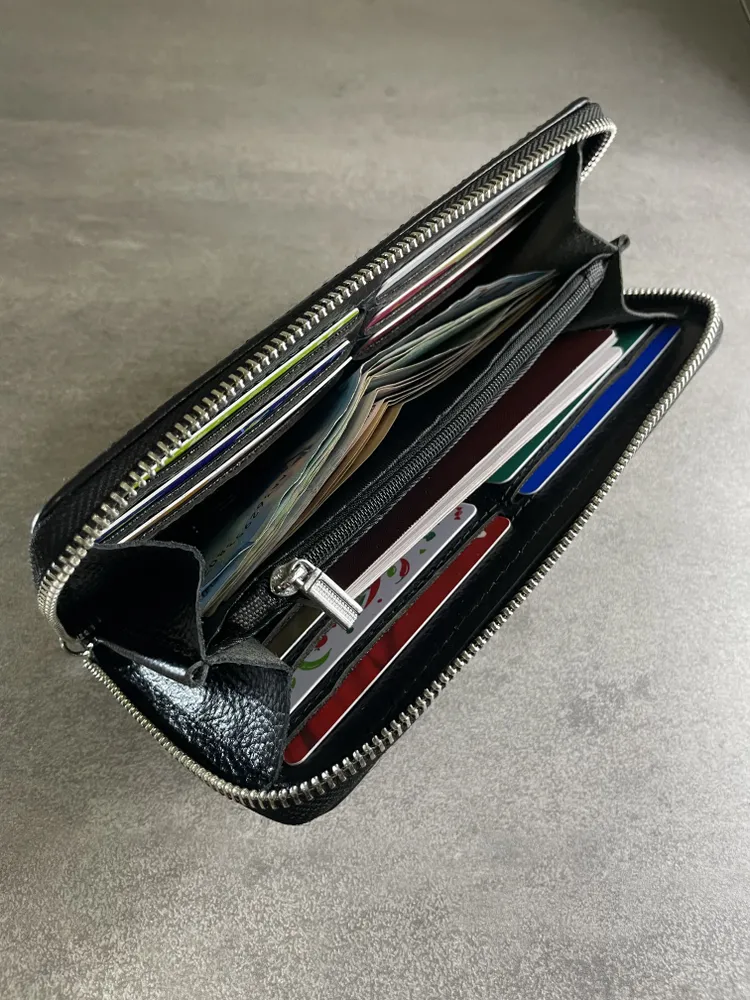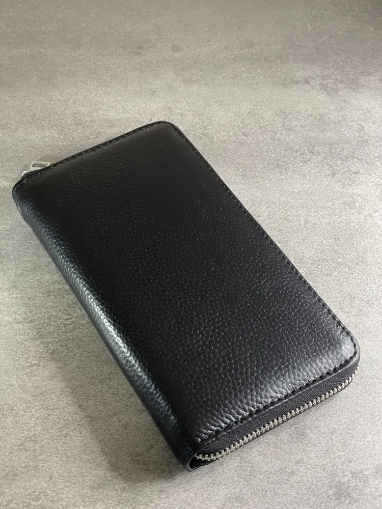 Портмоне из натуральной кожи Настоящее портмоне должно быть только из натуральной кожи. У нас именно такое. Это база: кожа, черный цвет, молния, съемный ремешок. Поместится всё, что нужно Внутри портмоне много отделений. Поместятся пластиковые карточки, водительское удостоверение, паспорт, СТС, денежные купюры, мелочь. Даже телефон, если он не слишком большой. И повторим: это 100% натуральная кожа!
