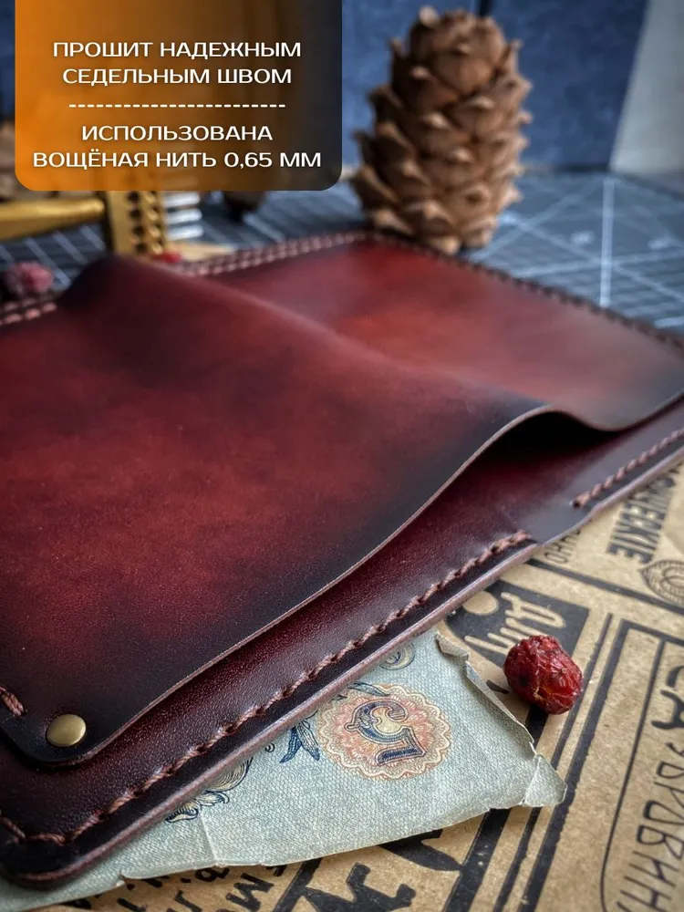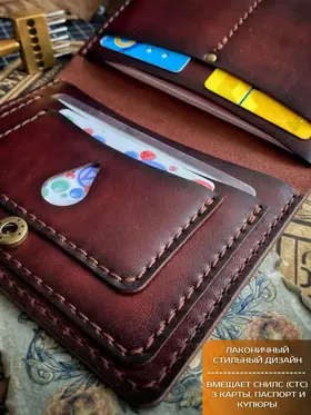 Обложка из натуральной кожи для документов и паспорта ручной работы от бренда YaGuAr - это престижный и практичный аксессуар, который сочетает в себе изысканный дизайн и высокую функциональность. Эта обложка выполнена из качественной натуральной кожи, которая сохраняет естественный, характерный для нее, рисунок. Кожа не тронута глаженьем, шлифовкой и тиснением, поэтому можно смело сказать, что она остается живой, и вы можете заметить следы оставшиеся при жизни животного - шрамы, укусы насекомых и другое. Каждое изделие из кожи является уникальным, поскольку нет одинаковых животных с одинаковой структурой кожи. Ручная работа мастера придает докхолдеру уникальность и индивидуальный характер. Обложка YaGuAr предназначена для хранения важных документов и паспорта, обеспечивая их защиту от потерь и повреждений. Её размеры и форма адаптированы под стандартные размеры документов, что делает её универсальной для использования в любой ситуации. Обложка имеет размер 145*110 мм. Имеет: ~ 2 отдела под паспорт ~ Отдел под СНИЛС или СТС. ~ 3 отдела под карты (максимально 7 карт) ~ 1 отдел под купюры. Докхолдер тонирован (пропитан восками) исключительно вручную. Выбор обложки из натуральной кожи от YaGuAr это не только способ сохранить ваши документы в безопасности, но и возможность добавить элегантности и стиля к вашему образу. От партии к партии оттенок кожи может отличаться. Сделано в России.