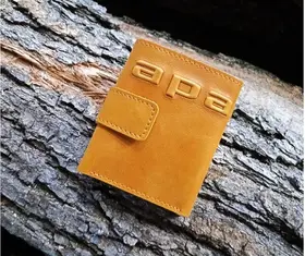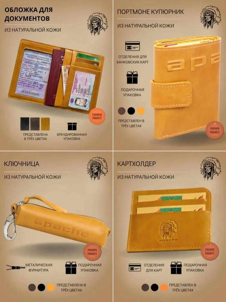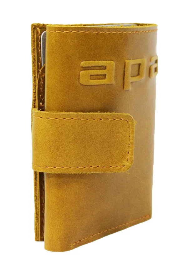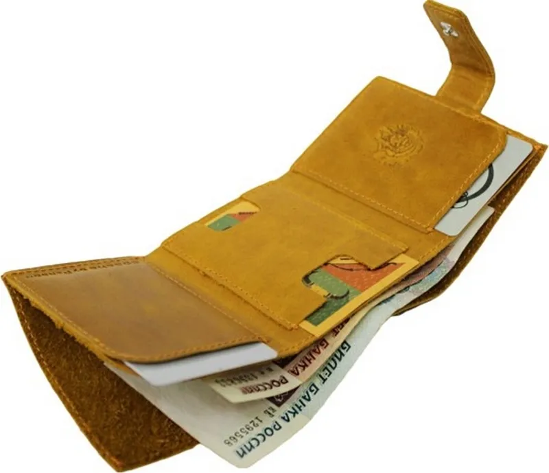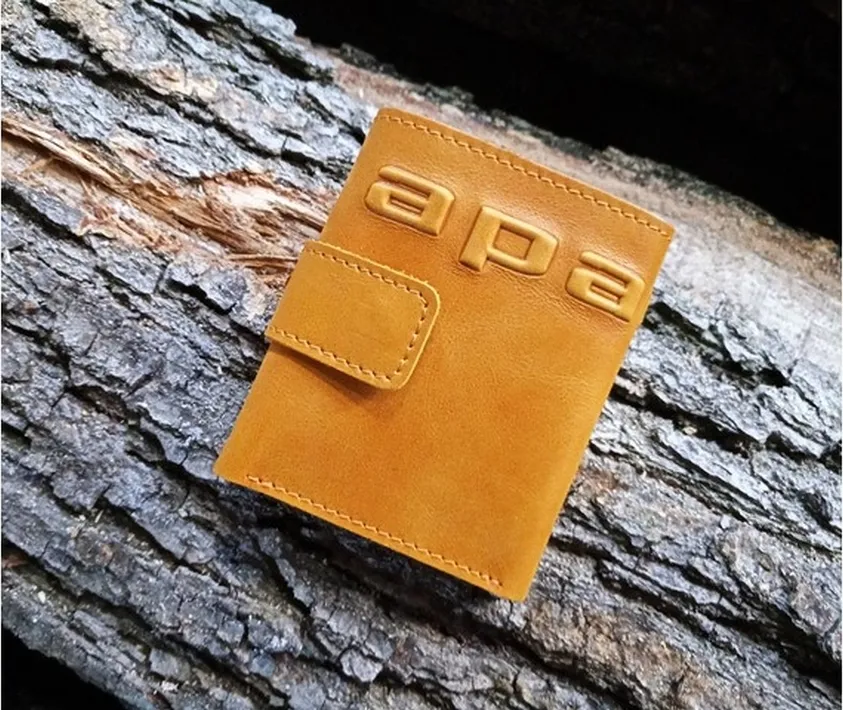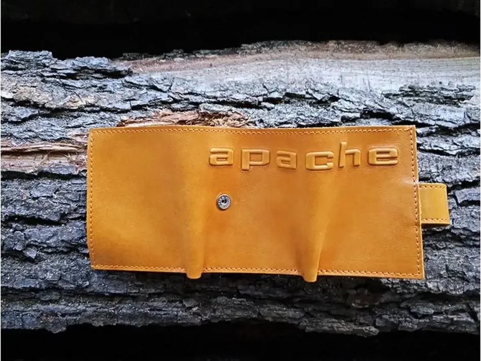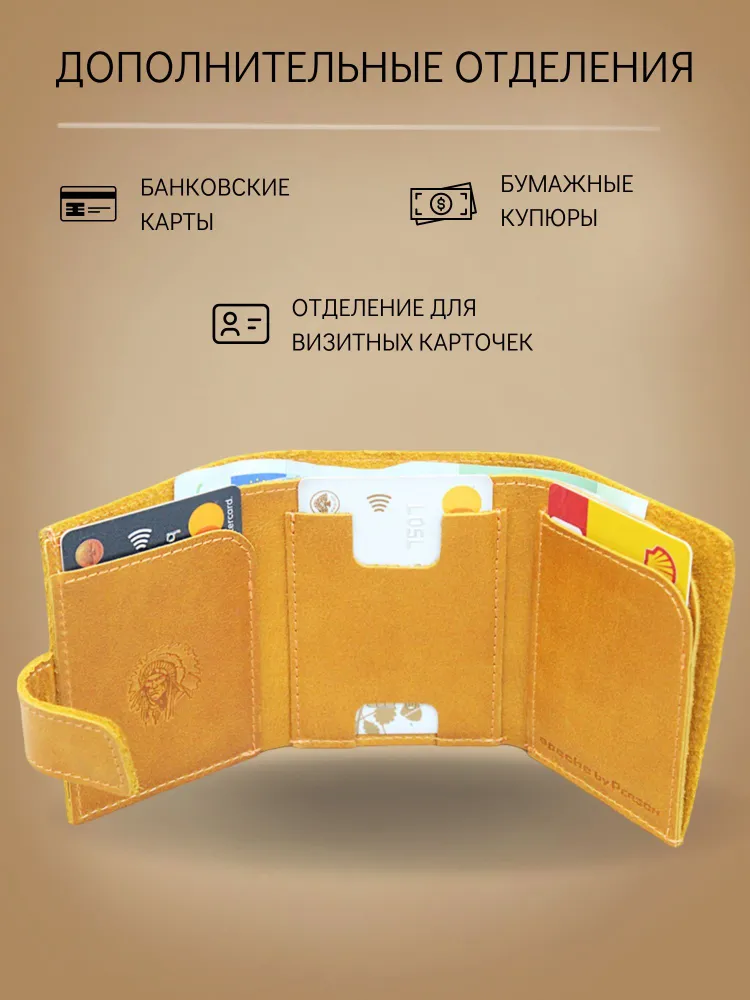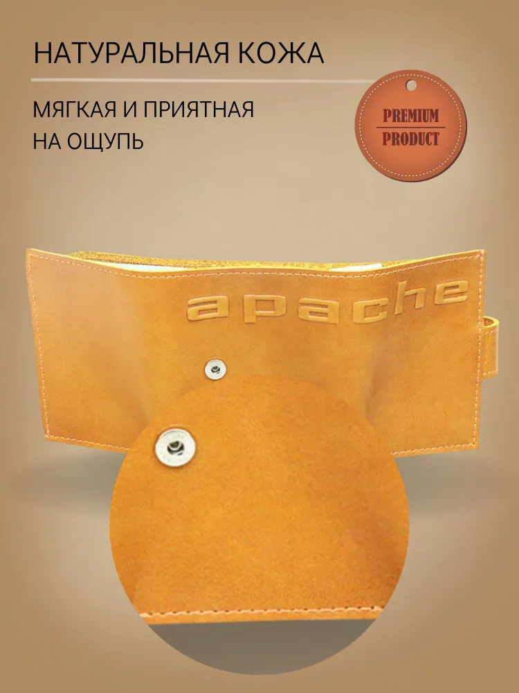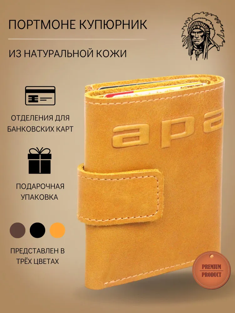 Портмоне купюрник кожаный МП-А табачно-желтый Apache Купюрник мужской и женский выполнен из натуральной кожи. Украшен тиснением с логотипом бренда. Внутри бумажника одно отделение для купюр, три кожаных фигурных кармана для кредитных карт. Складывается в три сложения. Закрывается портмоне из натуральной кожи на хлястик с кнопкой. Упакован в дизайнерскую коробку из плотного картона. Практичный и хороший подарок для папы, дедушки, мужа, мамы, брата, коллеги или партнёра на 23 февраля, День Рождения и Новый год!